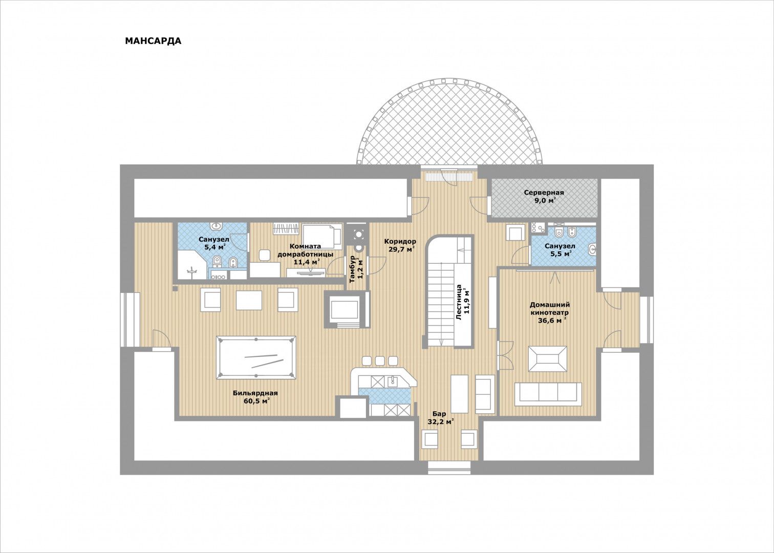 мансарда: бильярдная, барная зона, домашний кинотеатр, спальня с санузлом, общий санузел, коридор, серверная, тамбур, лифт