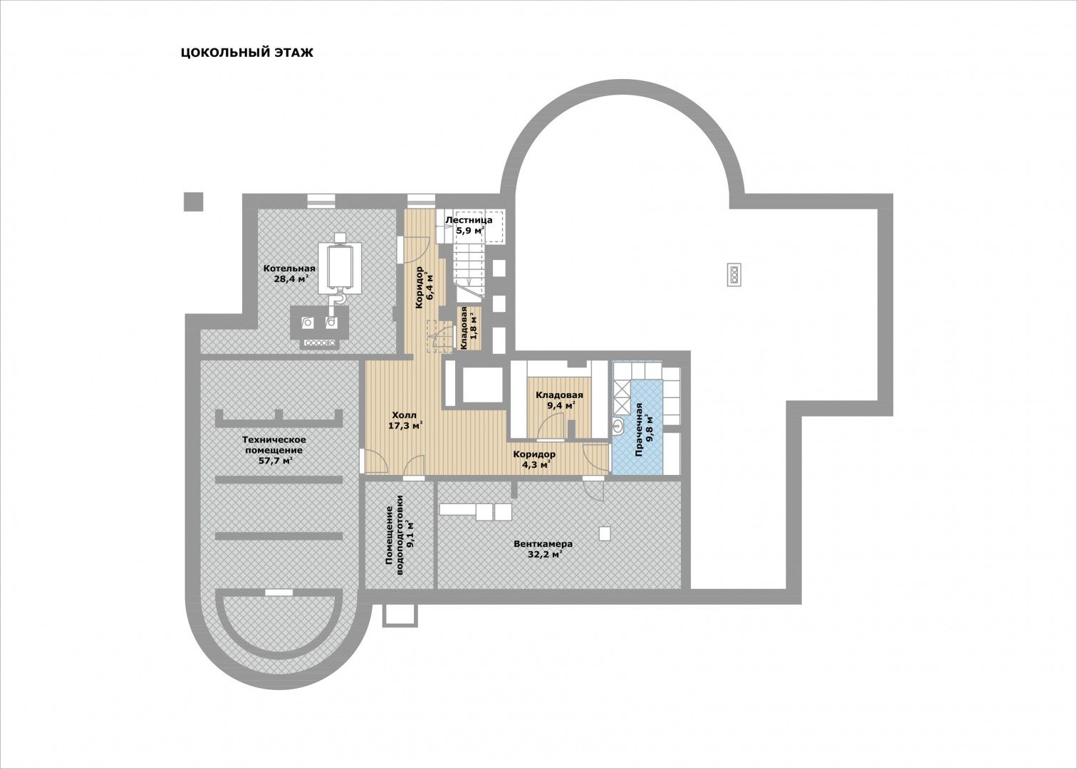 цоколь: помещение водоподготовки и венткамера, котельная, прачечная, две кладовые, техническое помещение бассейна