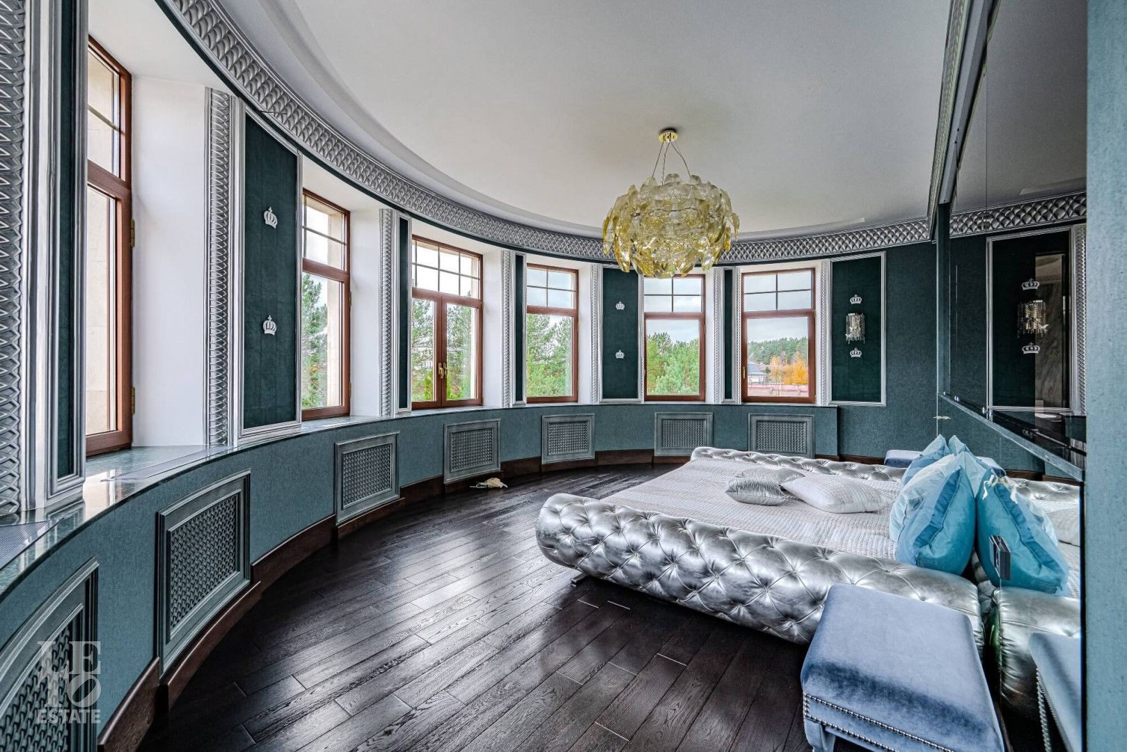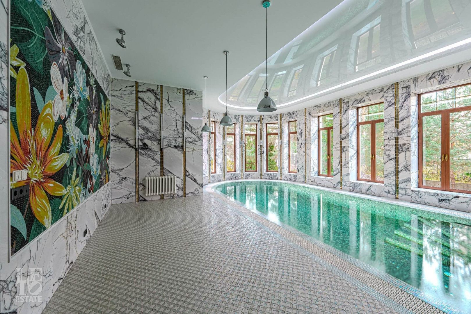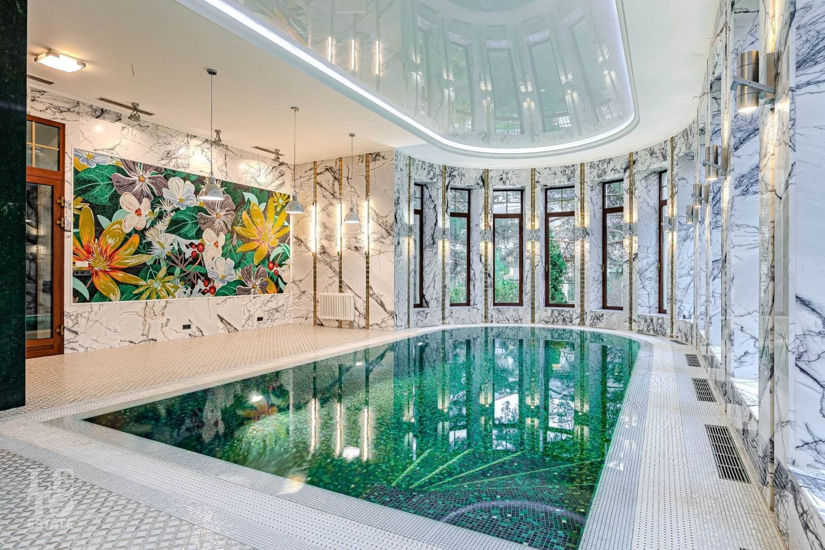 Особенности: высокие потолки (до 4 м), бассейн и хаммам, лифт, домашний кинотеатр и бар, антикварные элементы декора, в отделке 17 сортов мрамора, гараж на 2 машины, блок персонала 112 кв. м.