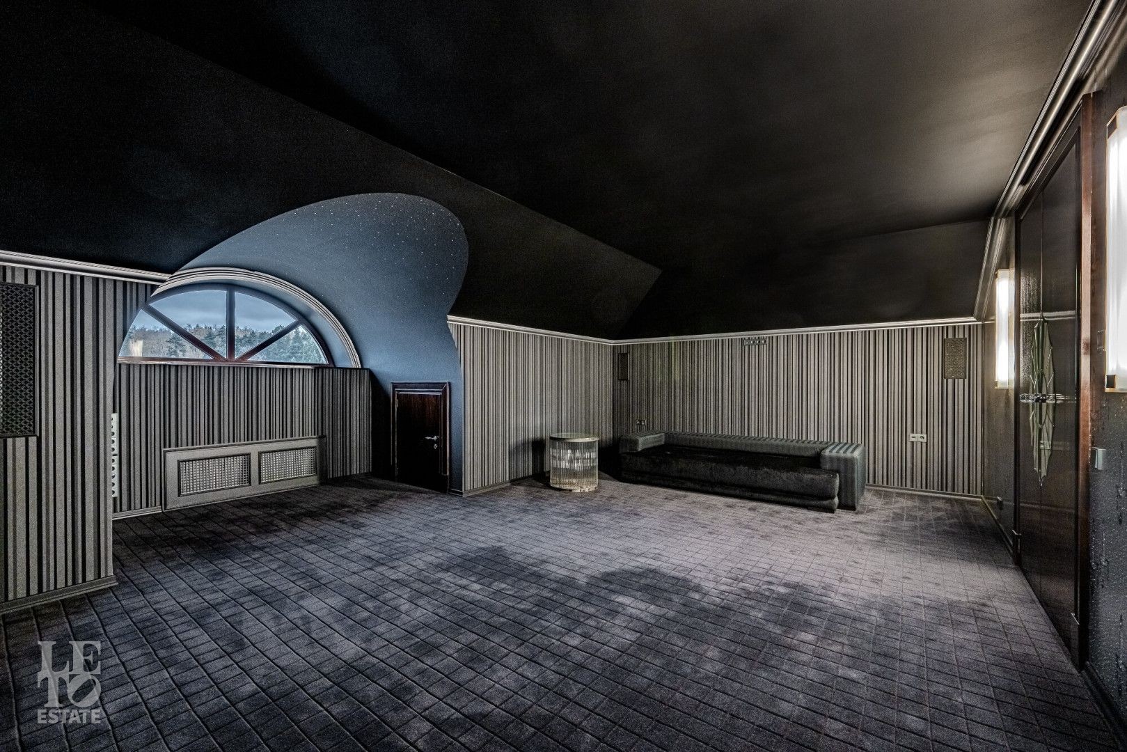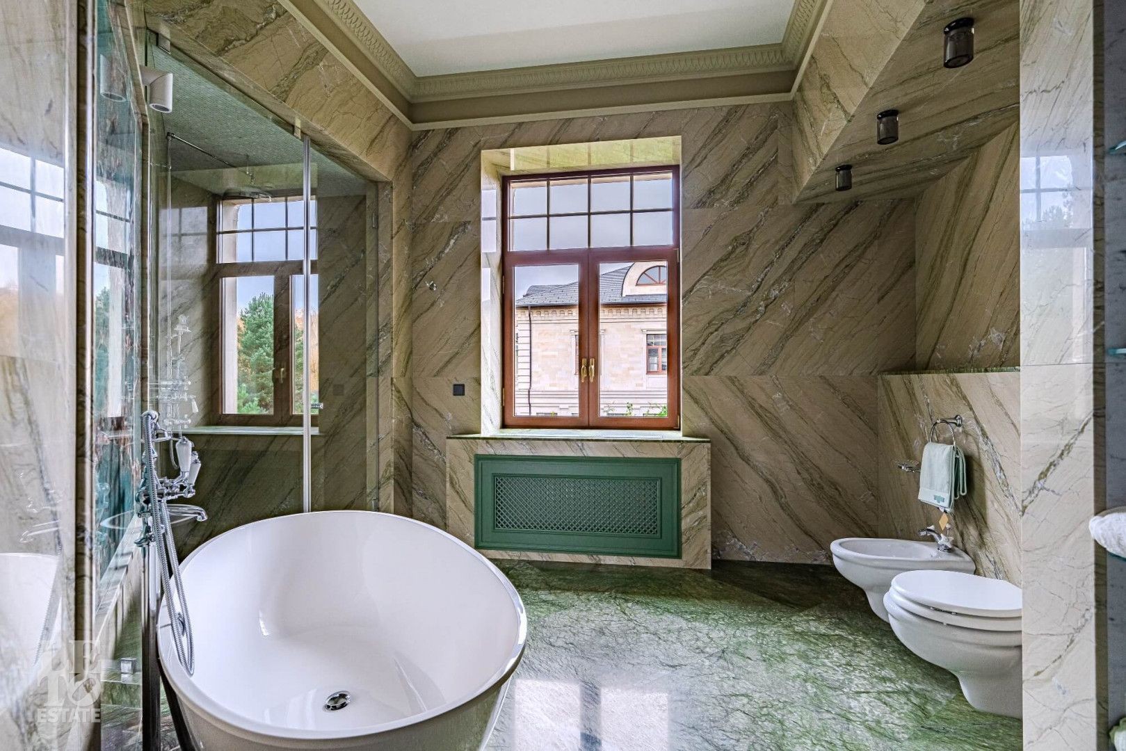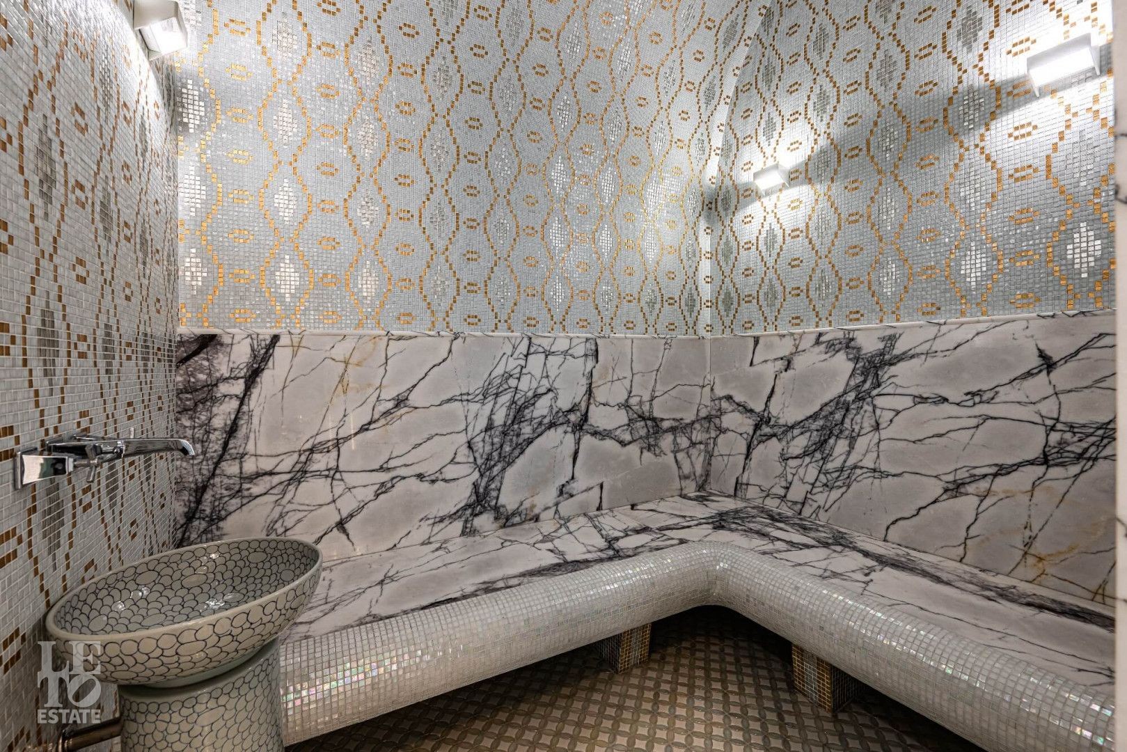 Особенности: высокие потолки (до 4 м), бассейн и хаммам, лифт, домашний кинотеатр и бар, антикварные элементы декора, в отделке 17 сортов мрамора, гараж на 2 машины, блок персонала 112 кв. м.