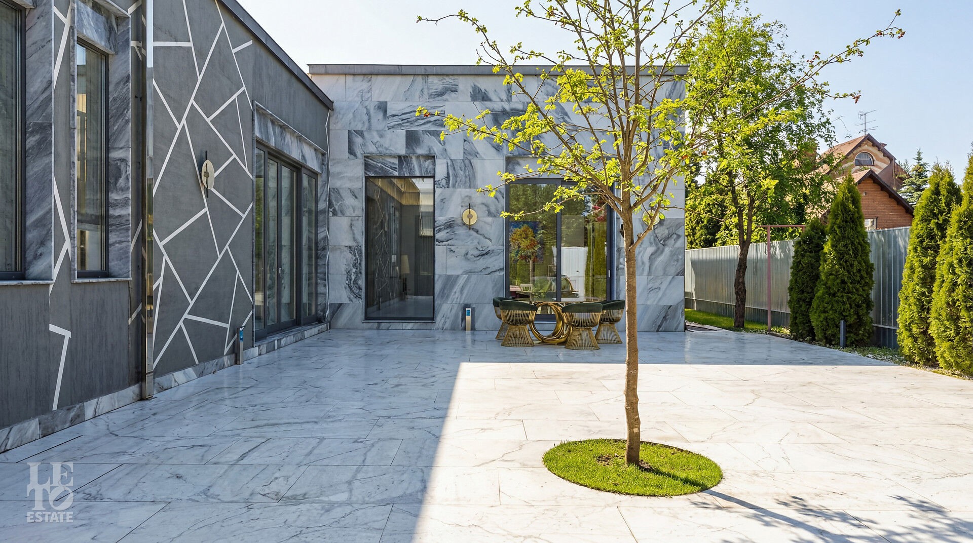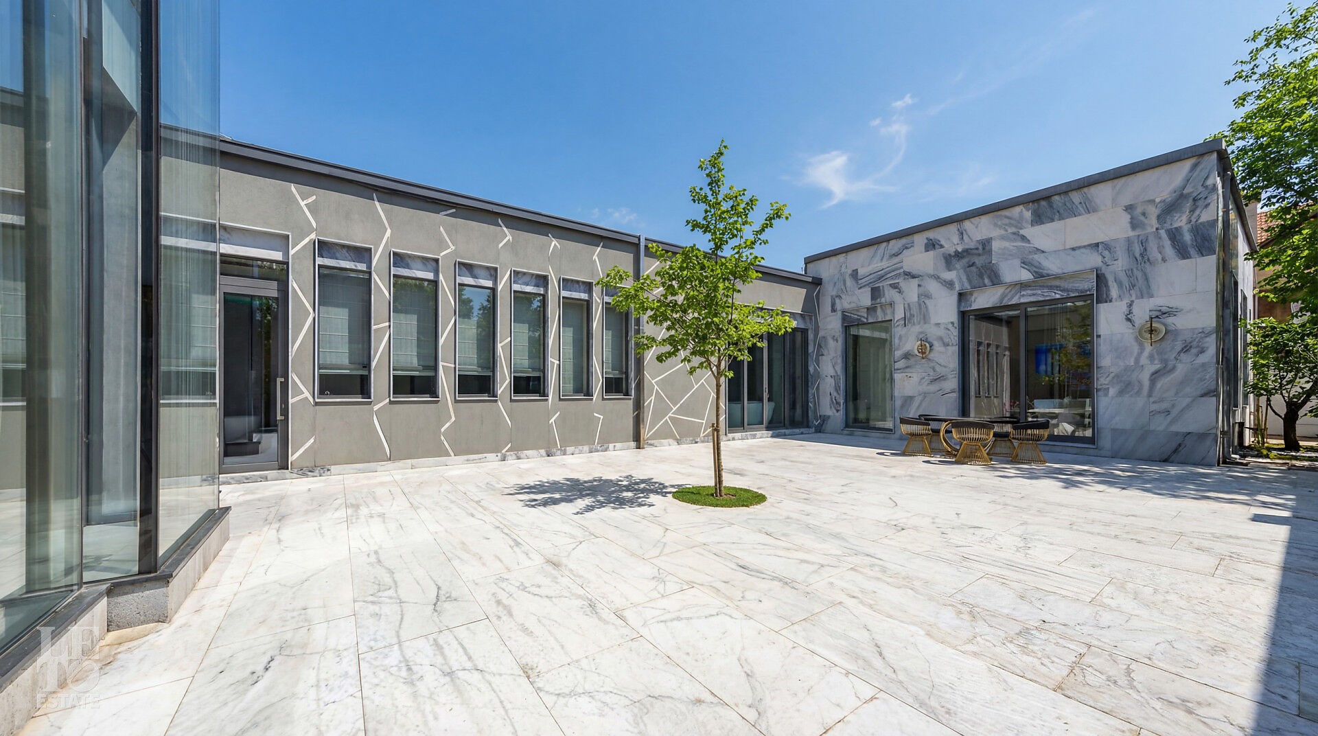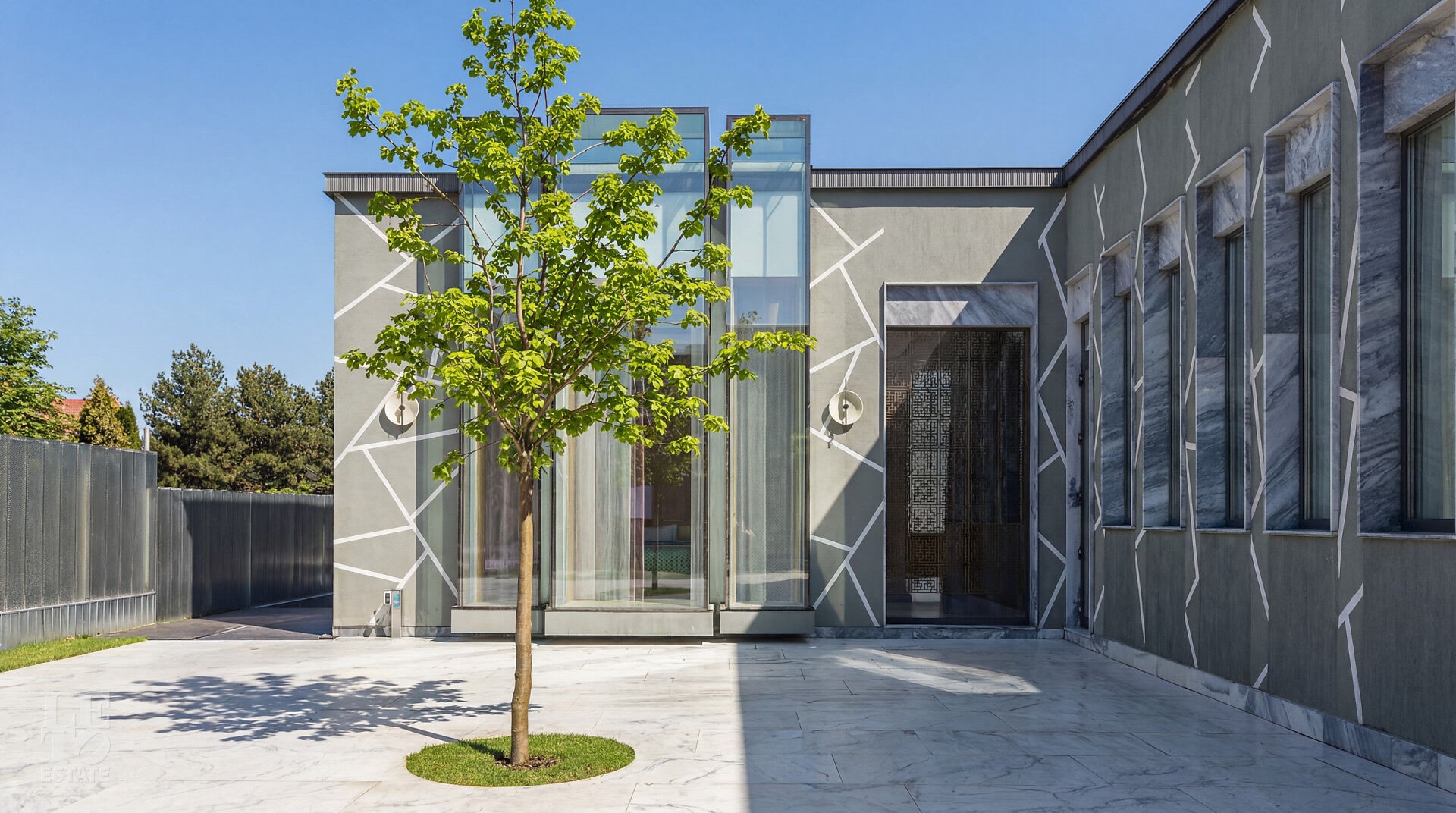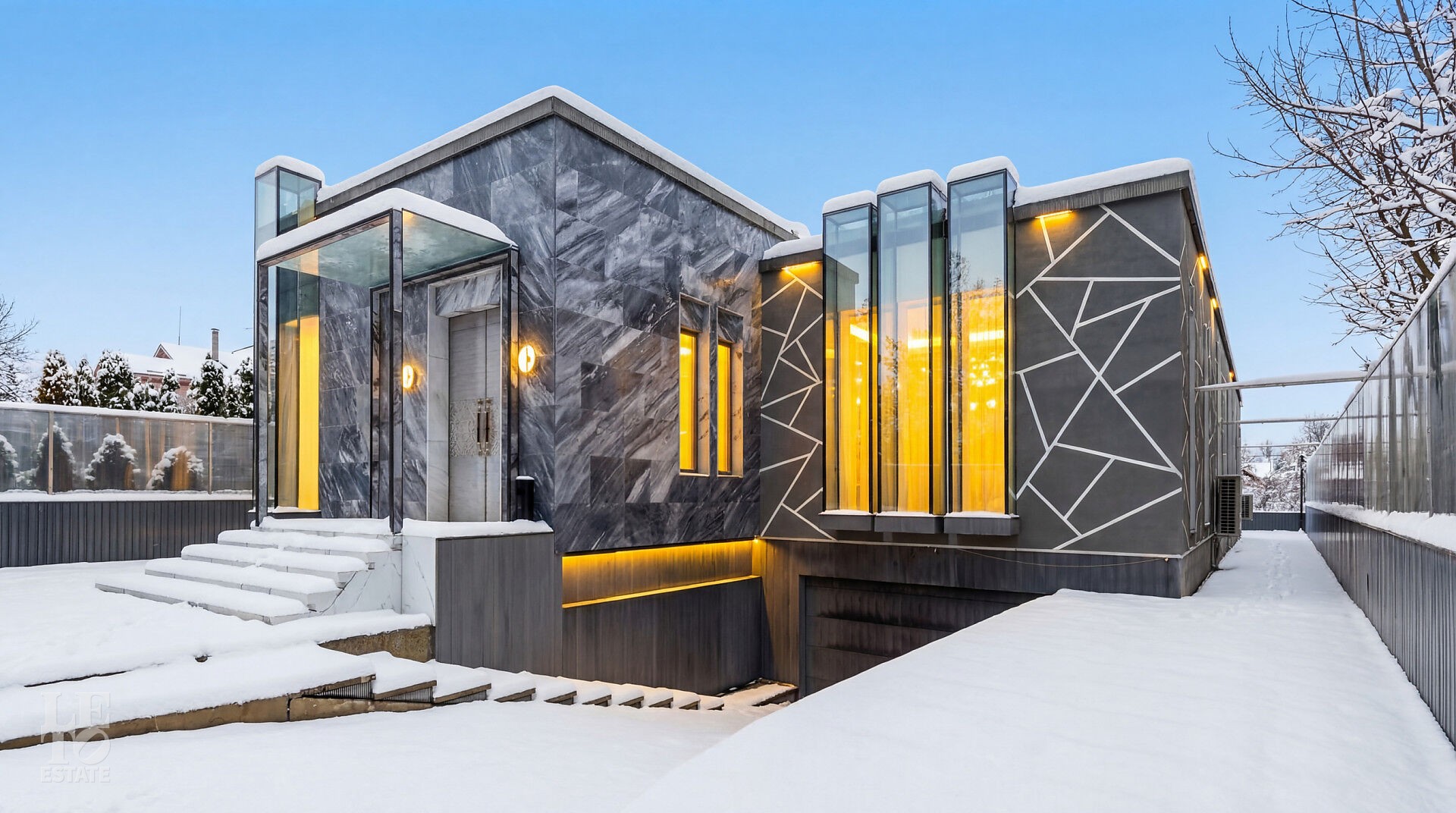 Современный и лаконичный фасад, облицованный серым мрамором, задаёт тон исключительной изысканности. Принцип чистых линий и минимализма продолжается внутри, где царит интерьер в стиле «тихой роскоши»: каждая деталь служит гармонии, комфорту и визуальному покою.
