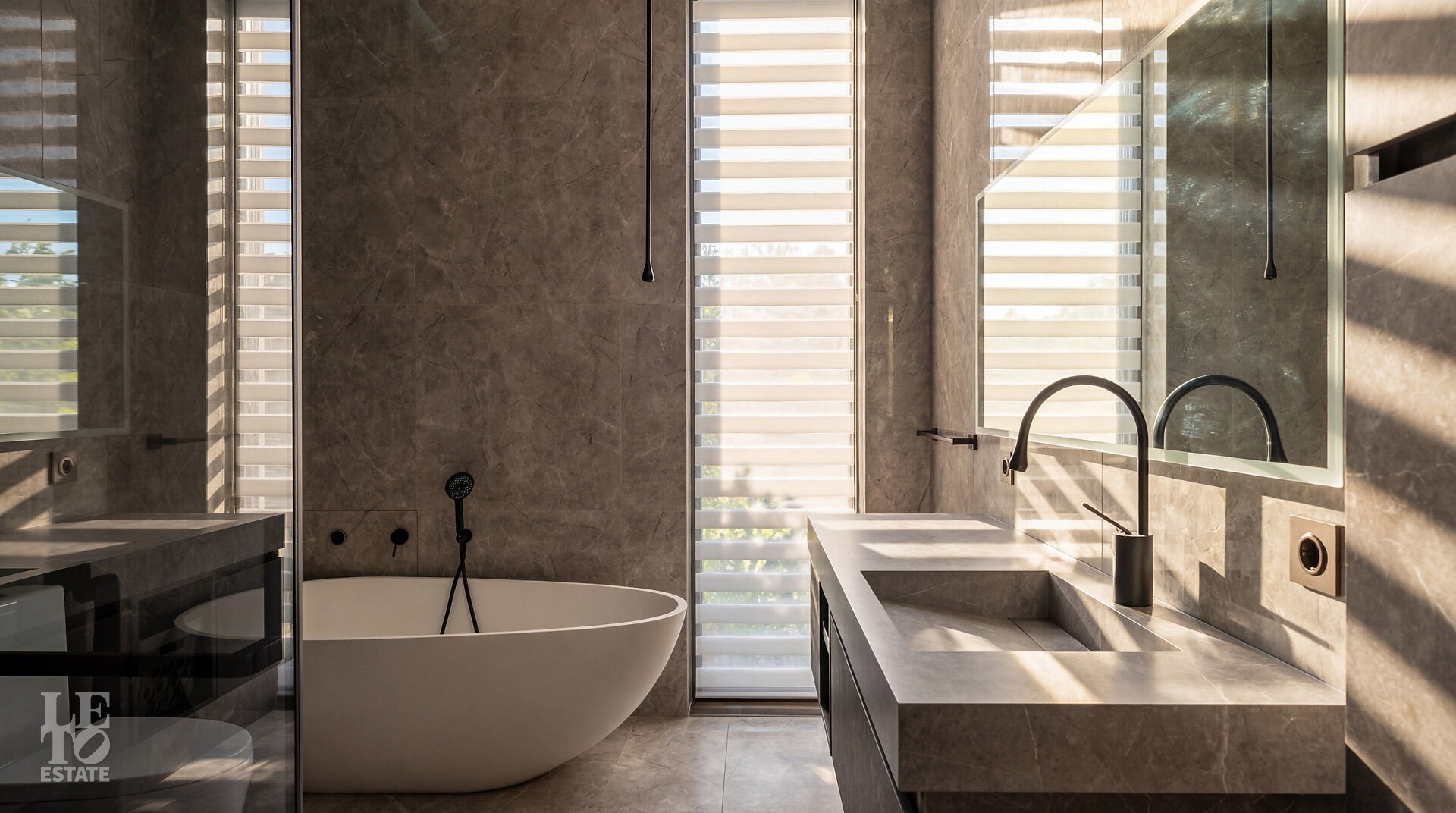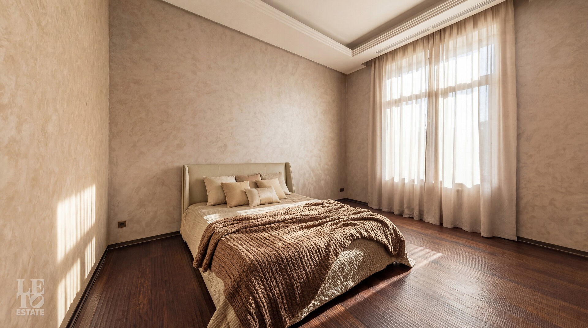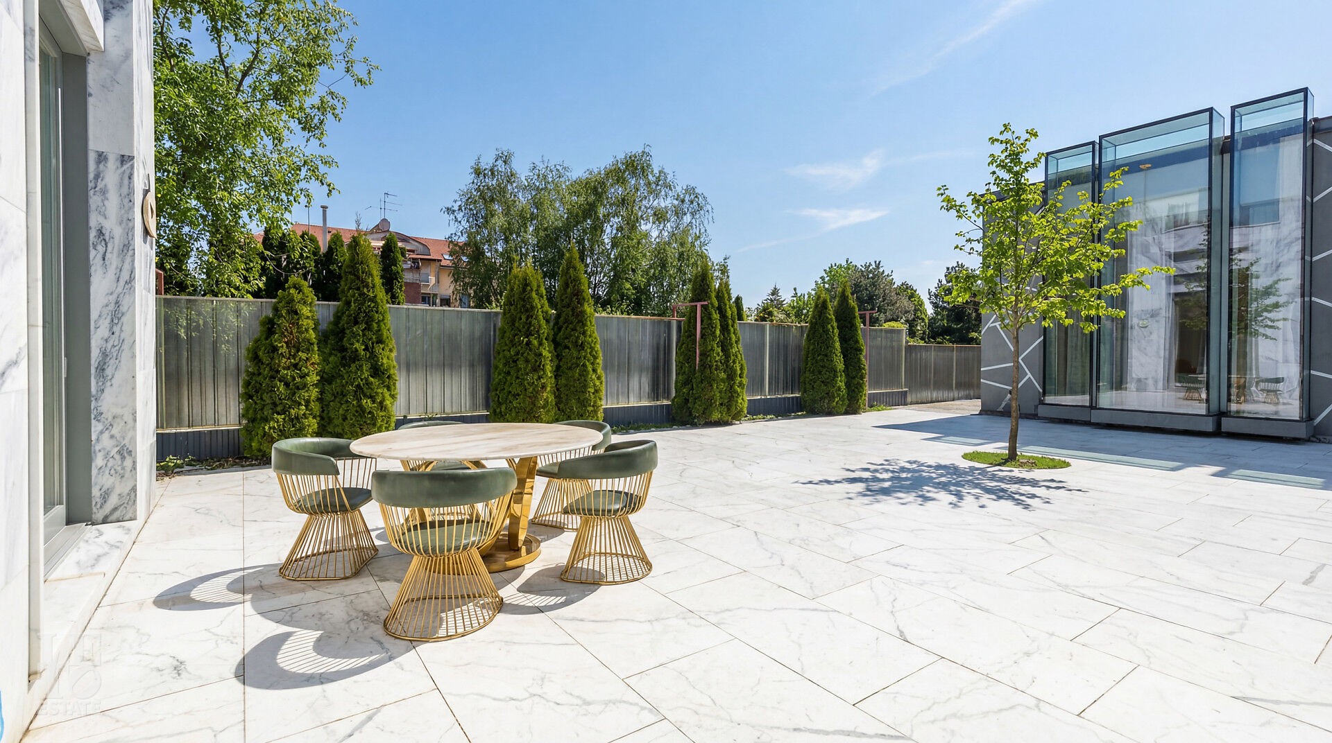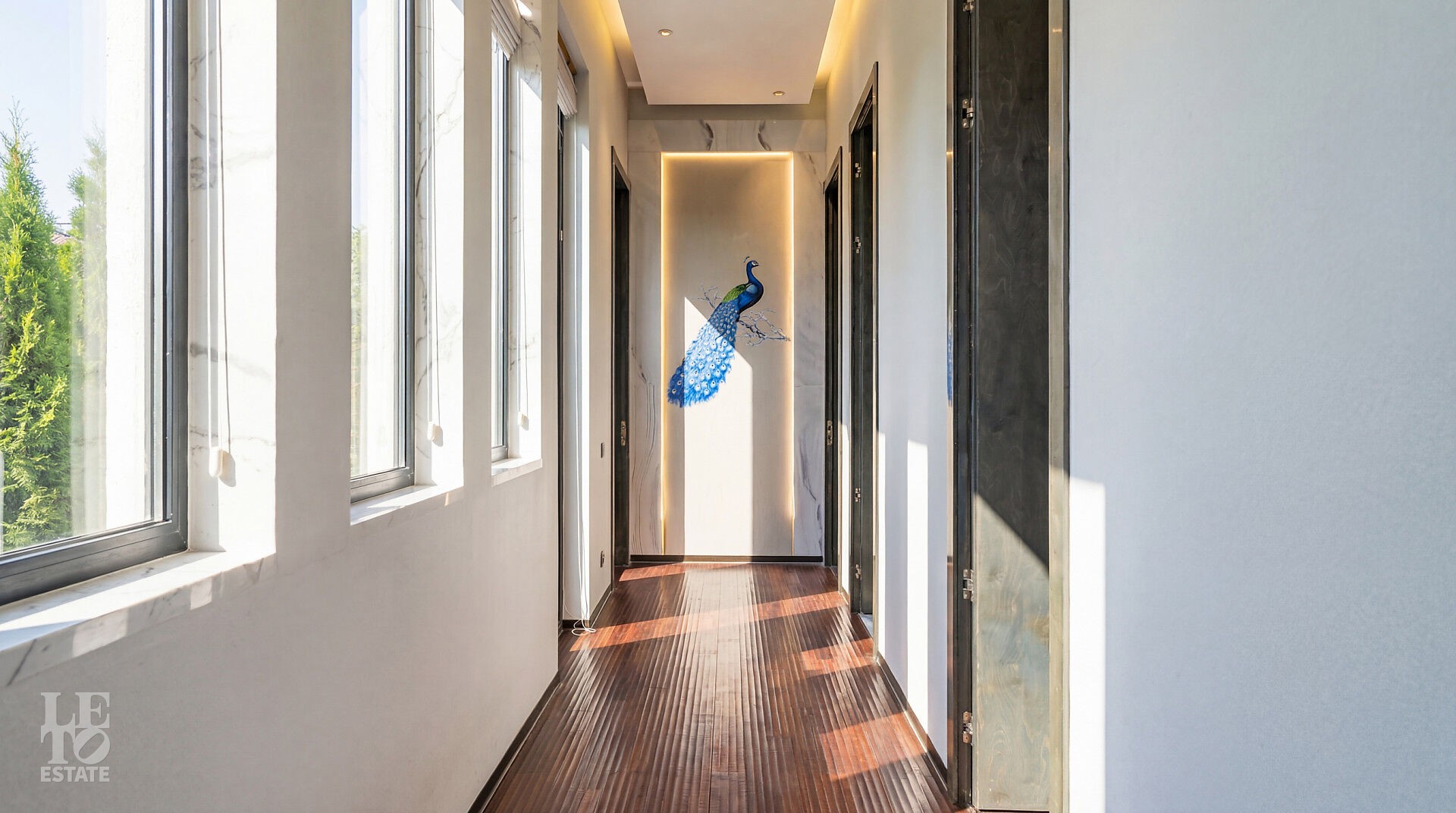 Современный и лаконичный фасад, облицованный серым мрамором, задаёт тон исключительной изысканности. Принцип чистых линий и минимализма продолжается внутри, где царит интерьер в стиле «тихой роскоши»: каждая деталь служит гармонии, комфорту и визуальному покою.