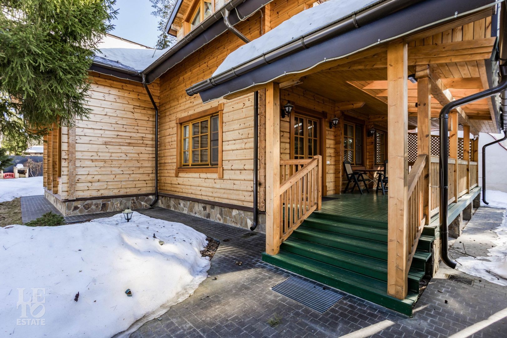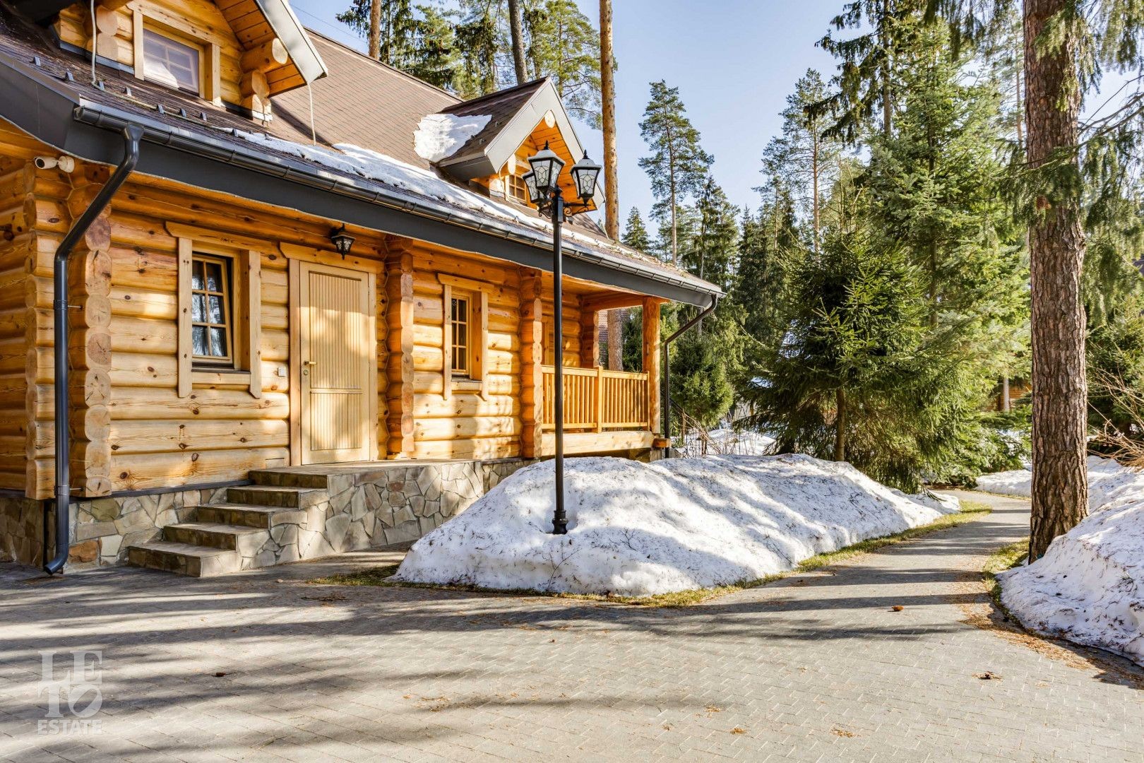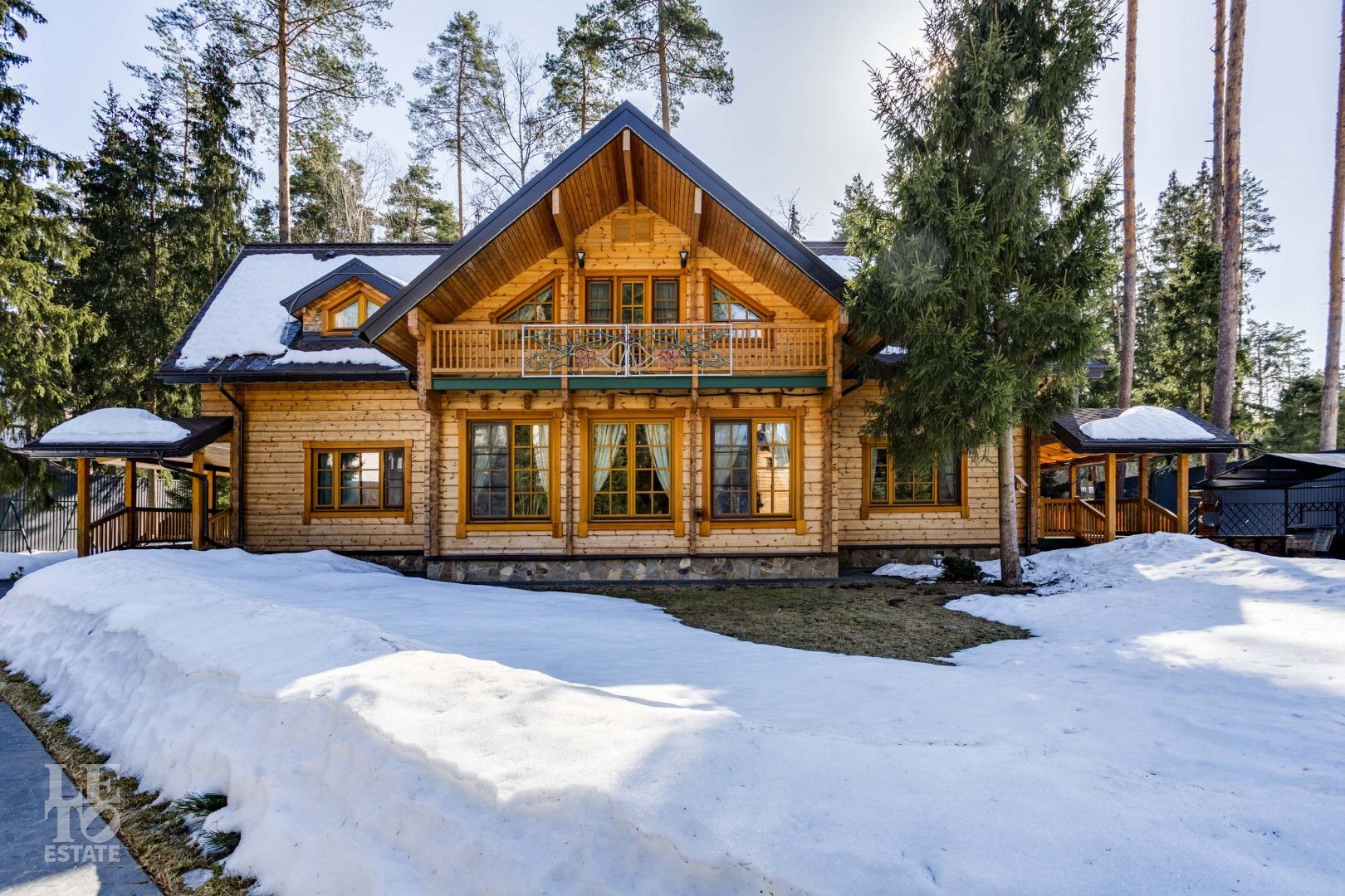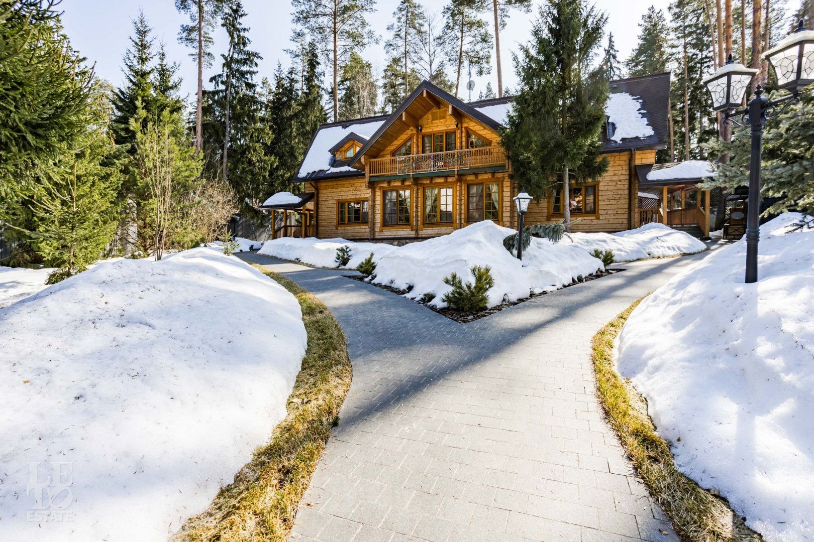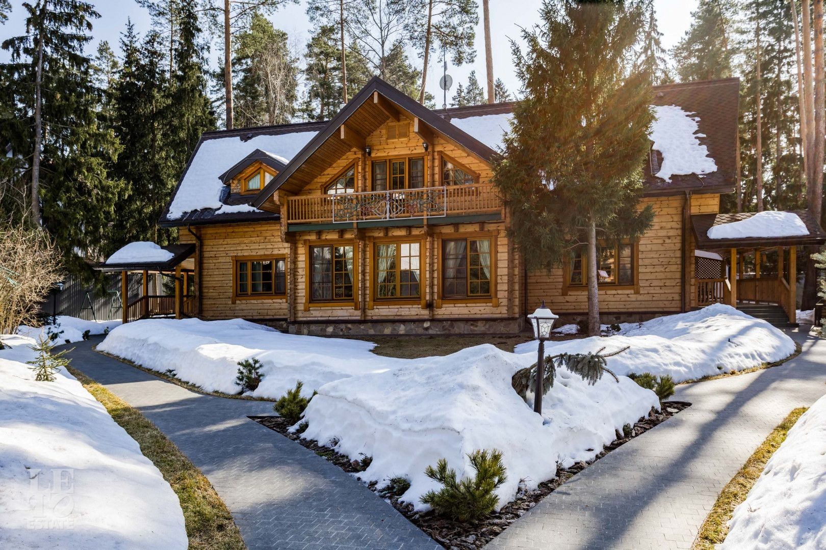 Дом расположен на лесном участке с вековыми соснами. На участке площадью 23 сотки сделан дренаж, ландшафтный дизайн, высажены цветы, дорожки с освещением. На участке гараж на два автомобиля с мойкой, гостевой дом.