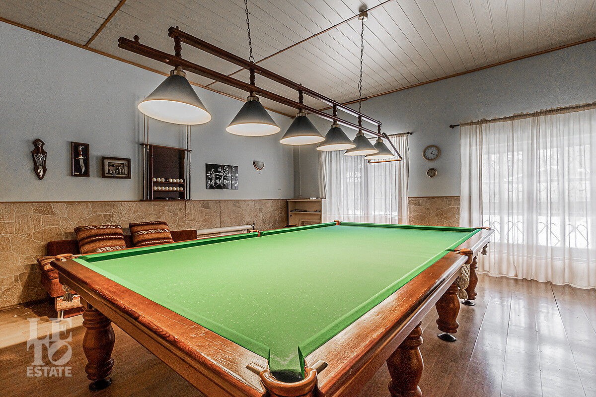 Первый этаж - прихожая, две спальни, два санузла, кухня, столовая, зимний сад, каминный зал, бильярдная, сауна, комната отдыха, теплый гараж;