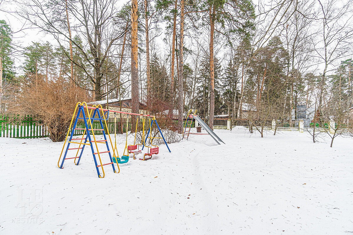 Участок, площадью 18 соток, благоустроен, выполнен ландшафтный дизайн: дорожки вымощены тротуарной плиткой, высажены плодовые и хвойные деревья. Для отдыха на свежем воздухе оборудованы детская площадка и зона барбекю.