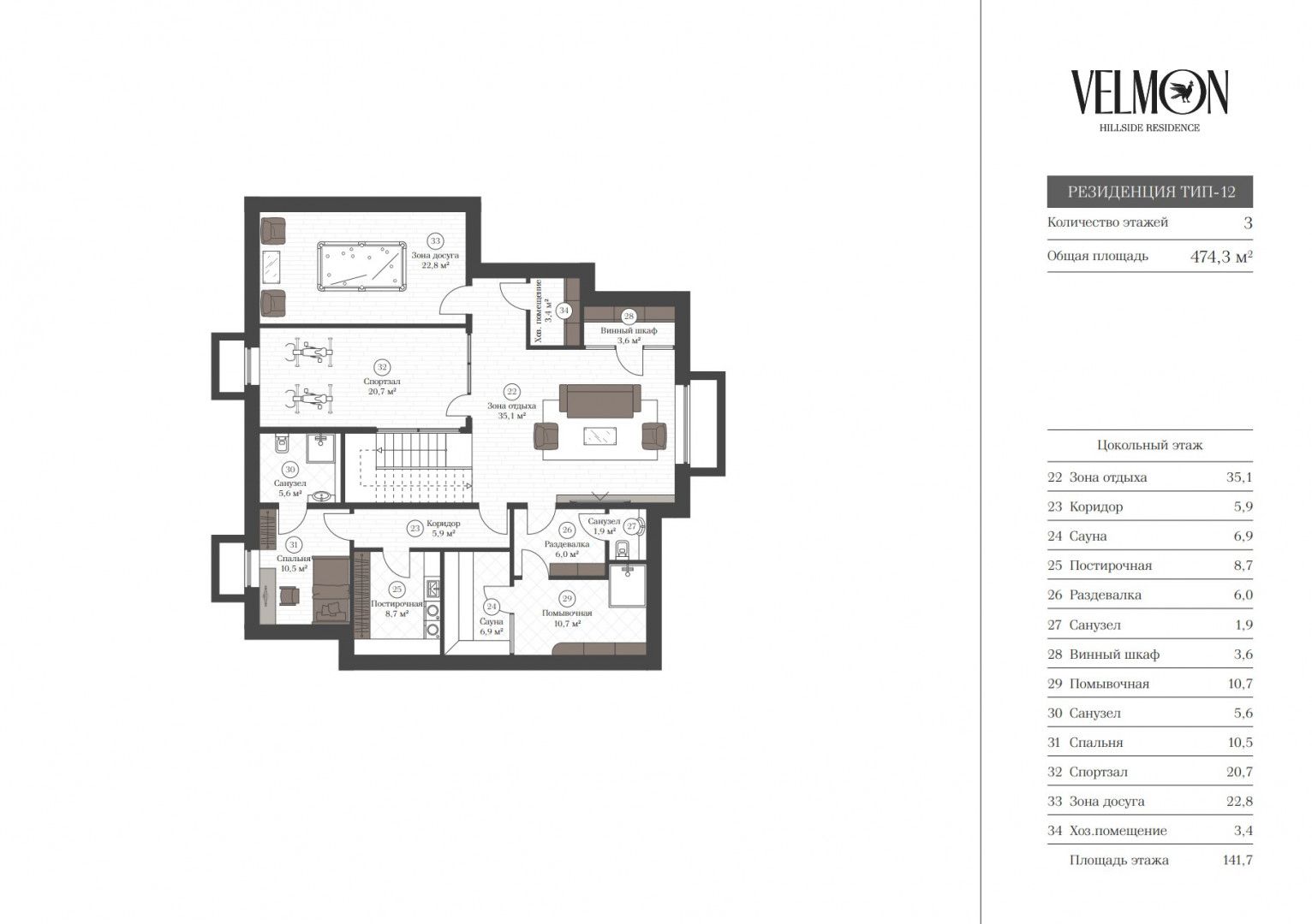 Цокольный этаж: зона отдыха, сауна, постирочная, раздевалка, санузел, винный шкаф, помывочная, спальня с санузлом, спортзал, зона досуга, хозяйственное помещение;
