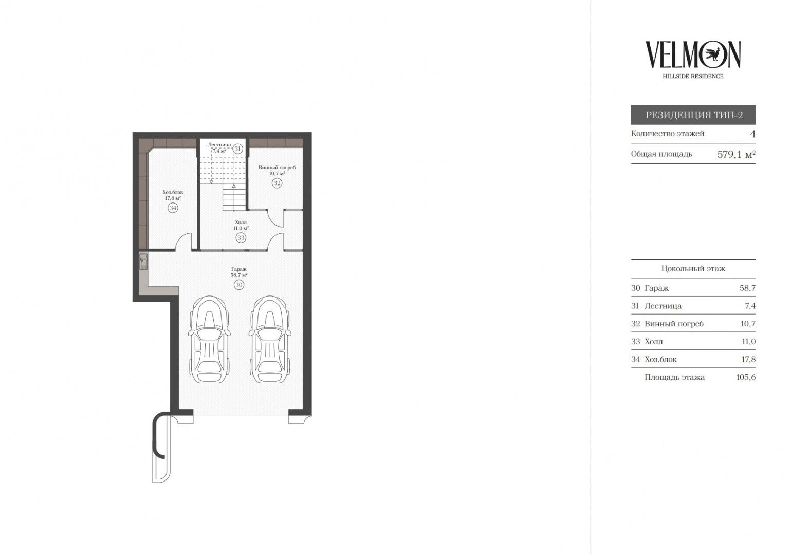 Цокольный этаж: гараж, винный погреб, хозяйственный блок;