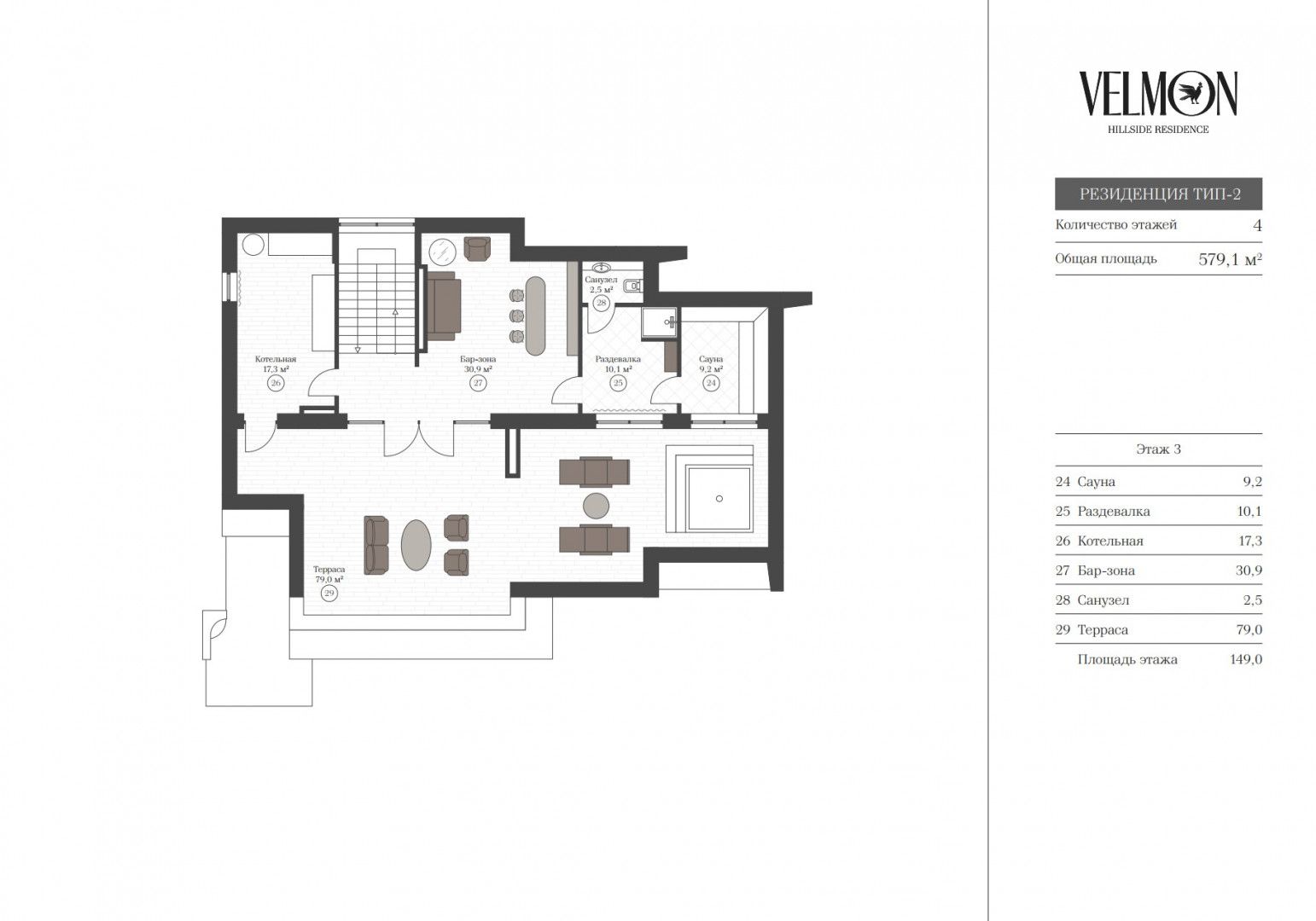 Третий этаж: бар-зона, раздевалка, санузел, сауна, котельная, терраса.