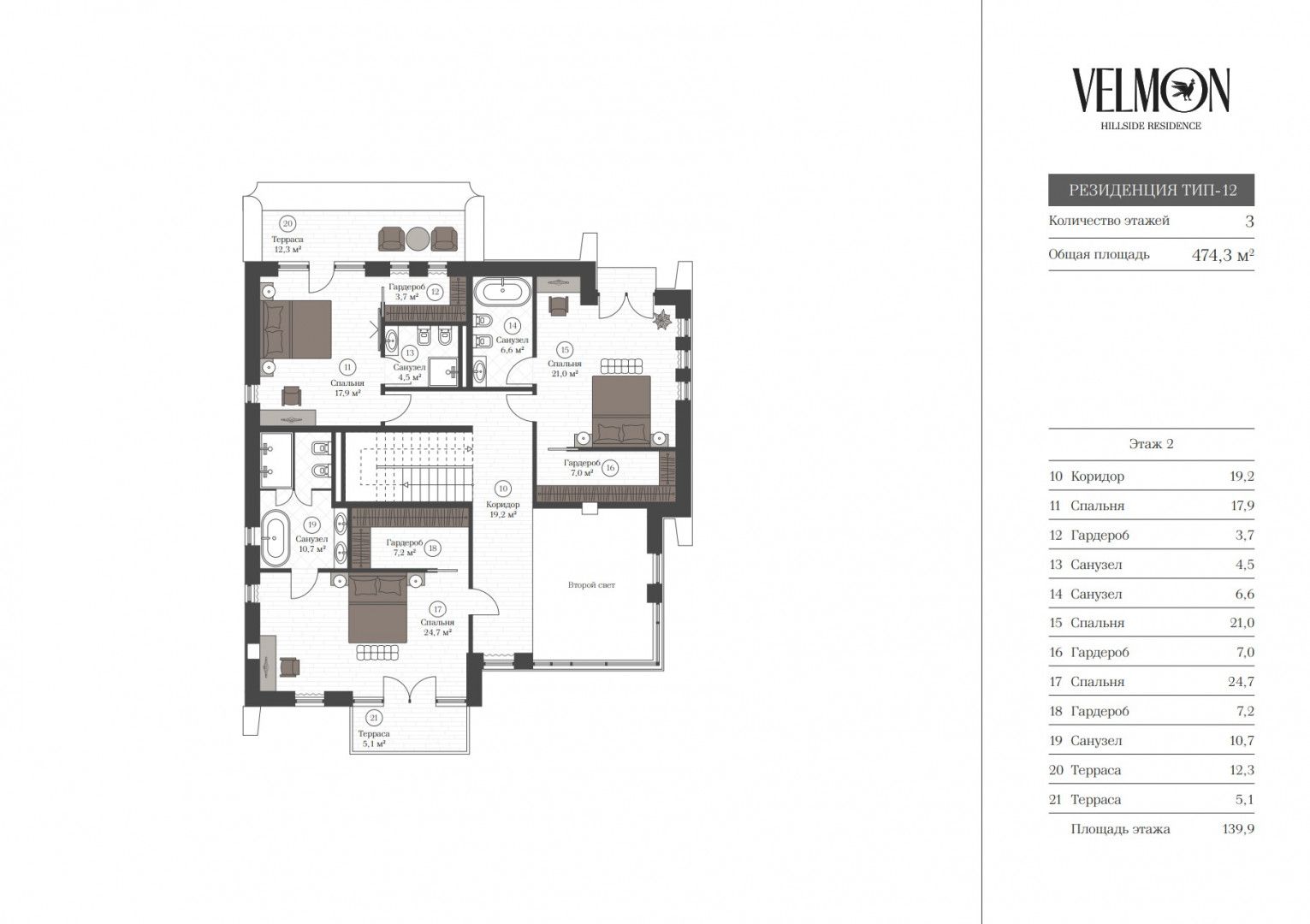 Второй этаж: две спальни с гардеробной, санузлом и выходом на террасу, спальня с гардеробной и санузлом.