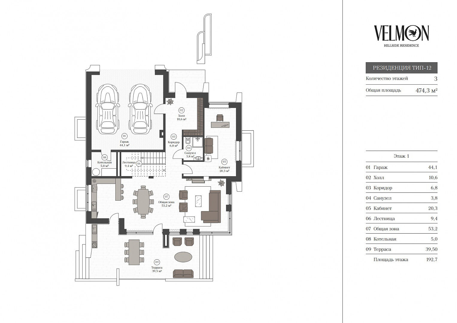 Первый этаж: гараж, котельная, холл, санузел, кабинет, кухня-столовая-гостиная с выходом на террасу.