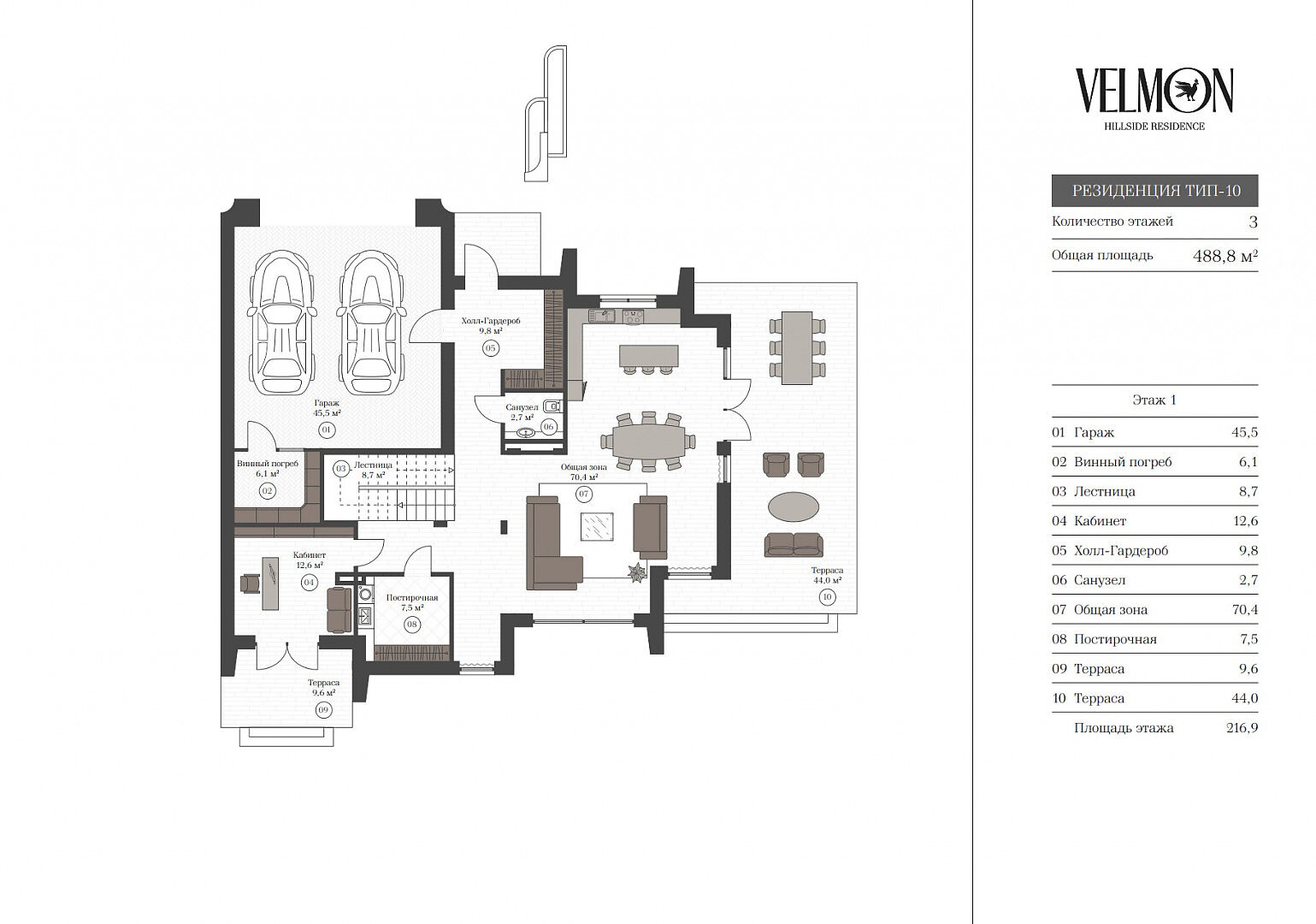Первый этаж: гараж, винный погреб, холл-гардеробная, санузел, постирочная, кабинет с выходом на террасу, кухня-столовая-гостиная с выходом на террасу.
