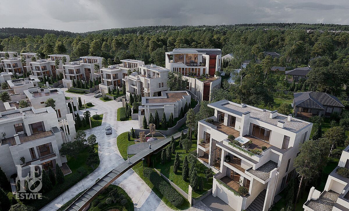 На территории расположены 48 резиденций площадью от 450 до 790 кв. м на участках от 6,5 до 14 соток. Все дома построены и готовы к заселению — будущие владельцы избавлены от шума и неудобств, связанных со строительными работами. Резиденции выполнены в минималистичном стиле с панорамным остеклением и эксплуатируемыми кровлями, которые гармонично вписаны в ландшафт. Дома продаются без внутренней отделки, что позволяет реализовать индивидуальные дизайнерские решения.