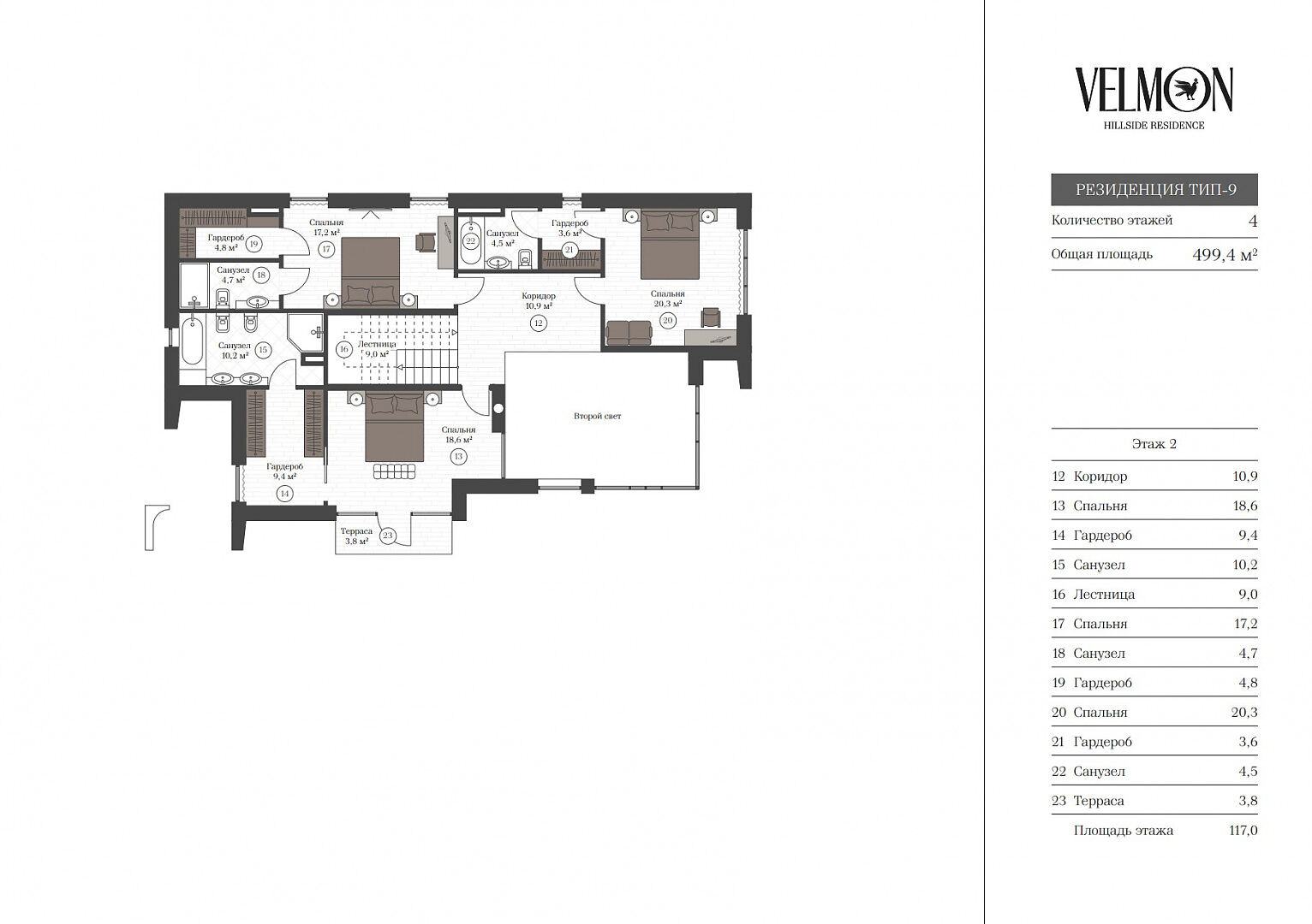 Второй этаж: спальня с санузлом, гардеробной и выходом на террасу, 2 спальни с гардеробной и санузлом.