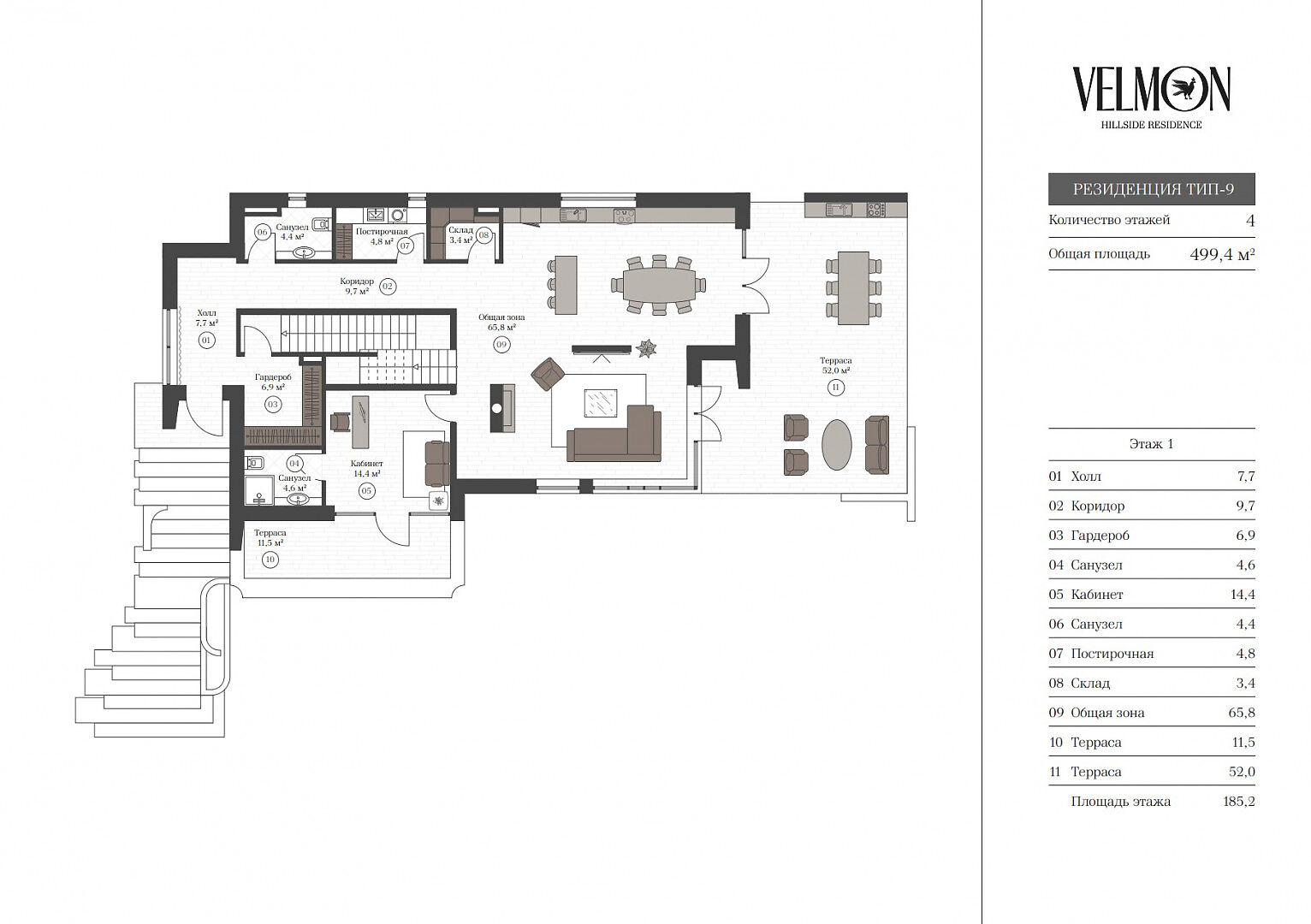На территории расположены 48 резиденций площадью от 450 до 790 кв. м на участках от 6,5 до 14 соток. Все дома построены и готовы к заселению — будущие владельцы избавлены от шума и неудобств, связанных со строительными работами. Резиденции выполнены в минималистичном стиле с панорамным остеклением и эксплуатируемыми кровлями, которые гармонично вписаны в ландшафт. Дома продаются без внутренней отделки, что позволяет реализовать индивидуальные дизайнерские решения.
