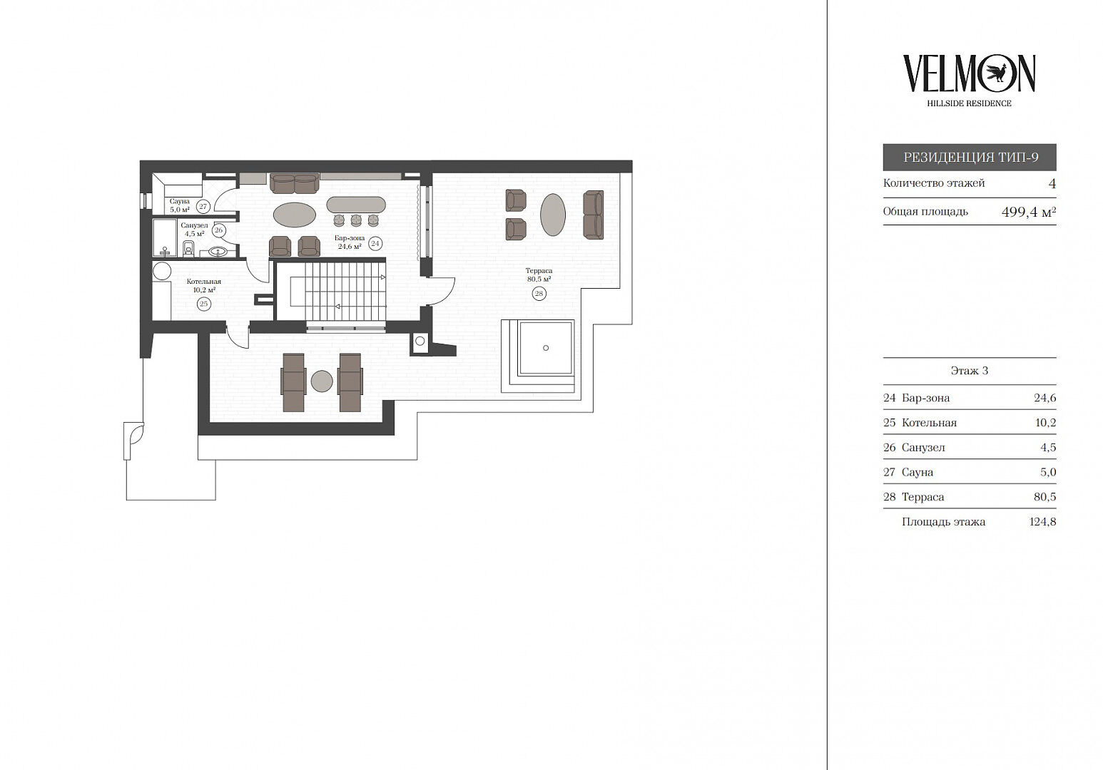 Третий этаж: бар-зона, сауна, санузел, котельная, терраса.