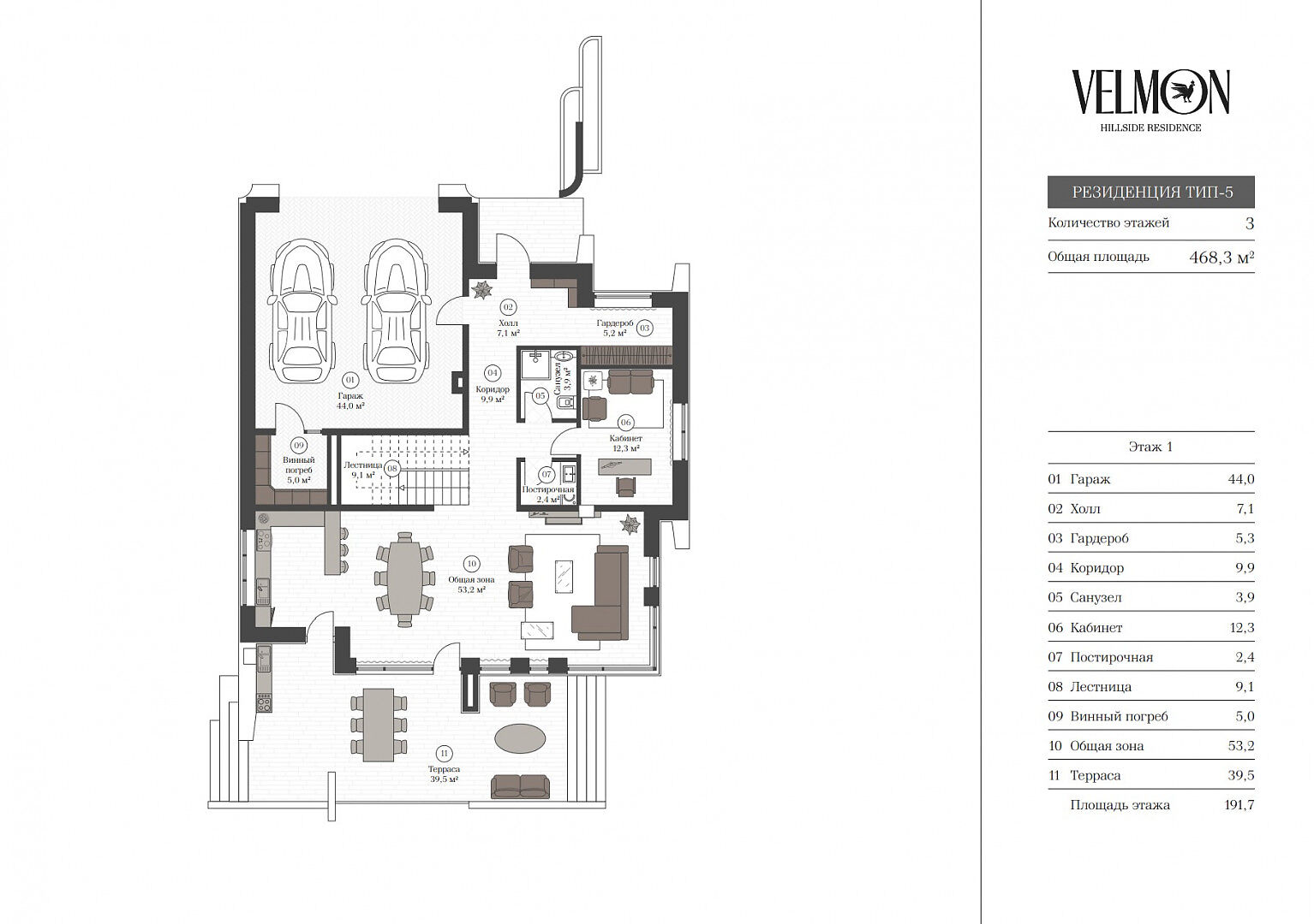 Первый этаж: гараж, холл, гардеробная, постирочная, винный погреб, санузел, кабинет, кухня-столовая-гостиная с выходом на террасу.