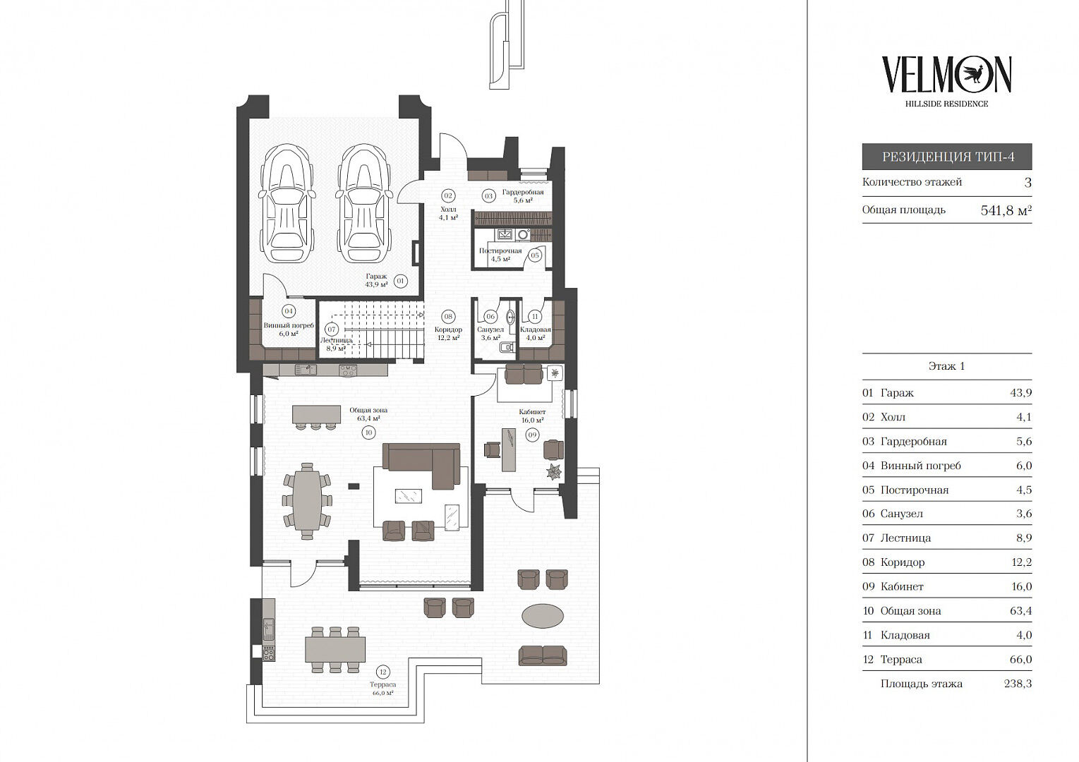 Первый этаж: гараж, холл, гардеробная, постирочная, винный погреб, санузел, кладовая, кабинет, кухня-столовая-гостиная с выходом на террасу.