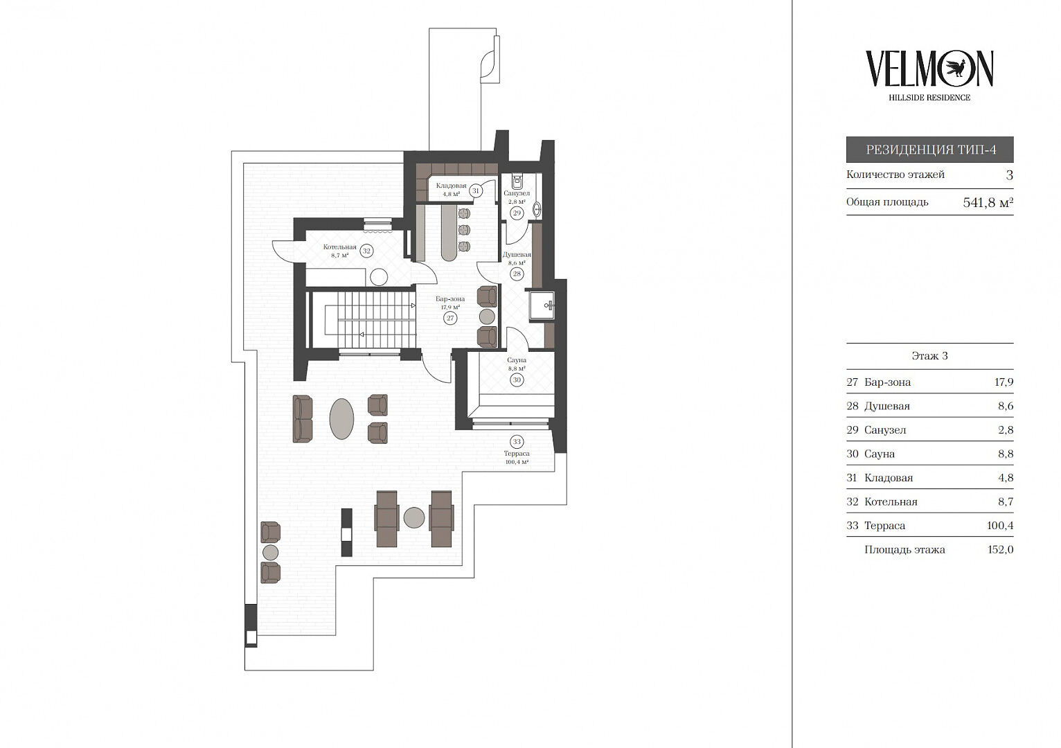 Третий этаж: бар-зона, кладовая, котельная, душевая, санузел, сауна, терраса.