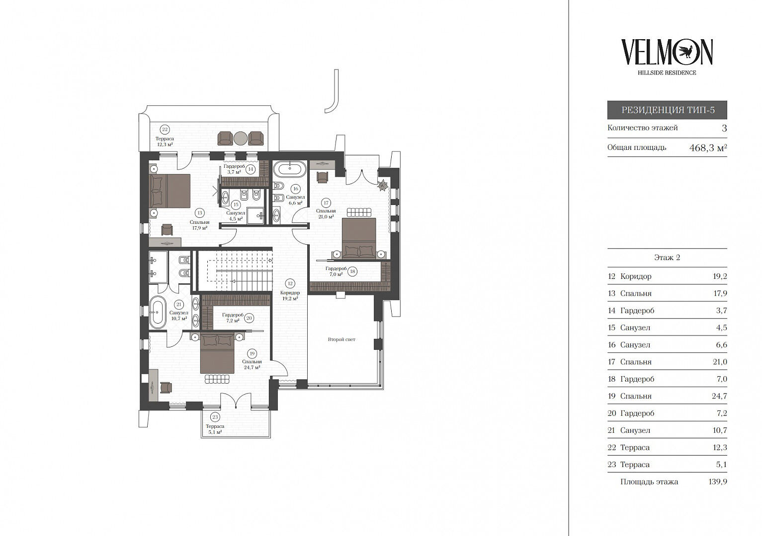 Второй этаж: 2 спальни с санузлом, гардеробной и выходом на террасу, спальня с гардеробной и санузлом.