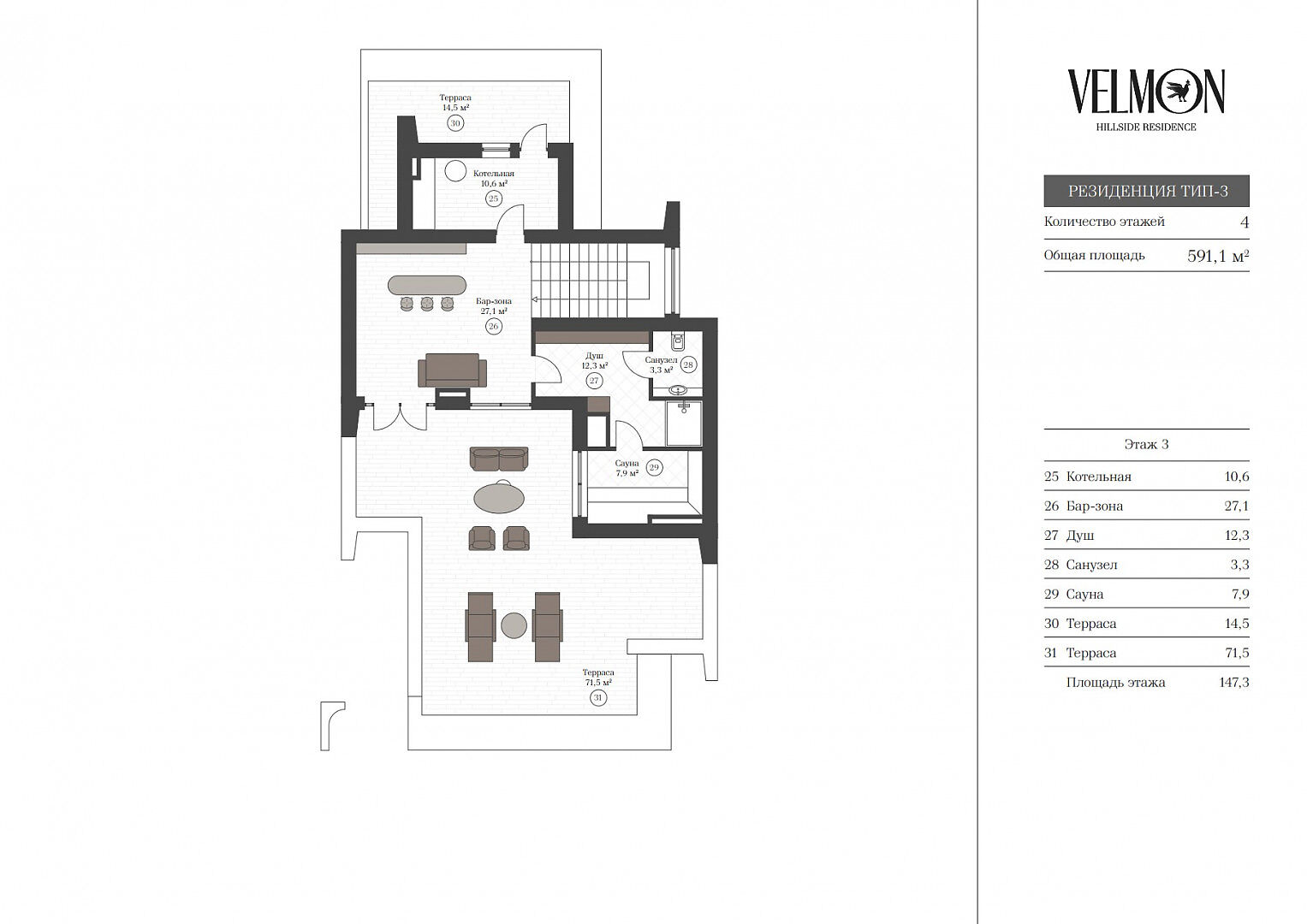 Третий этаж: бар-зона, душ, санузел, сауна, котельная, две террасы.