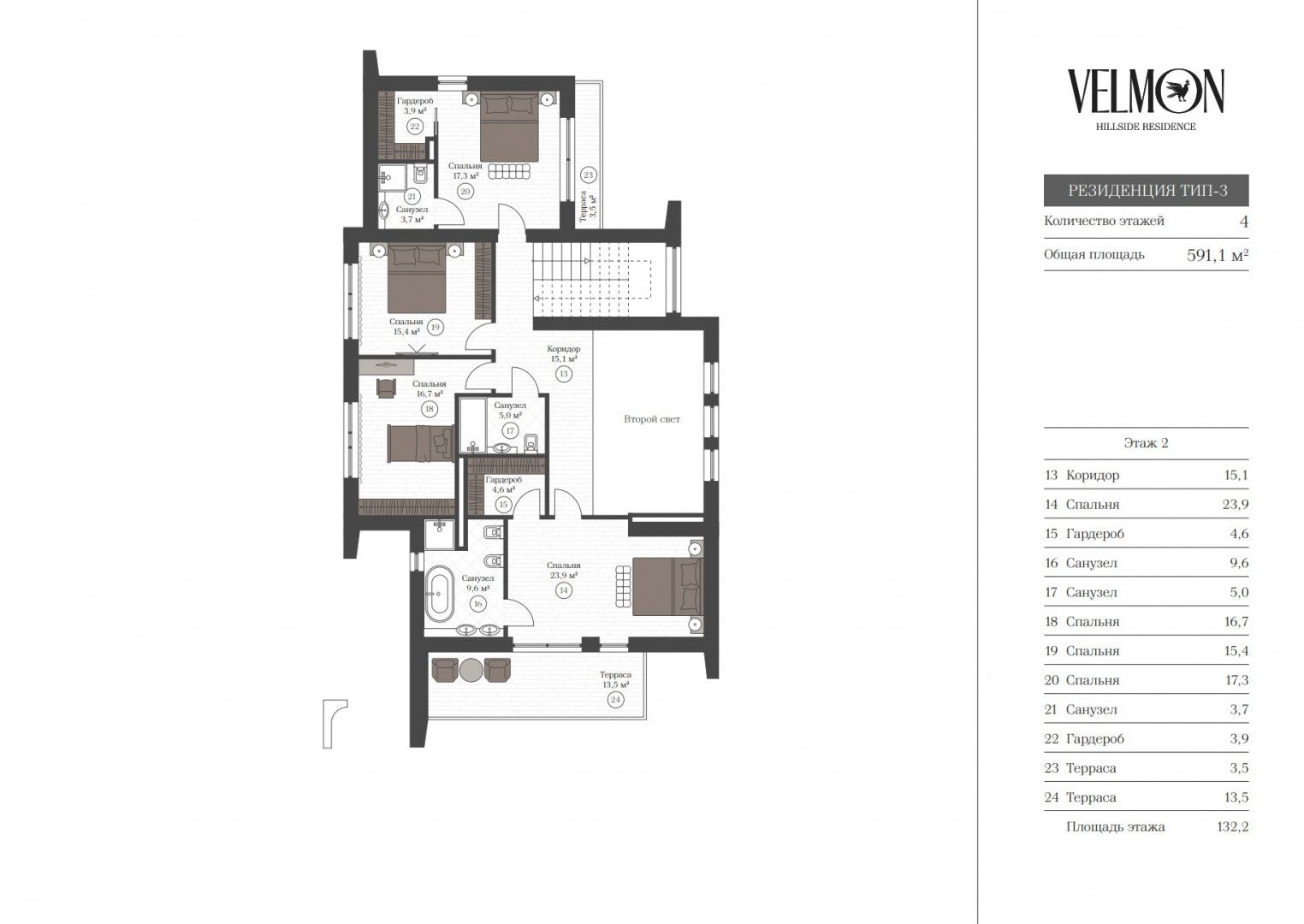 Второй этаж: две спальни с гардеробной, санузлом и собственной террасой, две спальни, санузел;