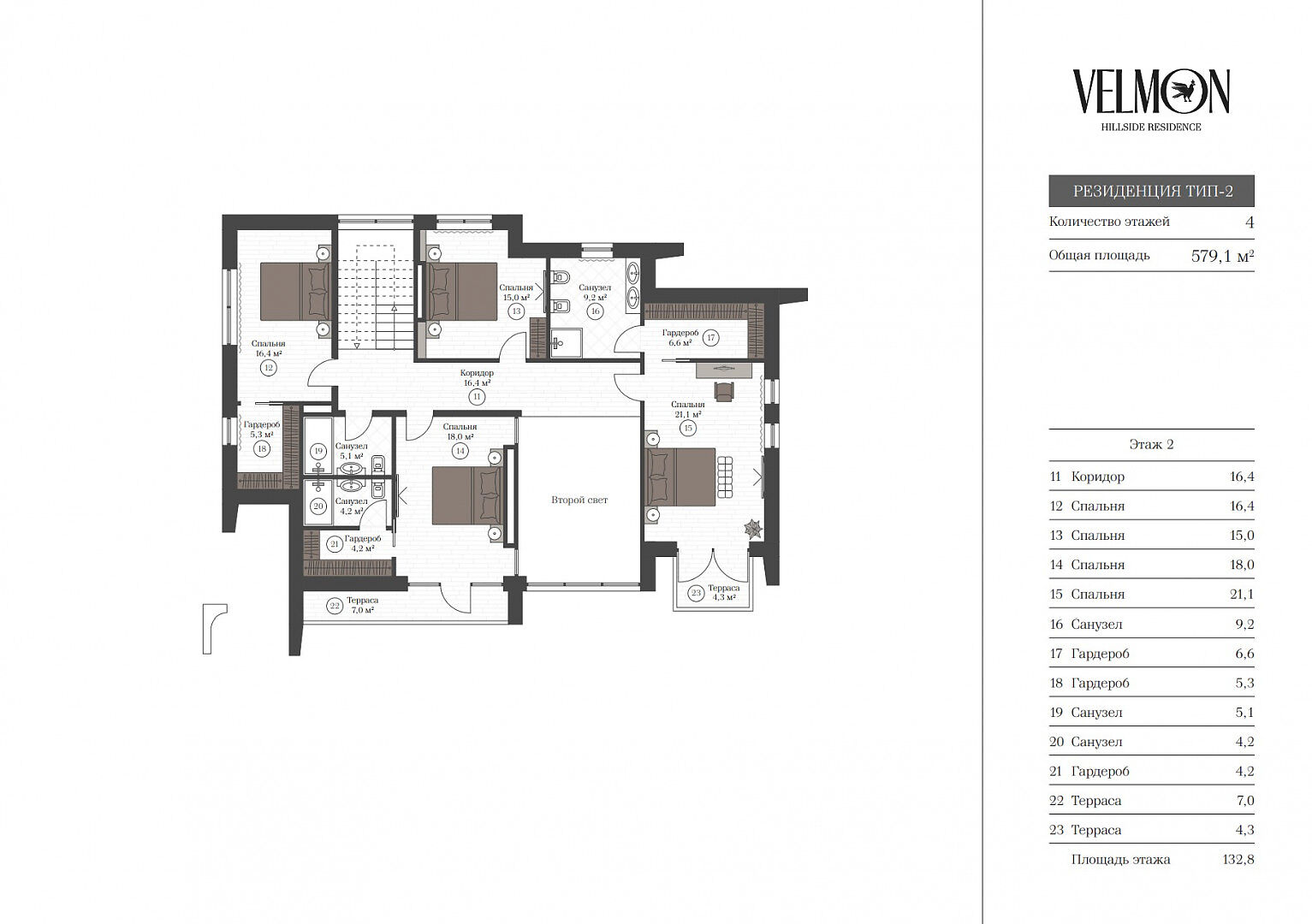 Второй этаж: две спальни с гардеробной, санузлом и собственной террасой, спальня с гардеробной, спальня, санузел;