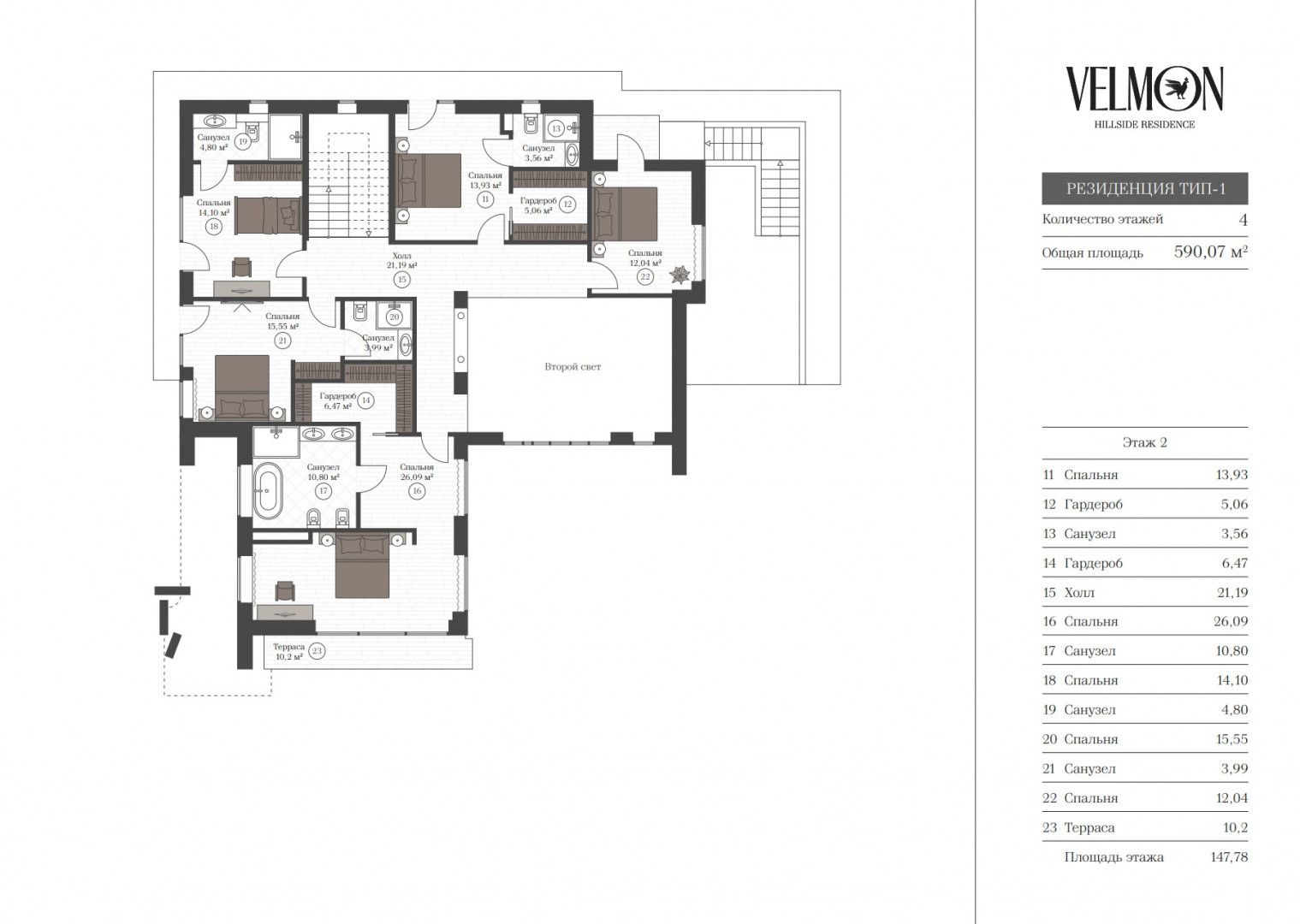 Второй этаж: две спальни со своими санузлами и гардеробными, две спальни со своими санузлами, спальня, терраса;