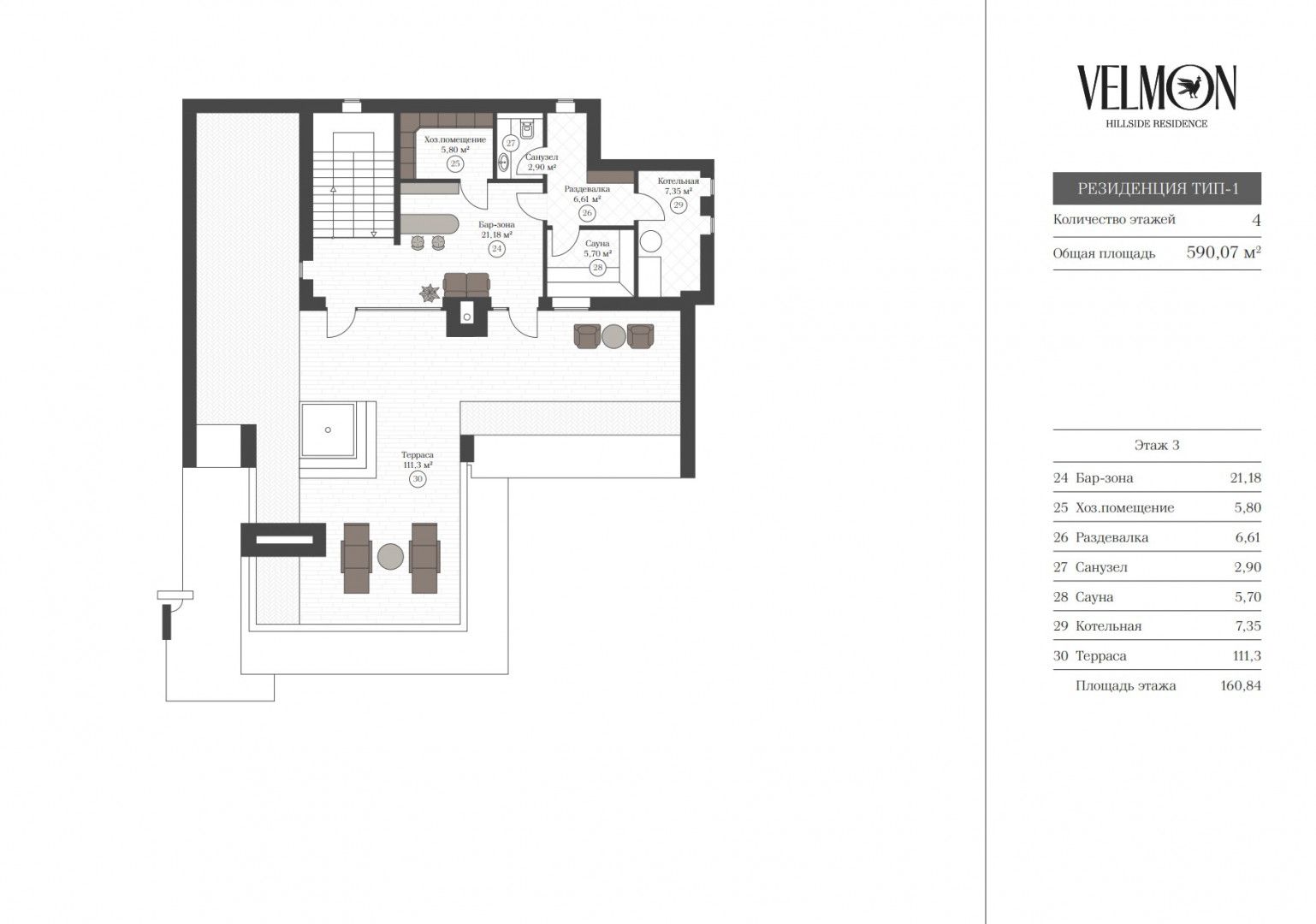 Третий этаж: бар-зона, хозяйственное помещение, раздевалка, санузел, сауна, котельная, терраса.