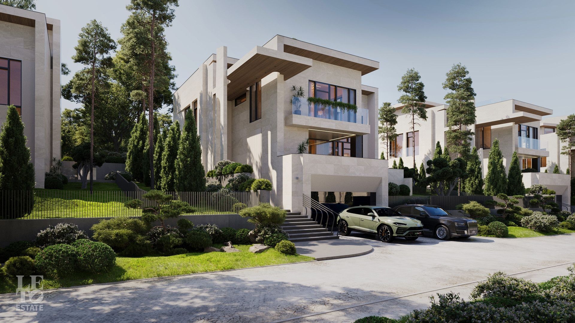 На территории расположены 48 резиденций площадью от 450 до 790 кв. м на участках от 6,5 до 14 соток. Все дома построены и готовы к заселению — будущие владельцы избавлены от шума и неудобств, связанных со строительными работами. Резиденции выполнены в минималистичном стиле с панорамным остеклением и эксплуатируемыми кровлями, которые гармонично вписаны в ландшафт. Дома продаются без внутренней отделки, что позволяет реализовать индивидуальные дизайнерские решения.