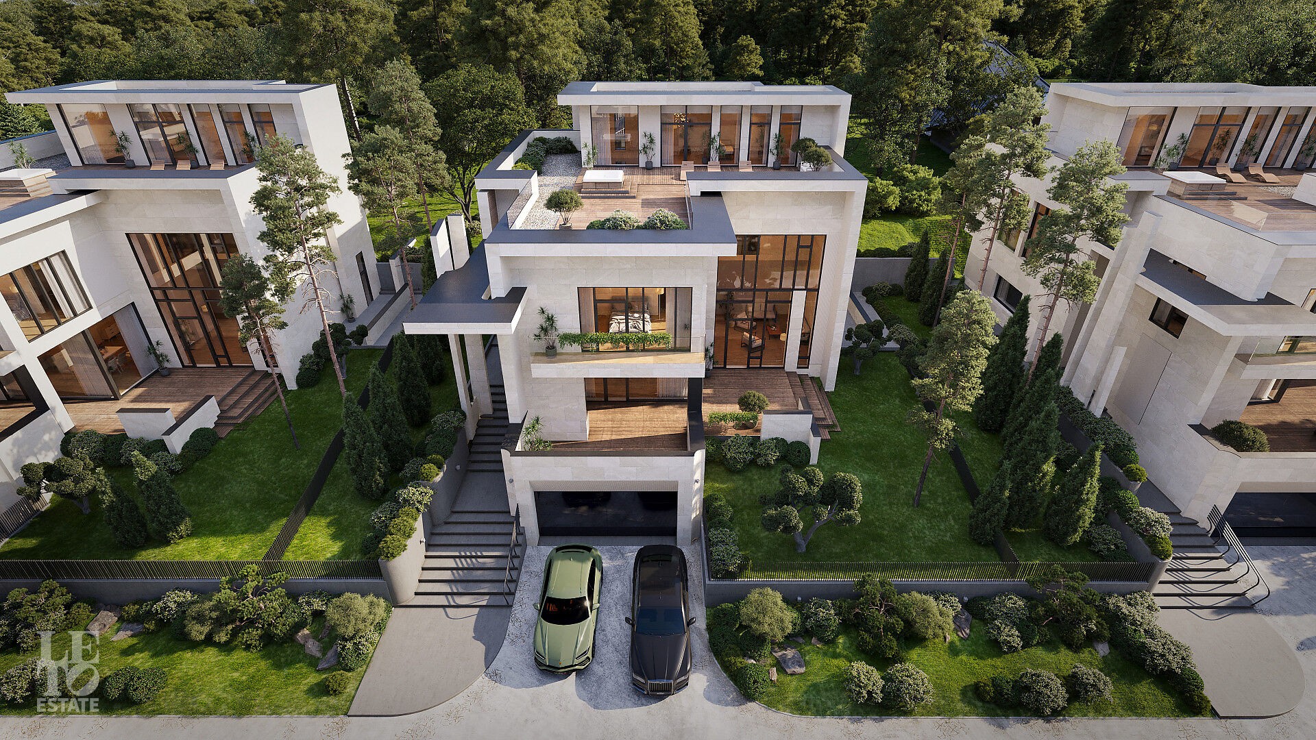 На территории расположены 48 резиденций площадью от 450 до 790 кв. м на участках от 6,5 до 14 соток. Все дома построены и готовы к заселению — будущие владельцы избавлены от шума и неудобств, связанных со строительными работами. Резиденции выполнены в минималистичном стиле с панорамным остеклением и эксплуатируемыми кровлями, которые гармонично вписаны в ландшафт. Дома продаются без внутренней отделки, что позволяет реализовать индивидуальные дизайнерские решения.