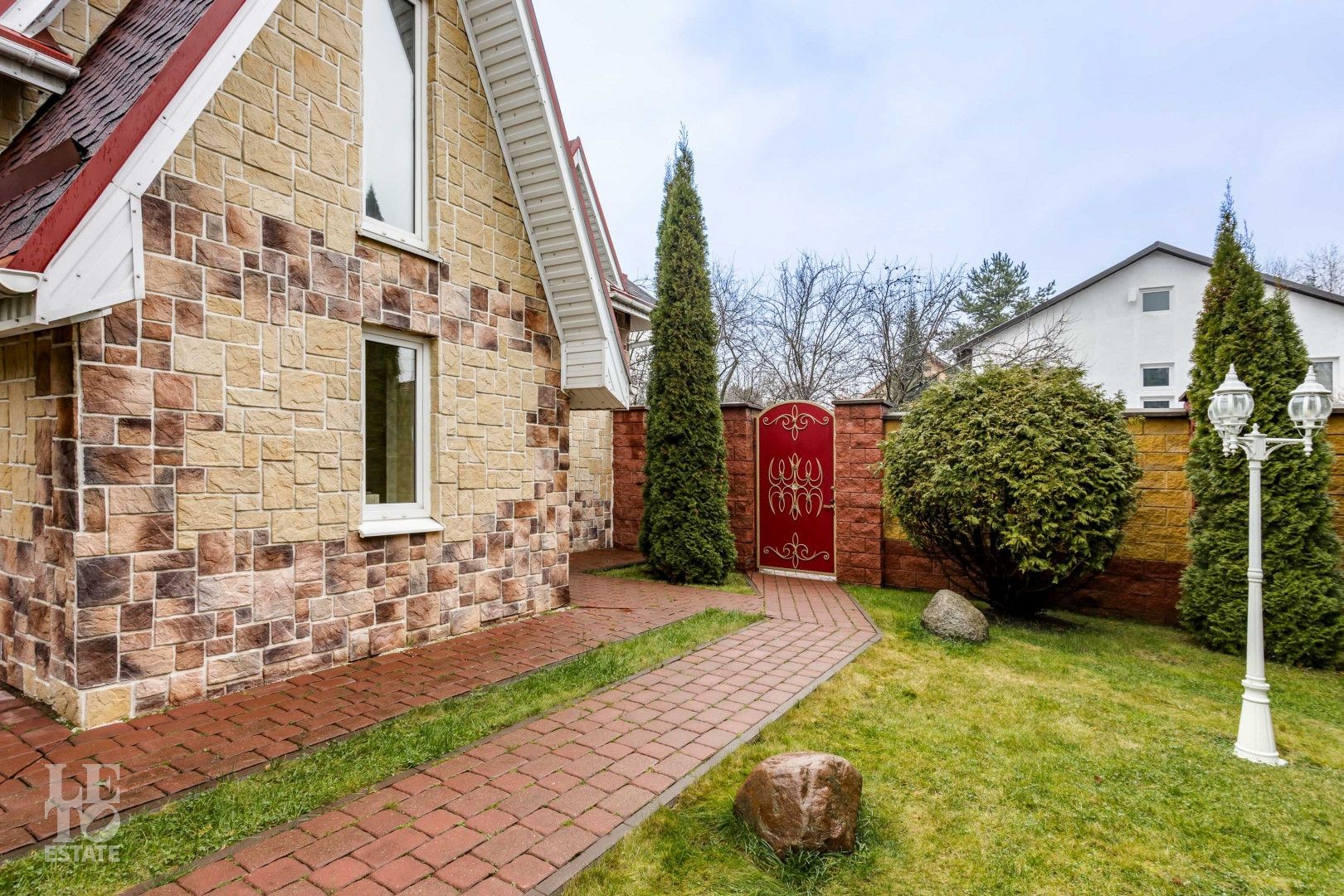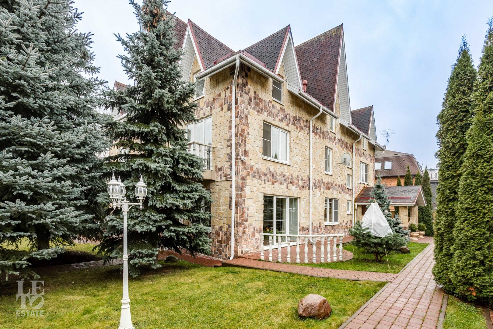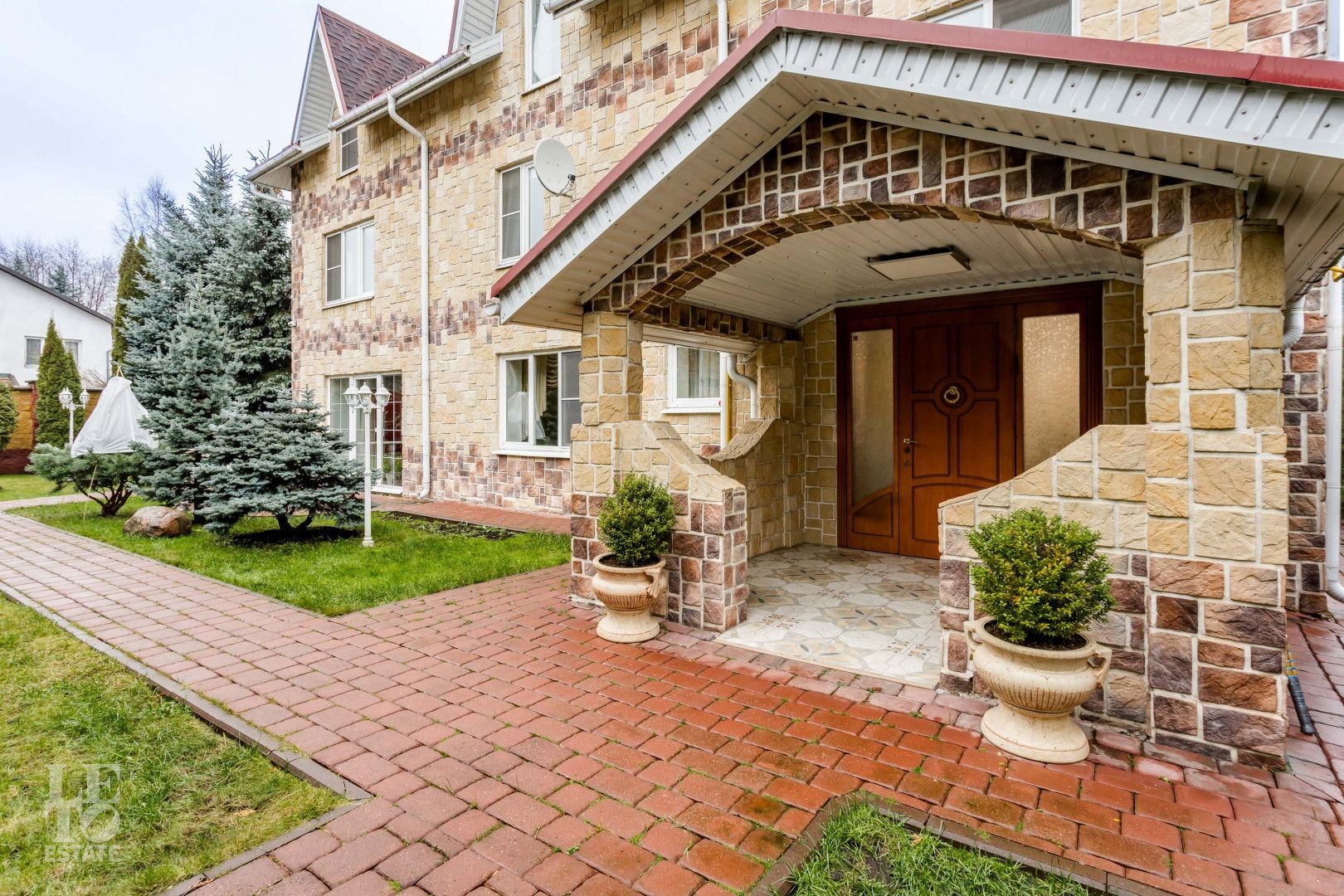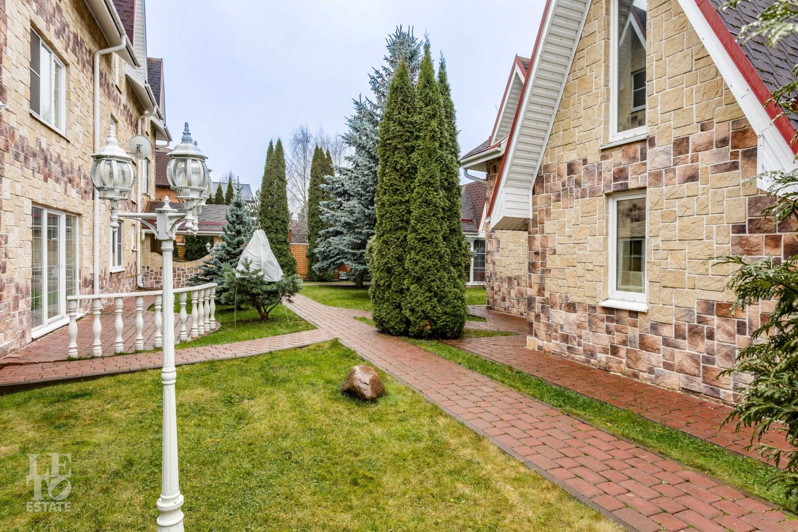 Эстетика и стиль: Дорожки выложены из благородного брусчатого кирпича, создавая четкую геометрию и аккуратный вид в любое время года. Изумрудный зеленый газон служит идеальным фоном.