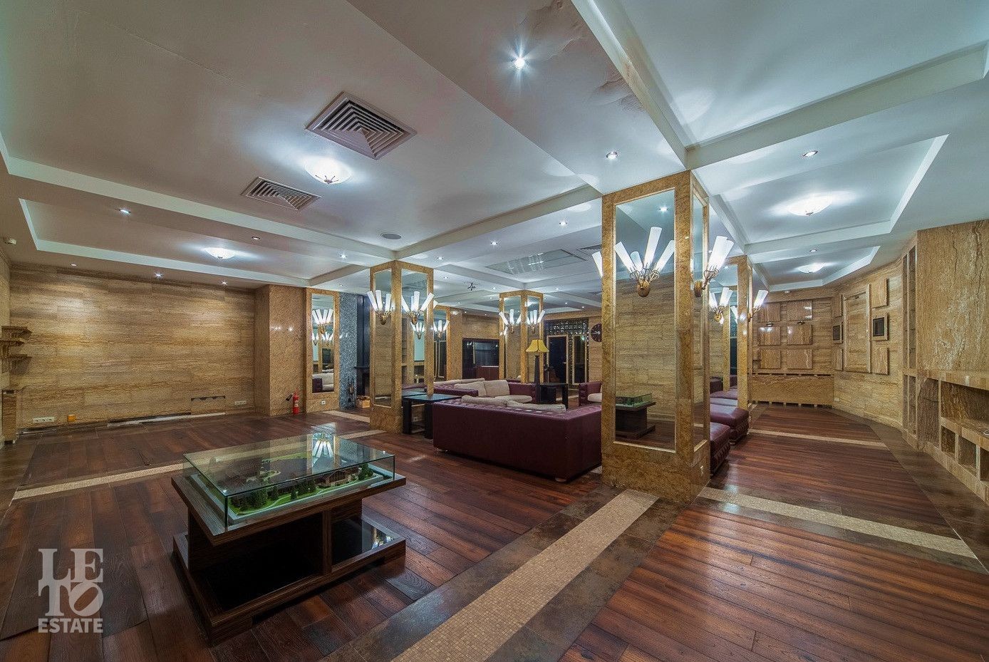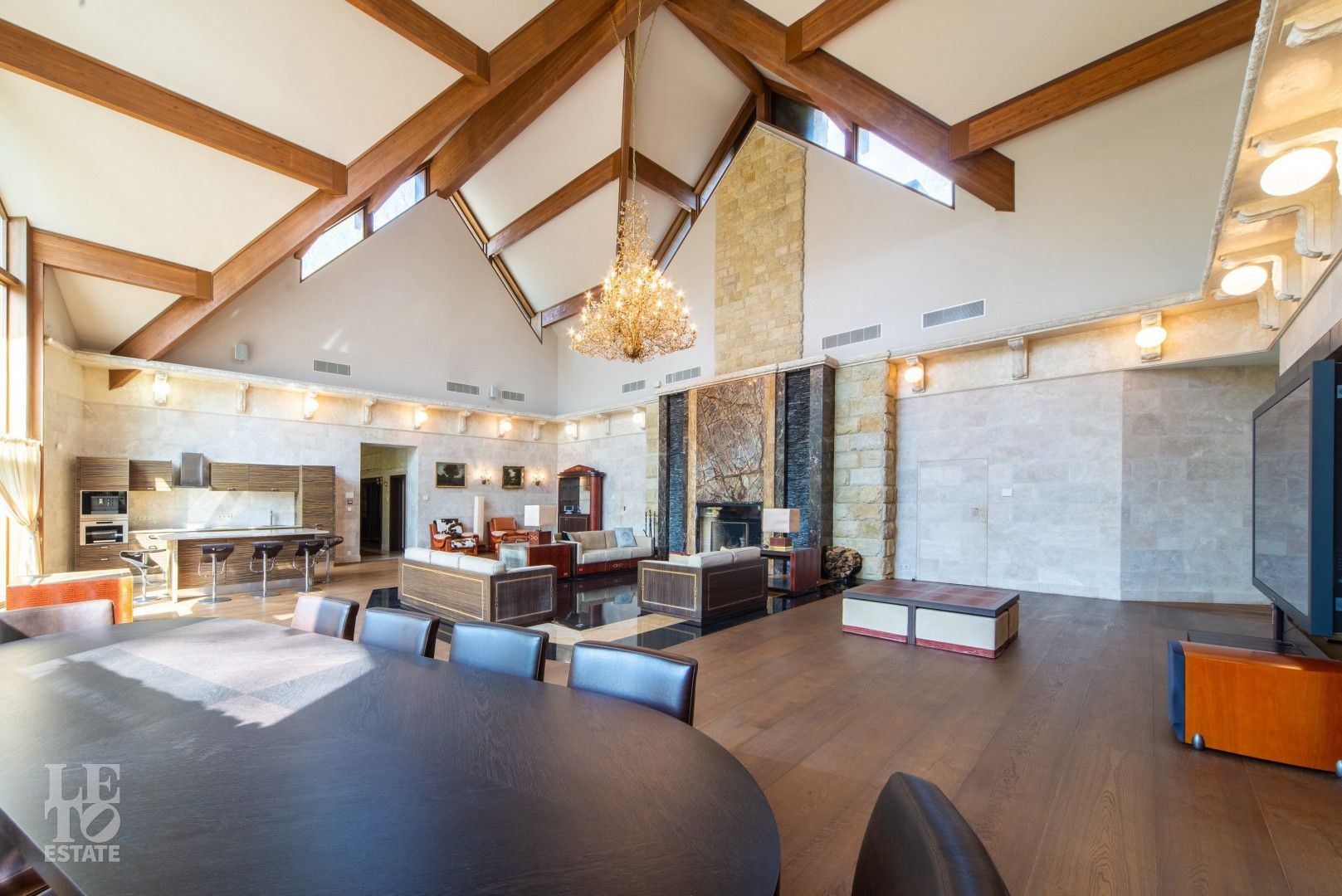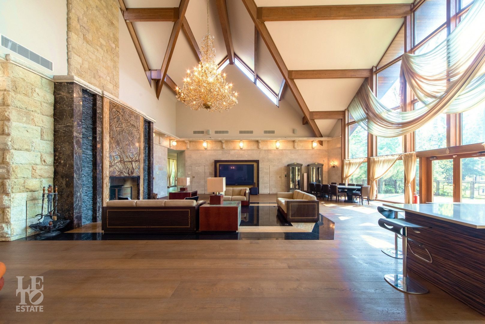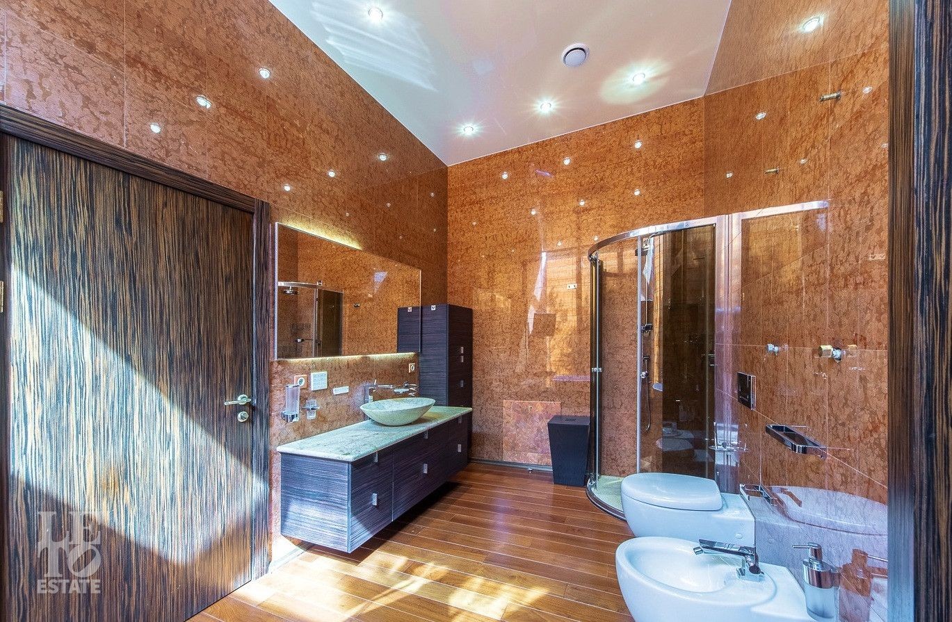 Выполнена отделка с применением ценных пород дерева, мрамора и натурального камня. Вся мебель от ведущих европейский производителей изготавливалась по индивидуальному заказу.