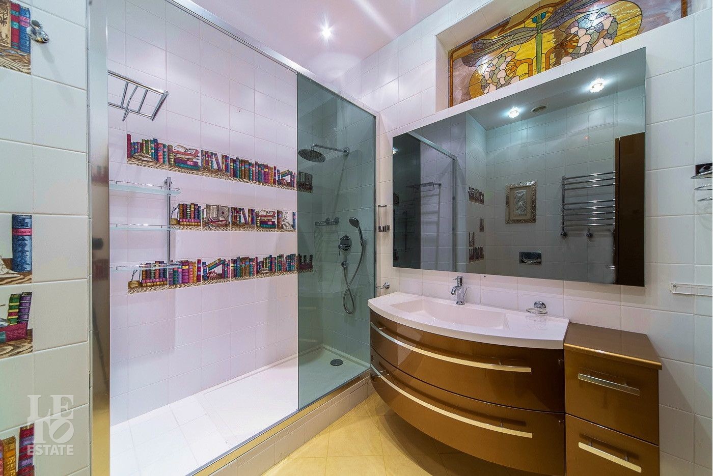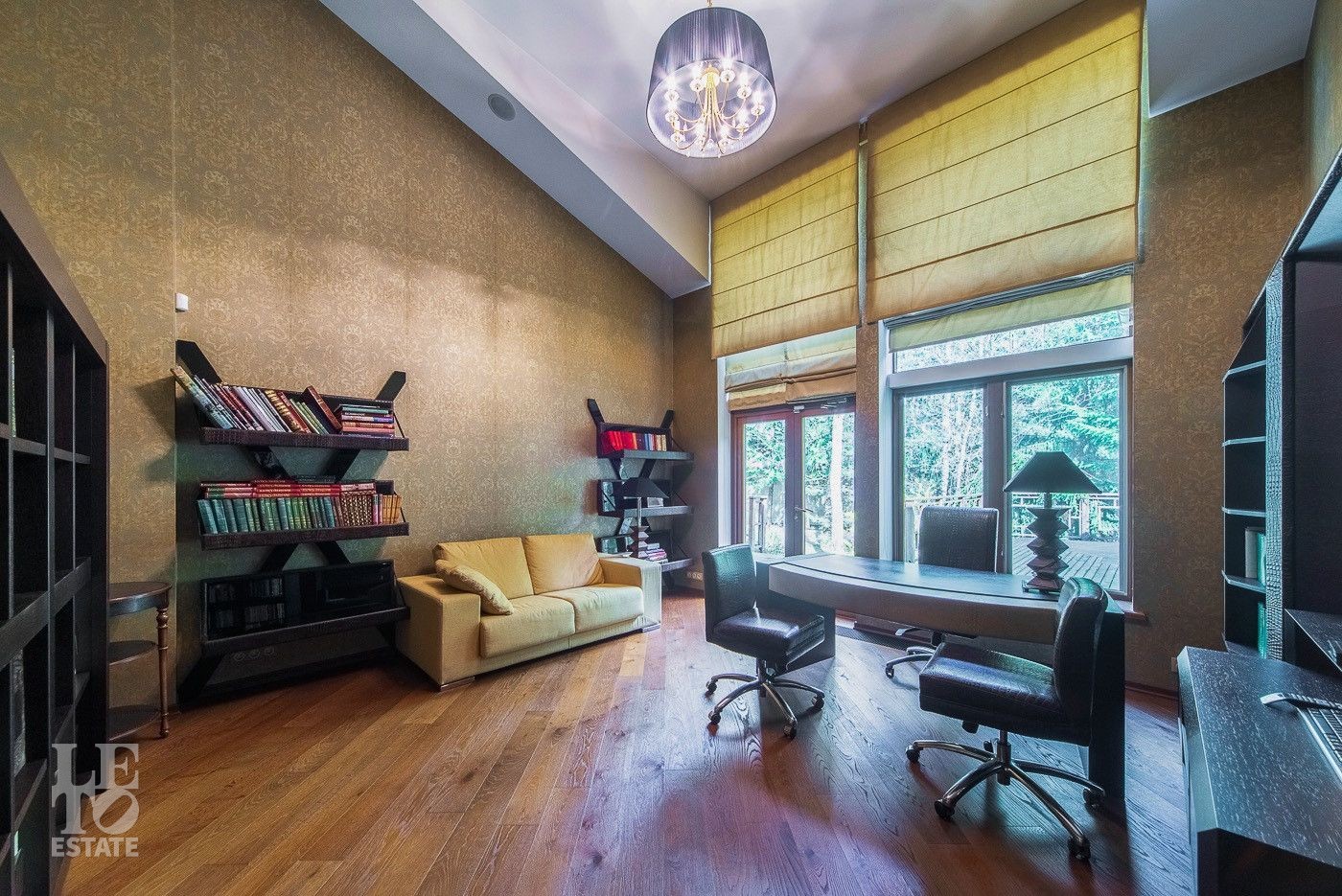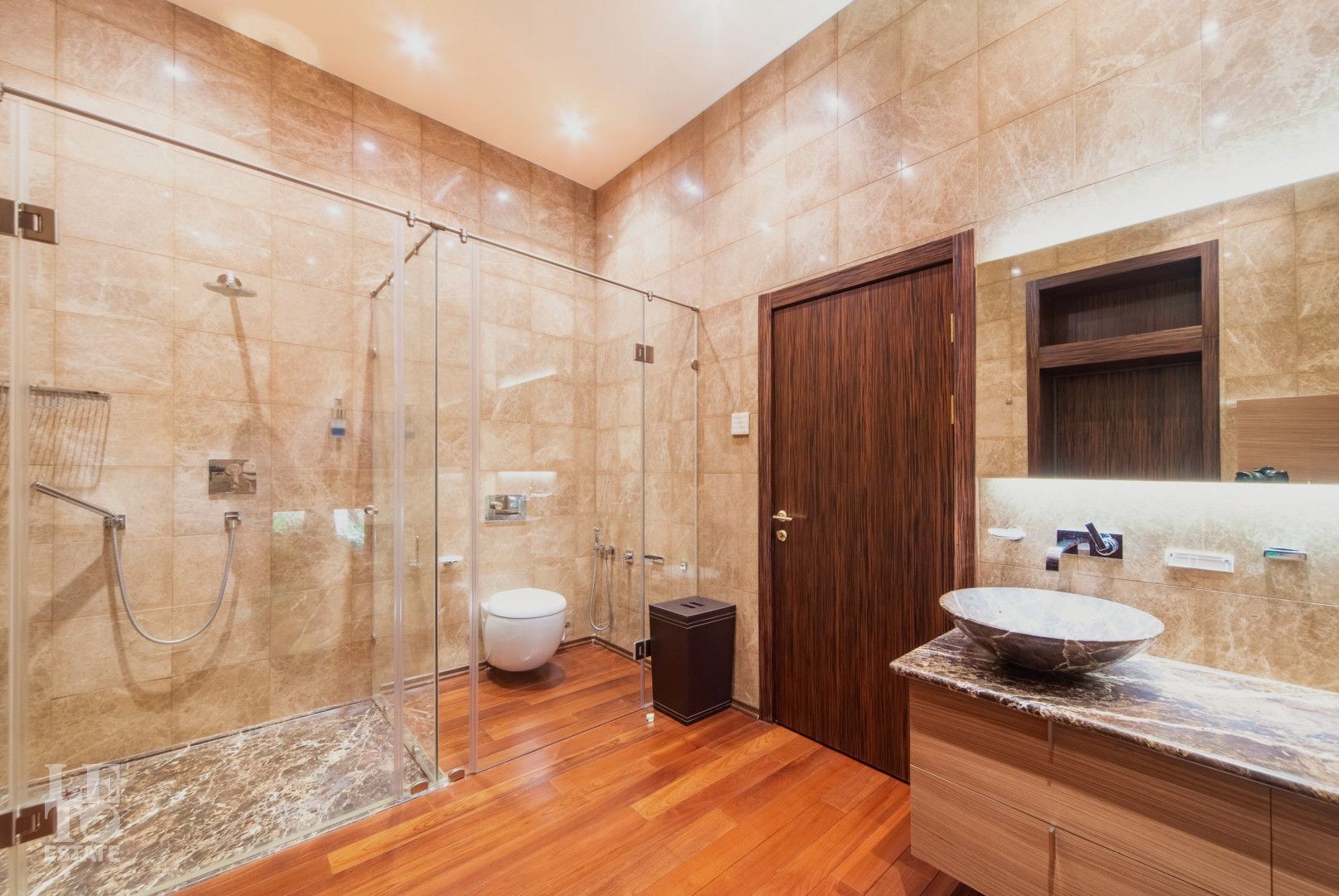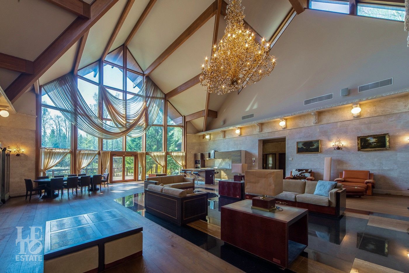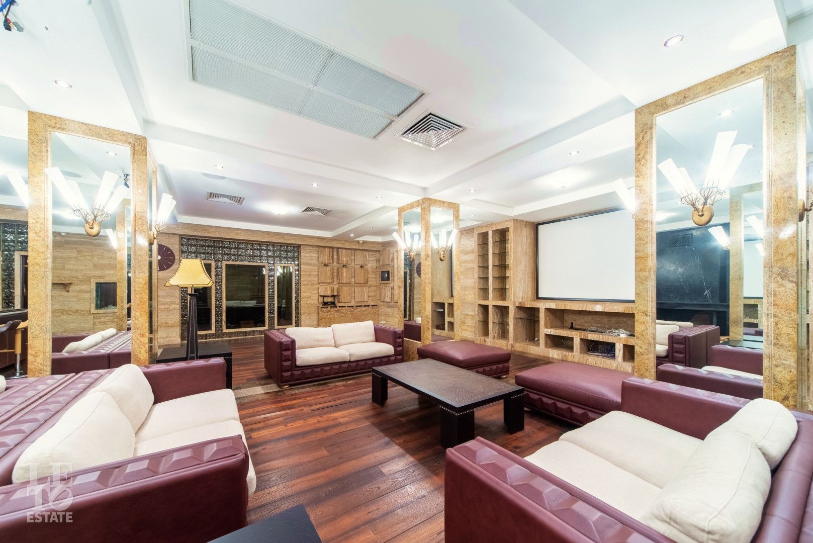 Выполнена отделка с применением ценных пород дерева, мрамора и натурального камня. Вся мебель от ведущих европейский производителей изготавливалась по индивидуальному заказу.