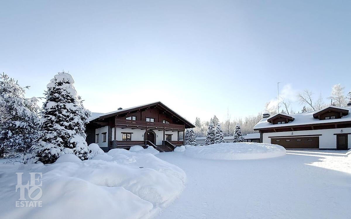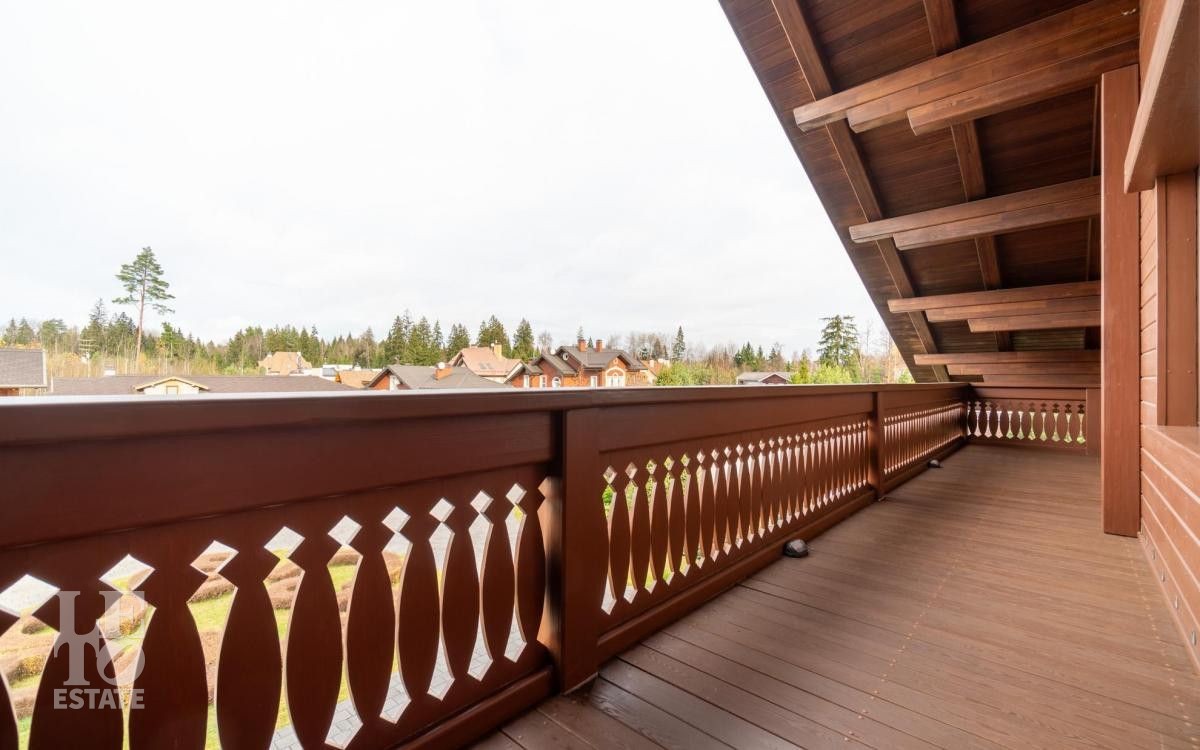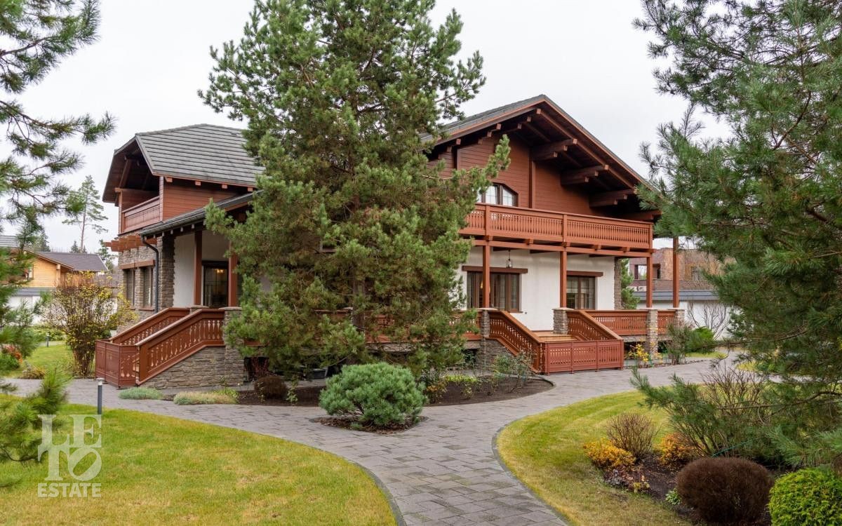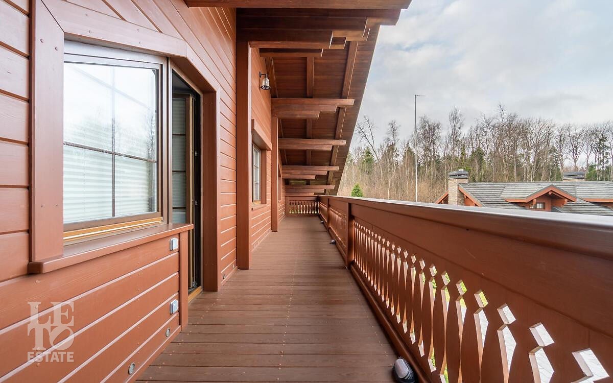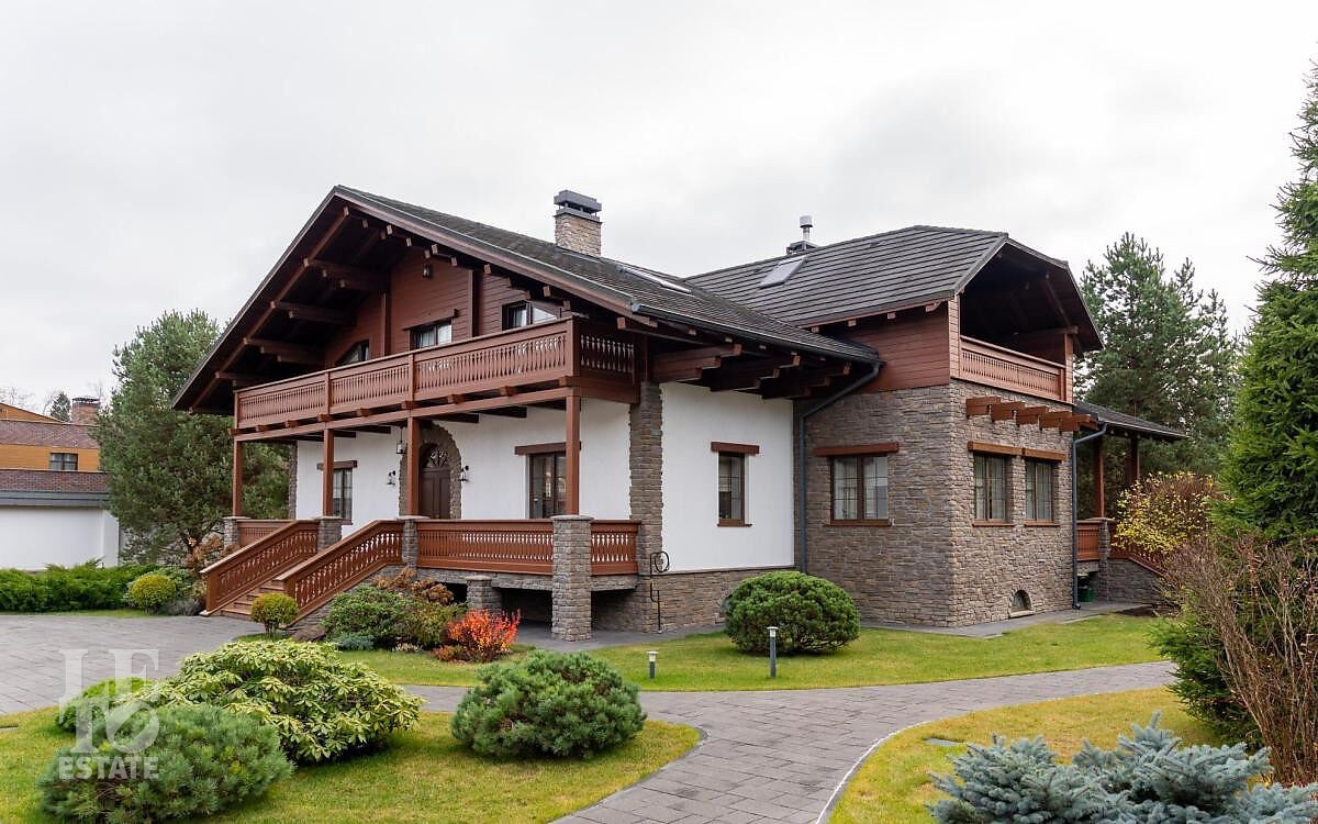 Стены из кирпича, выразительная архитектура и отделка фасада в стиле шале: первый этаж - камень, штукатурка, второй этаж - отделан лиственницей экстра-класса. Большие крытые террасы и лоджии. Дорогая композитная кровля с большими свесами, множество мощных деревянных балок и консолей. Деревянные стеклопакеты.