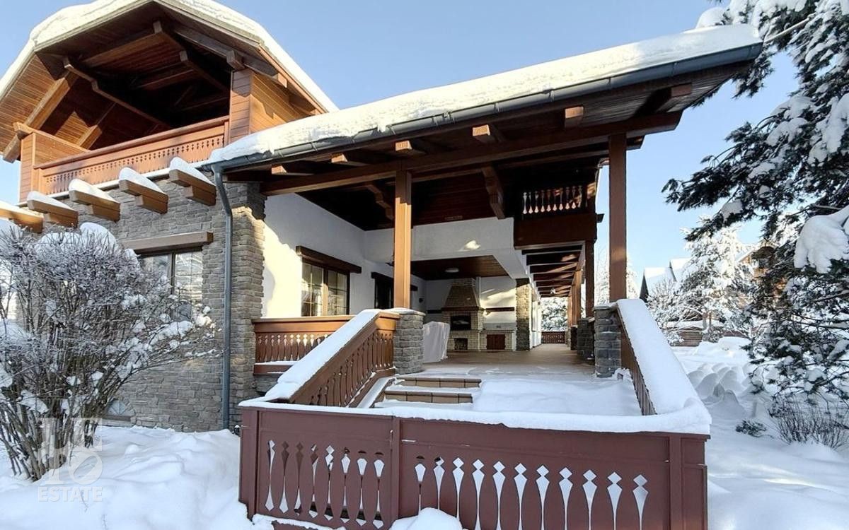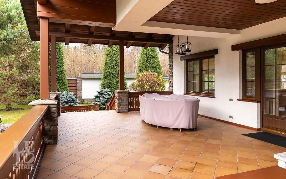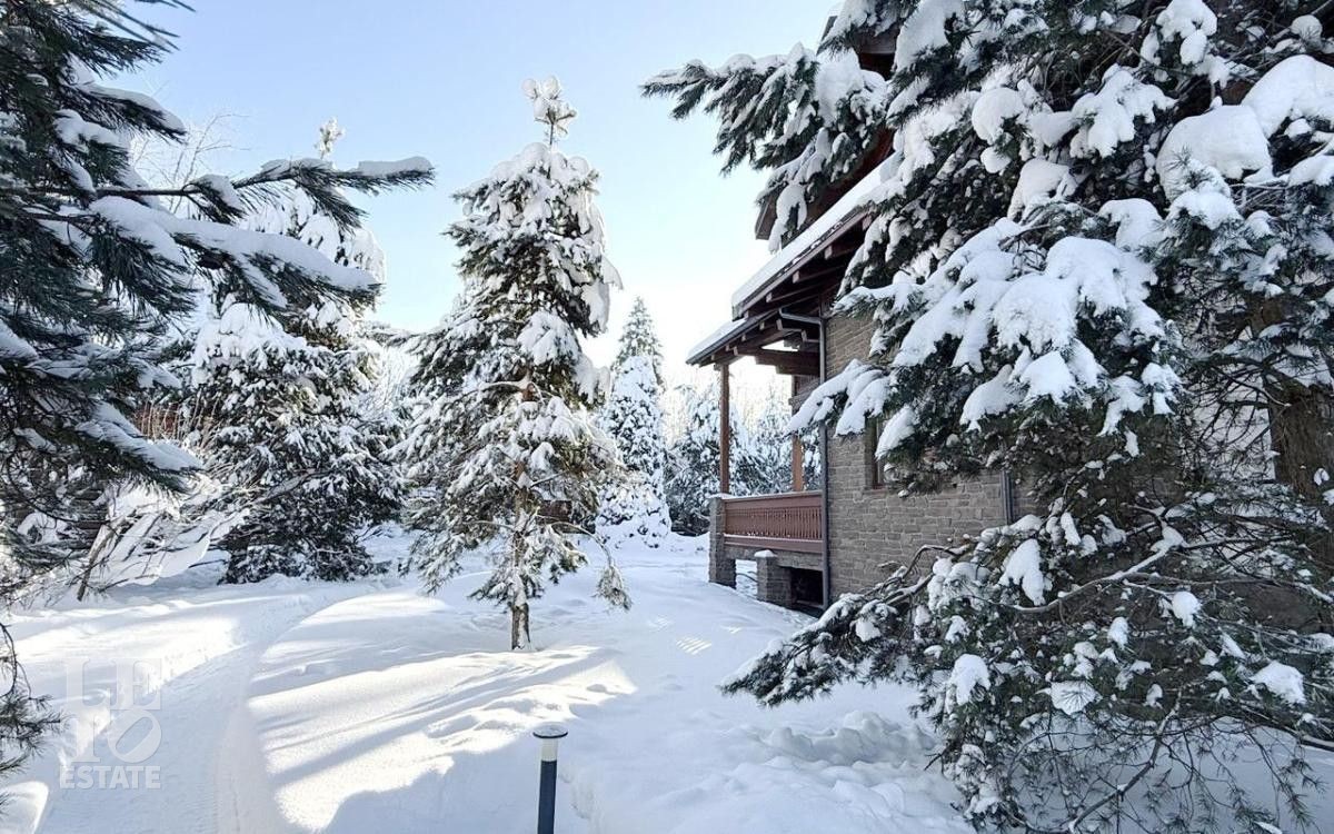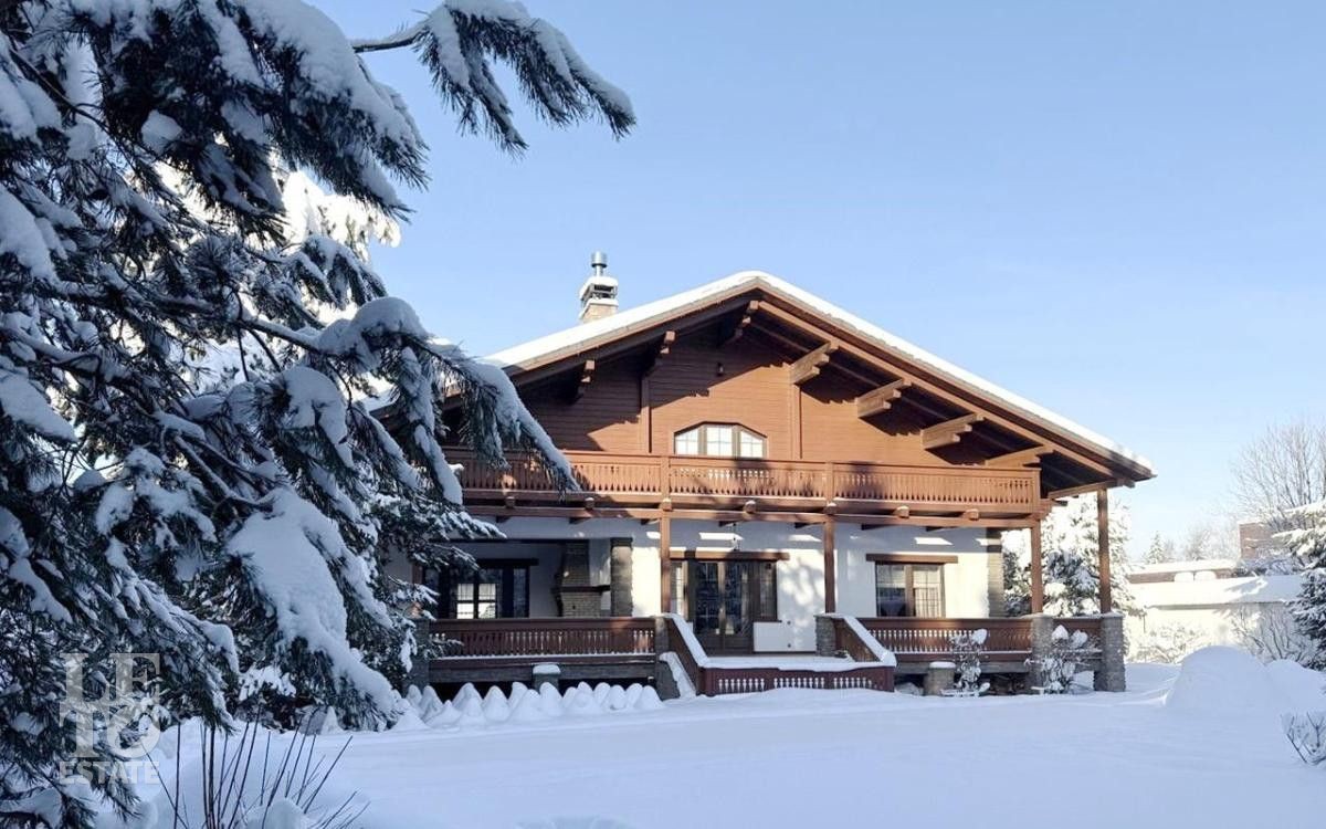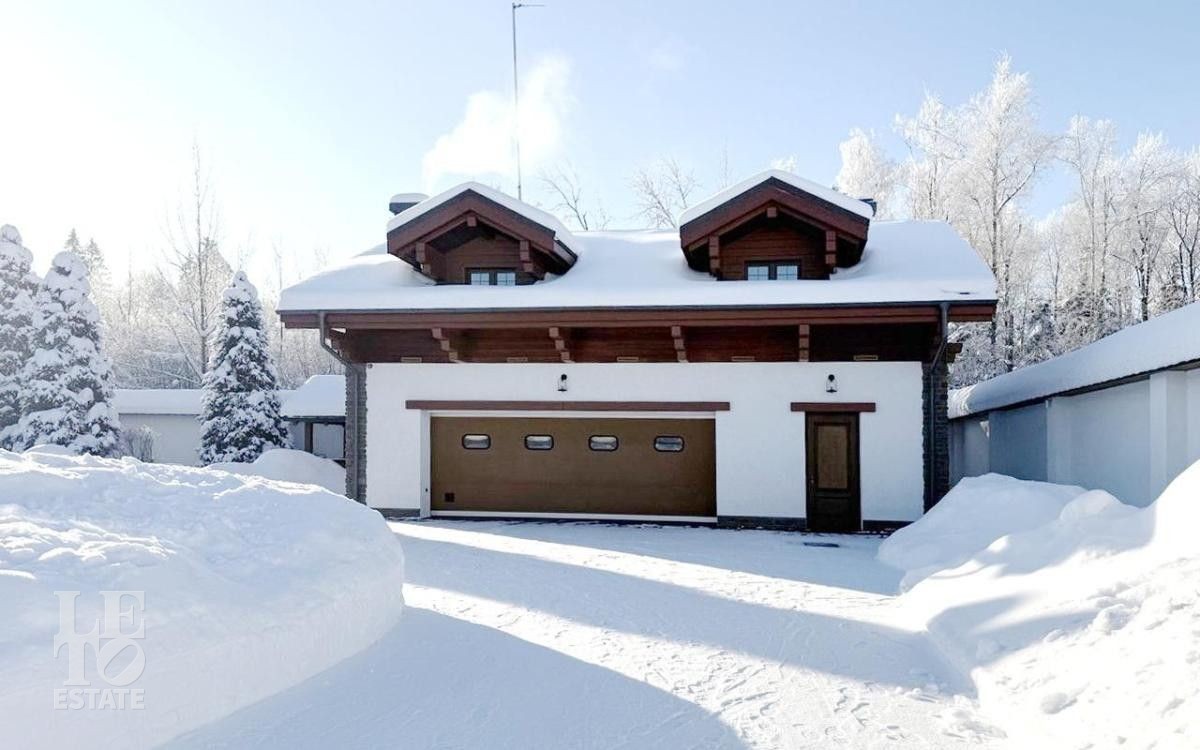 Стены из кирпича, выразительная архитектура и отделка фасада в стиле шале: первый этаж - камень, штукатурка, второй этаж - отделан лиственницей экстра-класса. Большие крытые террасы и лоджии. Дорогая композитная кровля с большими свесами, множество мощных деревянных балок и консолей. Деревянные стеклопакеты.