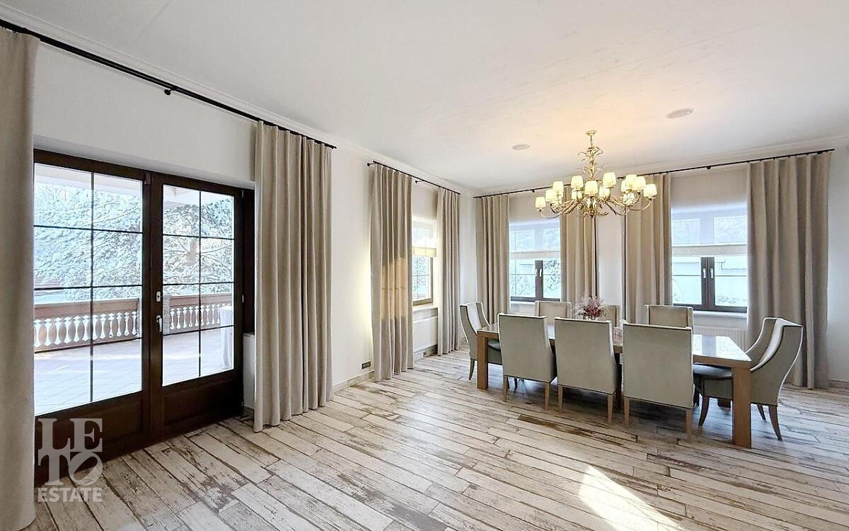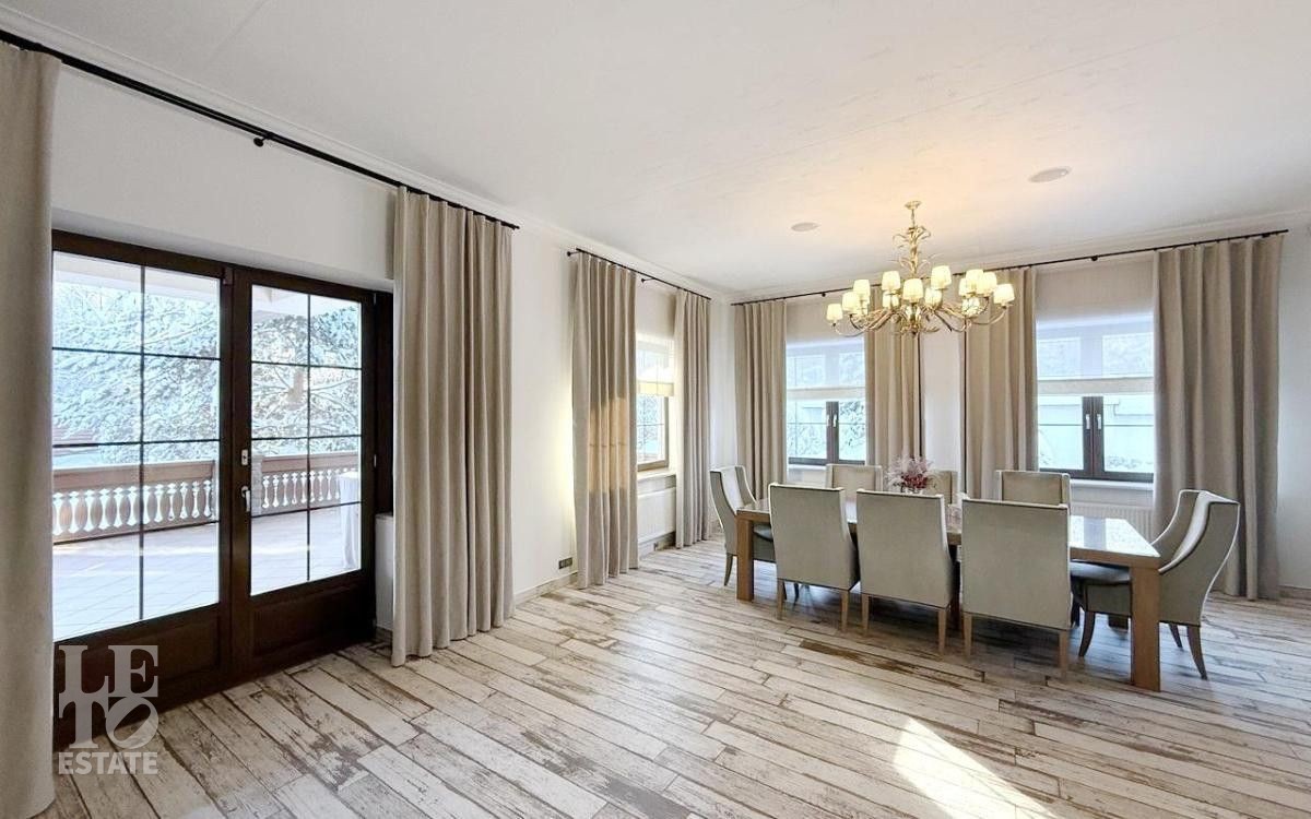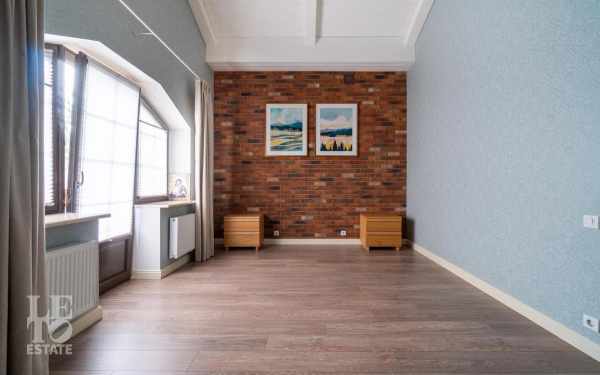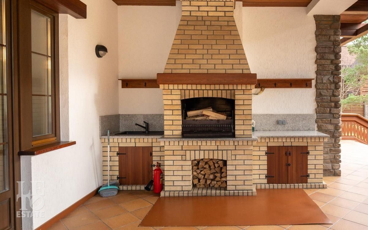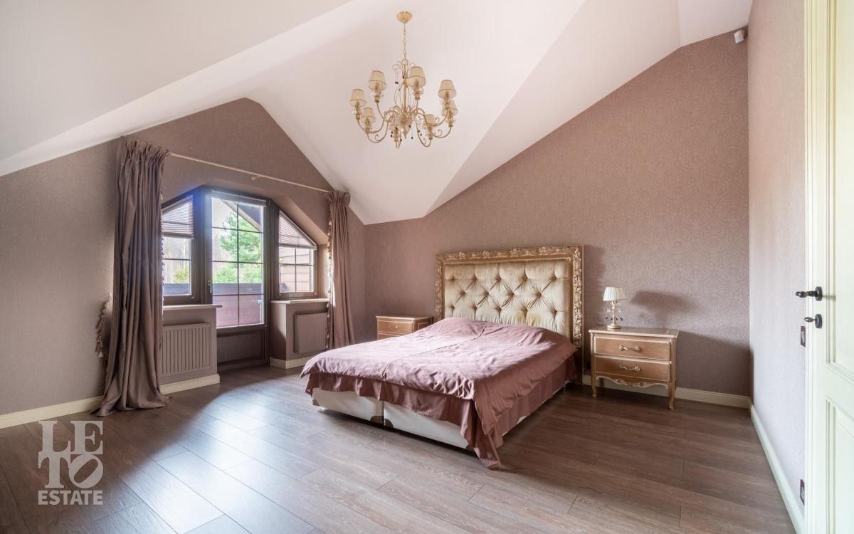 Стены из кирпича, выразительная архитектура и отделка фасада в стиле шале: первый этаж - камень, штукатурка, второй этаж - отделан лиственницей экстра-класса. Большие крытые террасы и лоджии. Дорогая композитная кровля с большими свесами, множество мощных деревянных балок и консолей. Деревянные стеклопакеты.