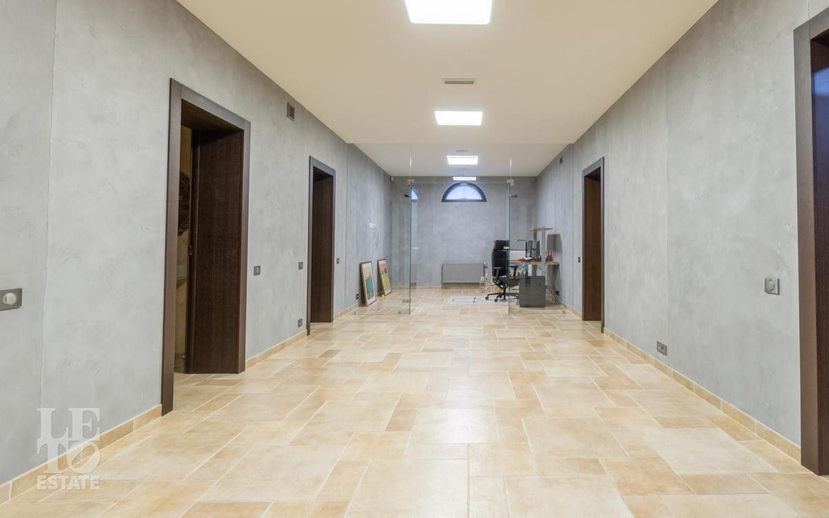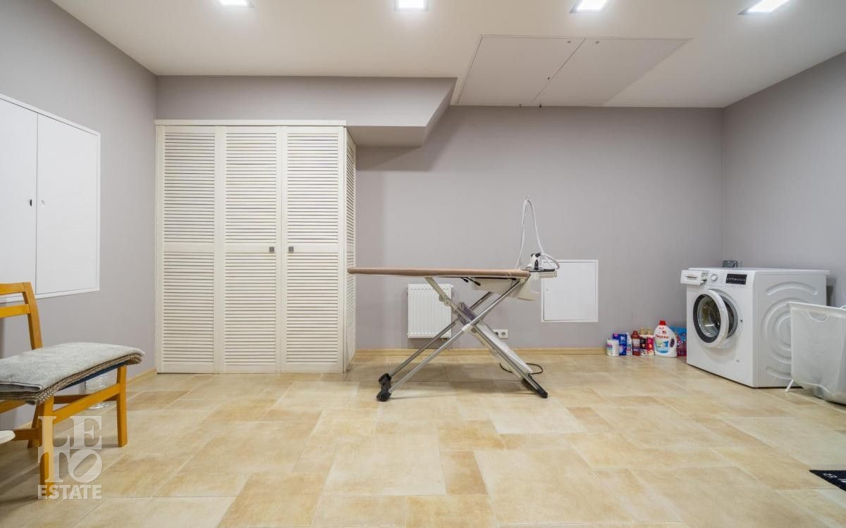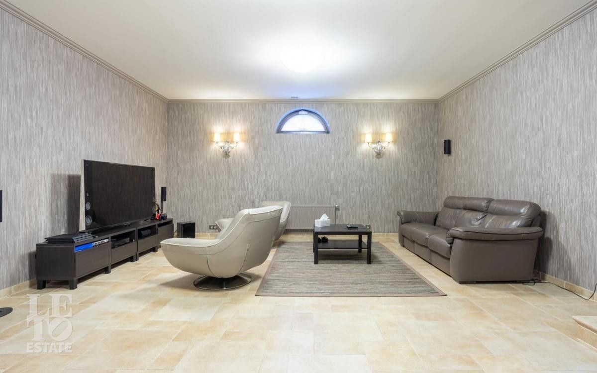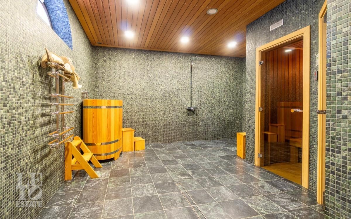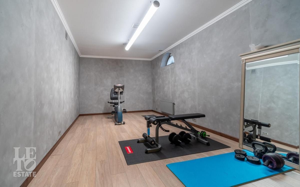 Цокольный этаж: гардеробная, кладовая, кабинет, тренажерный зал, постирочная, кладовка, санузел, комната отдыха с кинотеатром и кухней, сауна, парная, раздевалка, купель.