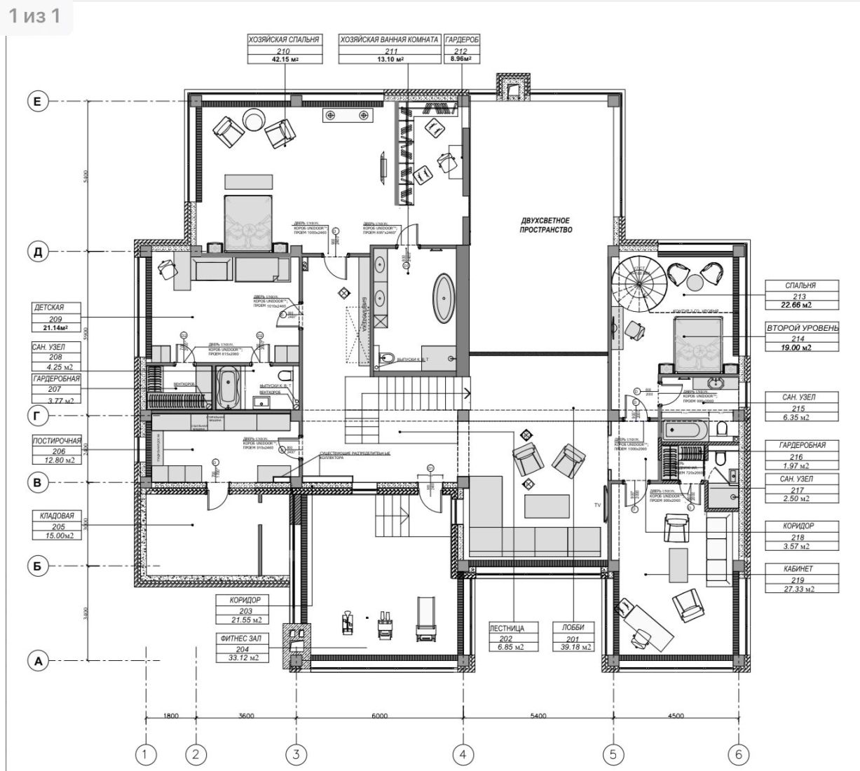 Второй этаж: холл со вторым светом, 2 кабинета со своими санузлами, детская с санузлом и гардеробной, мастер-спальня с санузлом и гардеробом, спортзал, постирочная с хозяйственным блоком.