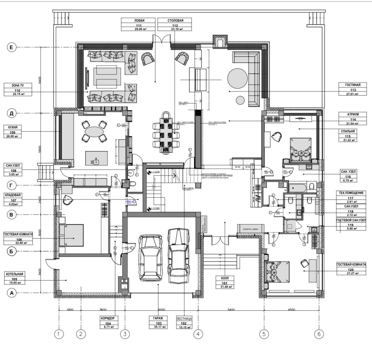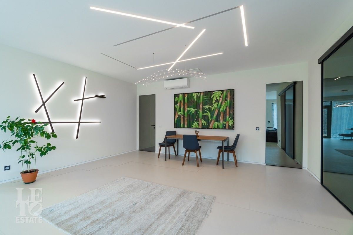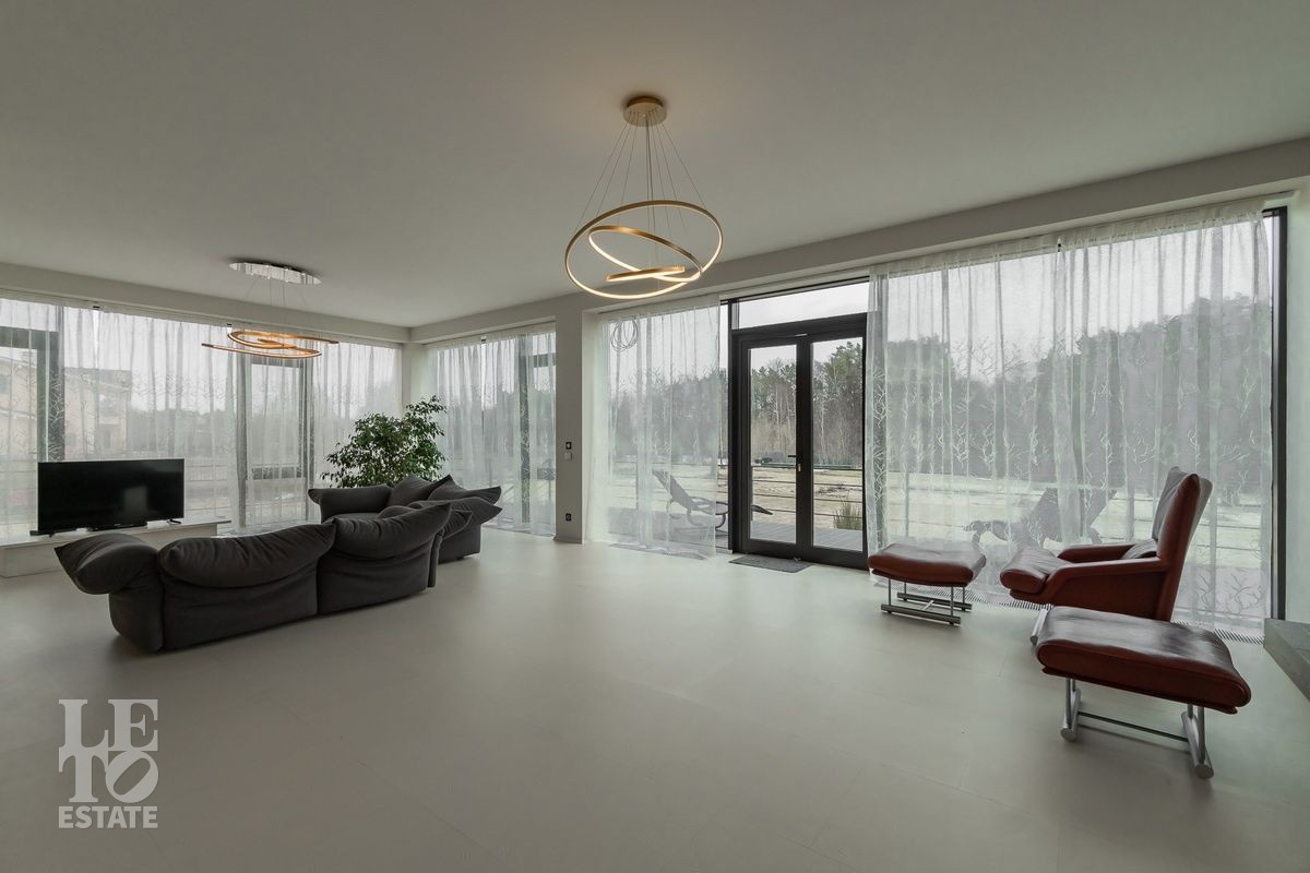 Первый этаж: прихожая, просторная гостиная с выходом на террасу, кухня с кладовой, 2 гостевые спальни, 2 санузла, мастер спальня с санузлом, гардеробная, серверная, котельная, гараж на 2 машиноместа.