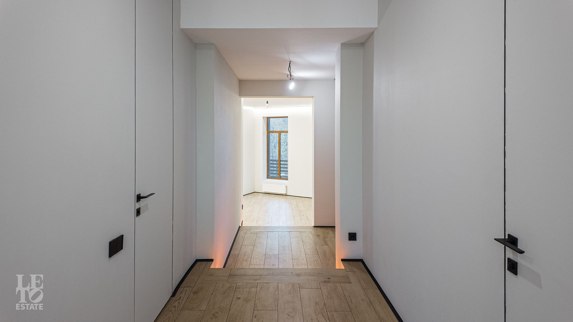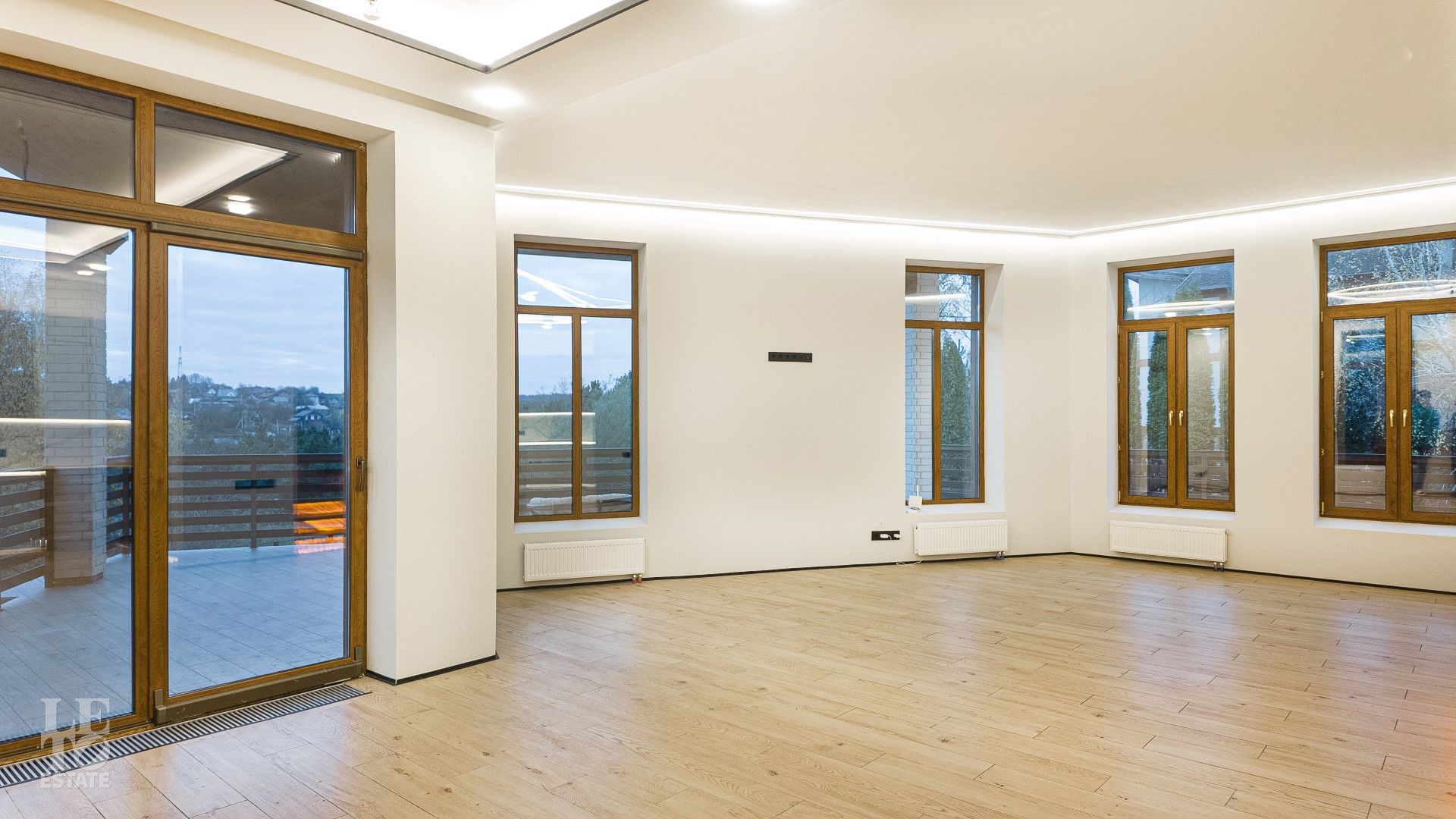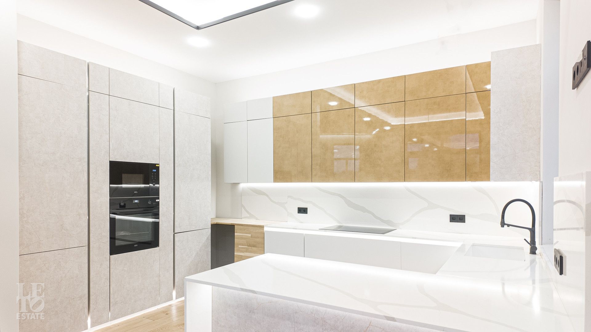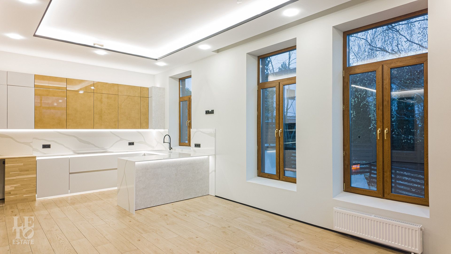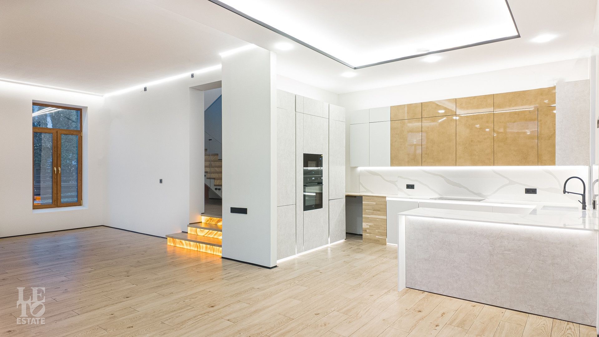 На площади 282,9 кв. м создан современный дизайнерский интерьер с использованием премиальных европейских материалов. Полы из натурального дубового паркета дарят тепло и уют, а стены, отделанные крупноформатным керамогранитом Laminam, подчеркивают монументальность и стиль. Высокие трехметровые двери скрытого монтажа с итальянской фурнитурой и автоматическими выдвижными порогами создают ощущение единого пространства и обеспечивают идеальную шумоизоляцию.
