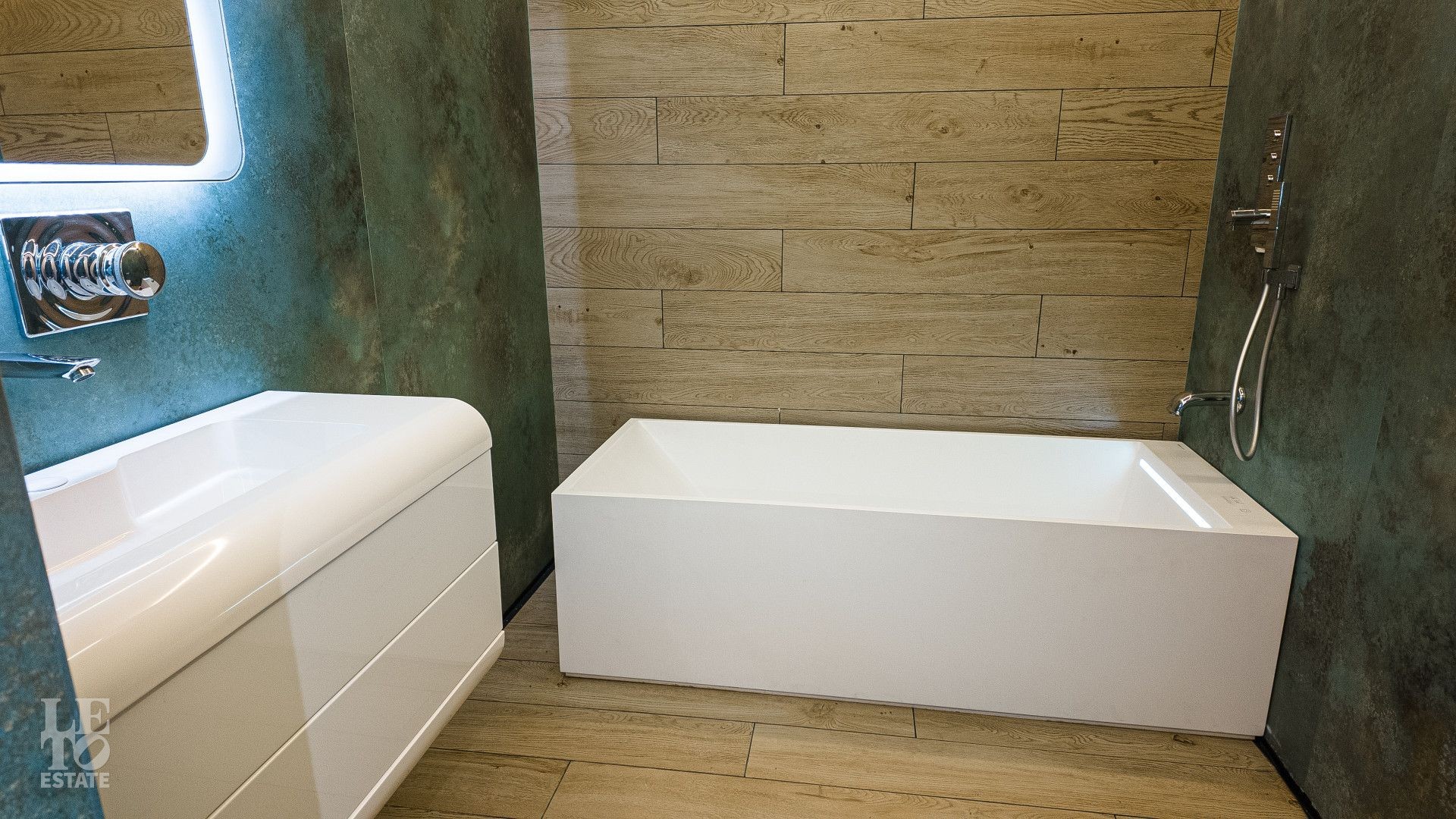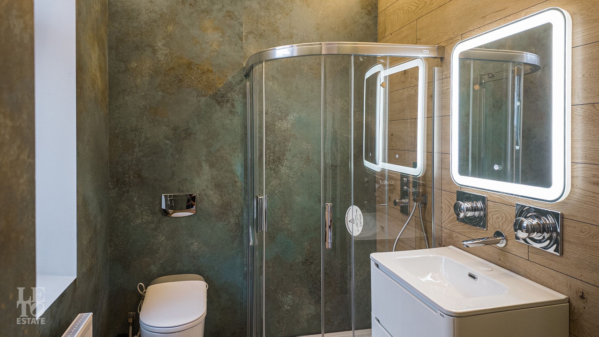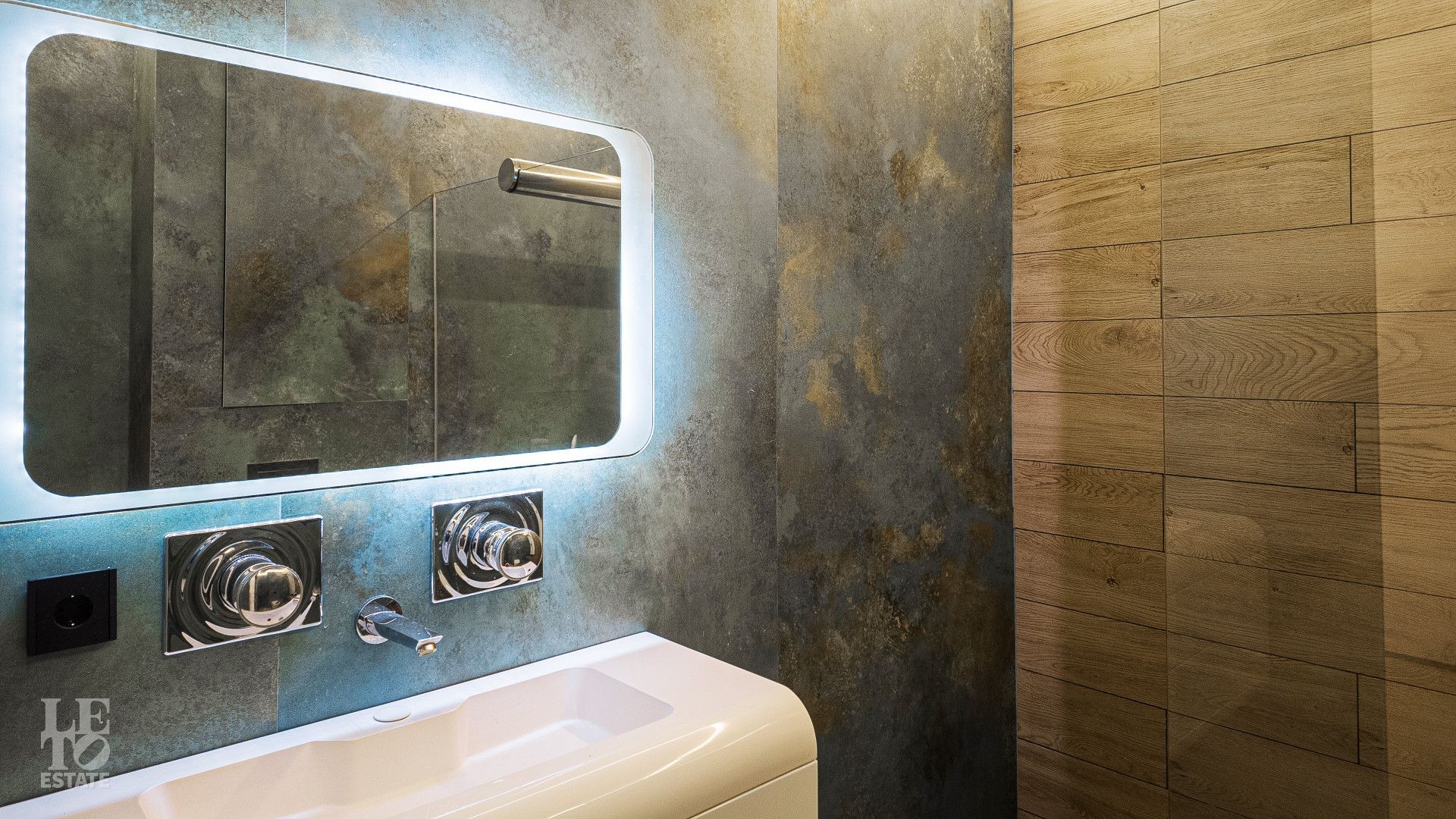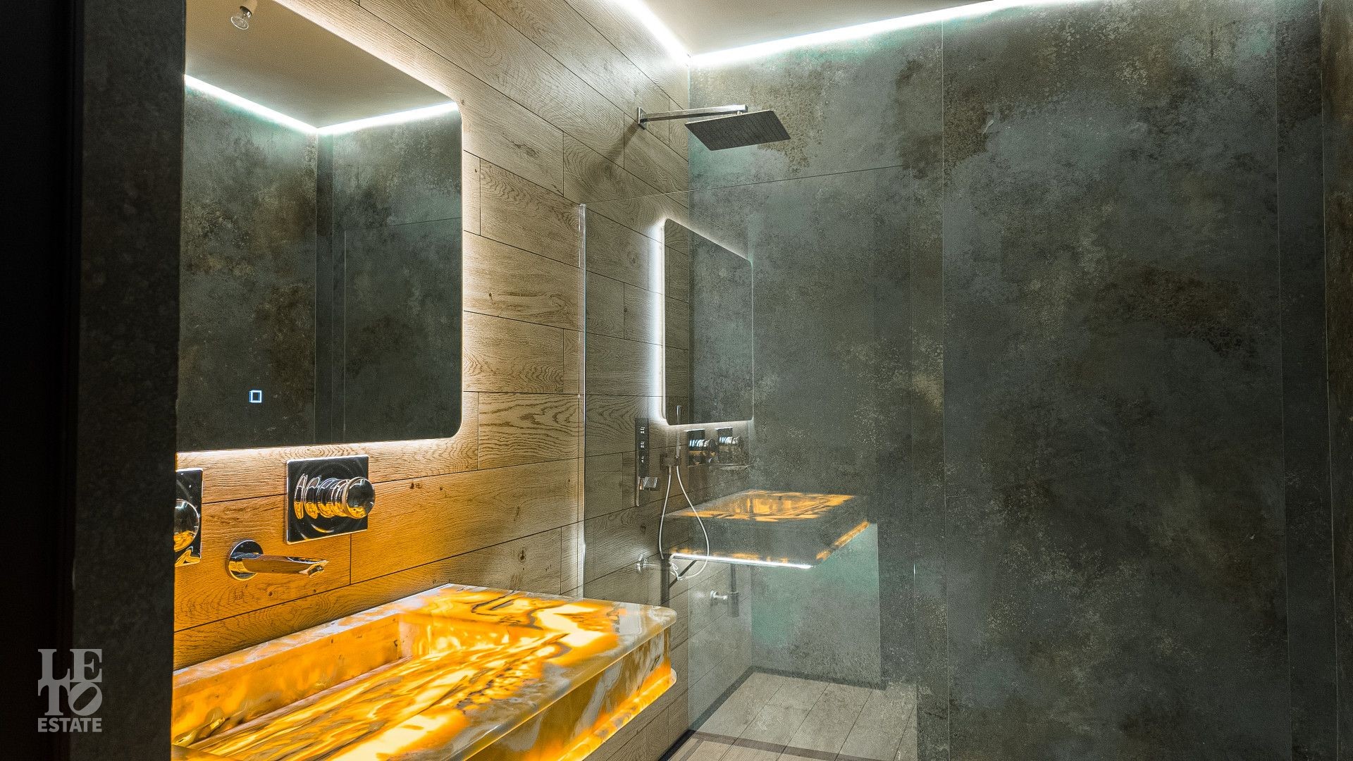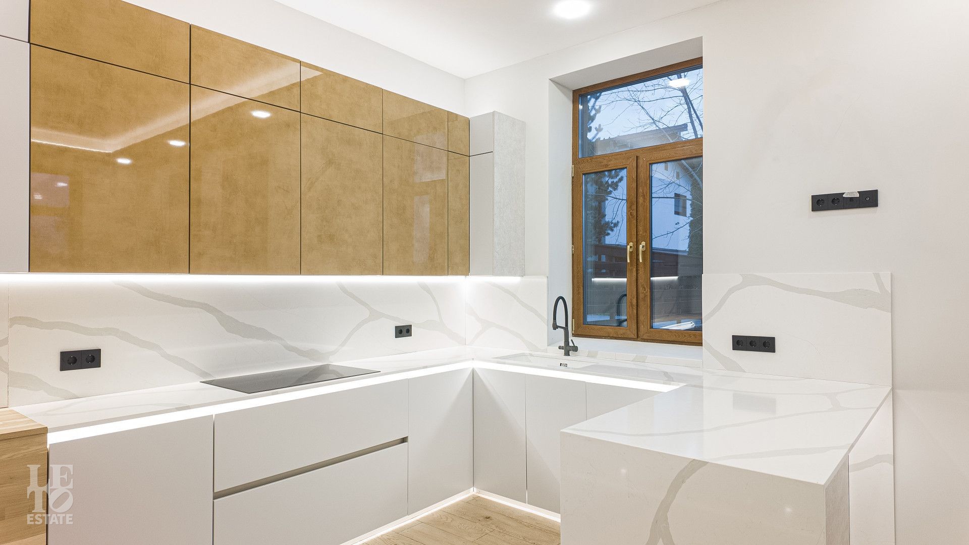 На площади 282,9 кв. м создан современный дизайнерский интерьер с использованием премиальных европейских материалов. Полы из натурального дубового паркета дарят тепло и уют, а стены, отделанные крупноформатным керамогранитом Laminam, подчеркивают монументальность и стиль. Высокие трехметровые двери скрытого монтажа с итальянской фурнитурой и автоматическими выдвижными порогами создают ощущение единого пространства и обеспечивают идеальную шумоизоляцию.