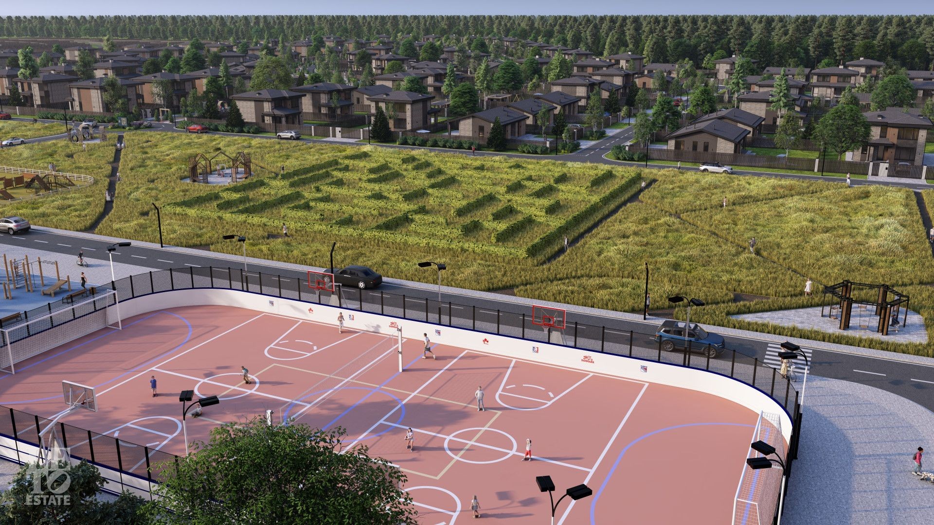 В спортивной зоне две площадки: Для индивидуальных занятий — с брусьями, турниками, скамьями для пресса и рукоходами. Для командных игр — футбола, баскетбола, волейбола.