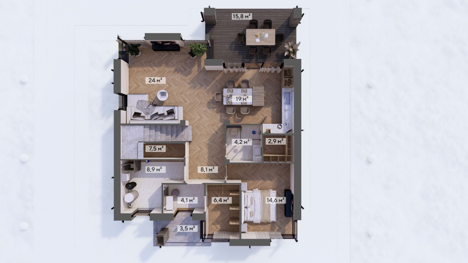 На первом этаже вас встретит просторная кухня-гостиная с угловыми окнами в пол — идеальная обстановка для семейных ужинов, игр и кинопросмотров. Здесь же расположена гостевая спальня, которая понравится старшим родителям или превратится в комфортный видовой кабинет.