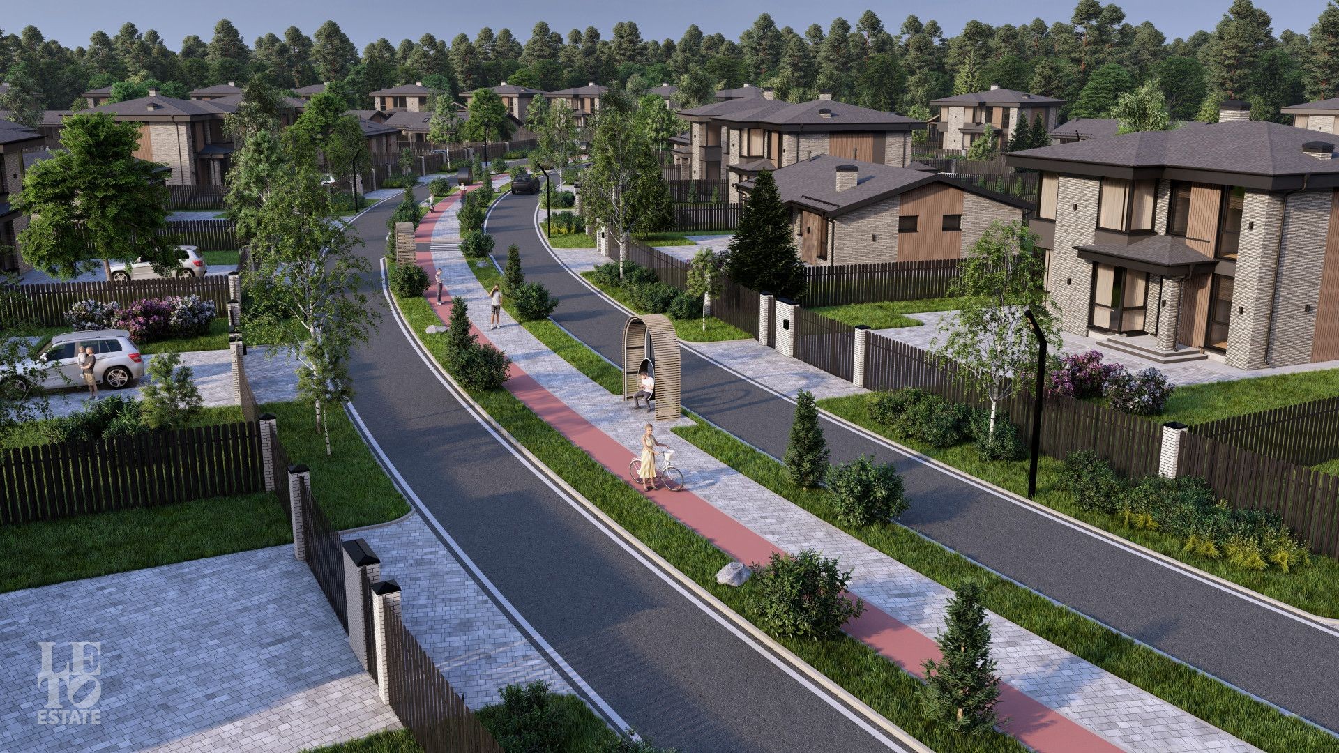 Все дома в поселке спроектированы в едином лаконичном стиле архитектурным бюро Антона Петаниди и гармонично вписаны в природный ландшафт. По всей территории посёлка растут деревья, кустарники и газонная трава. За зеленью следят садовники, чтобы она всегда радовала глаз. Для прогулок есть мощёные тротуары шириной до 2 метров, а для отдыха — удобные скамейки.