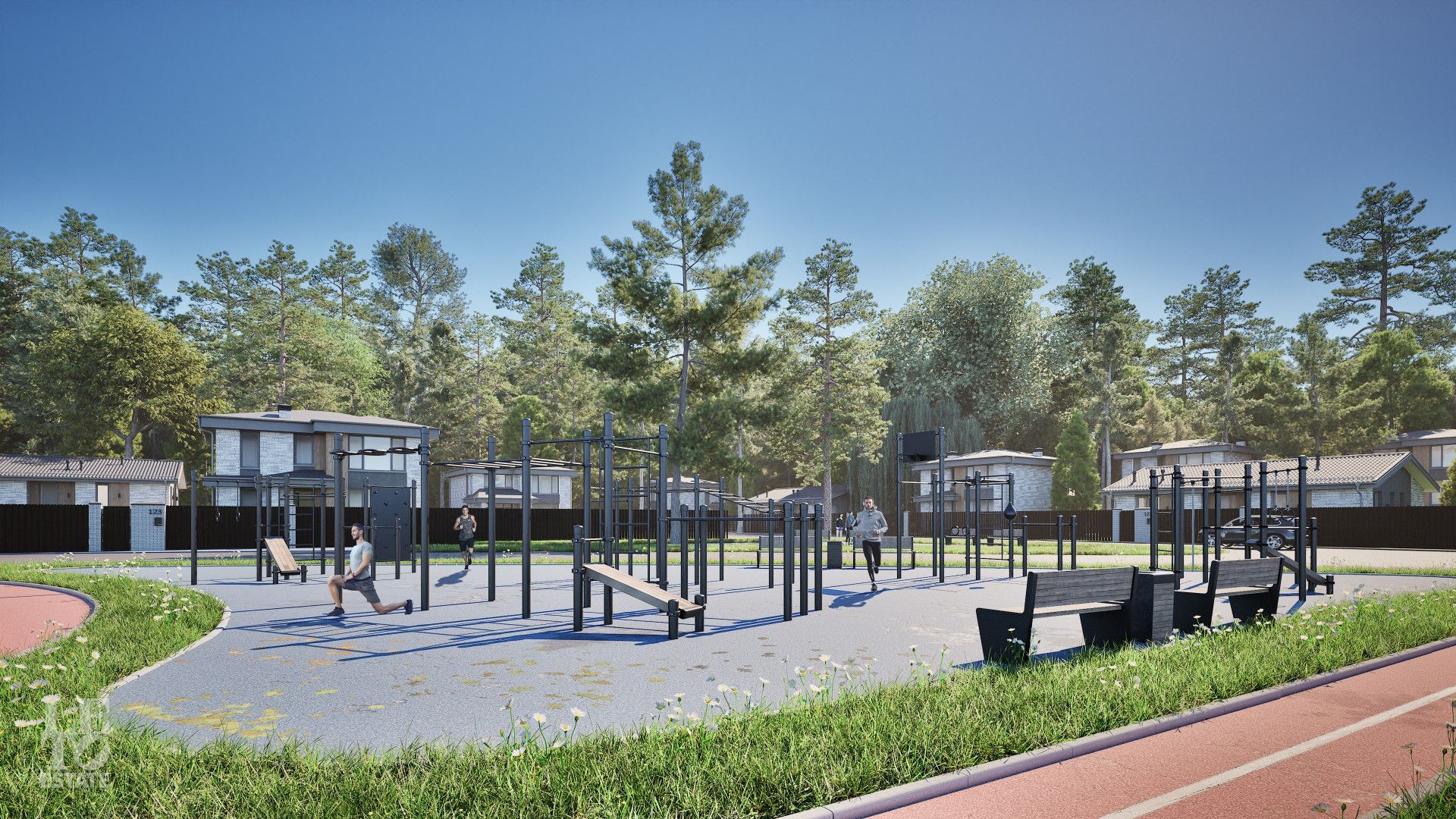 В спортивной зоне две площадки: Для индивидуальных занятий — с брусьями, турниками, скамьями для пресса и рукоходами. Для командных игр — футбола, баскетбола, волейбола.