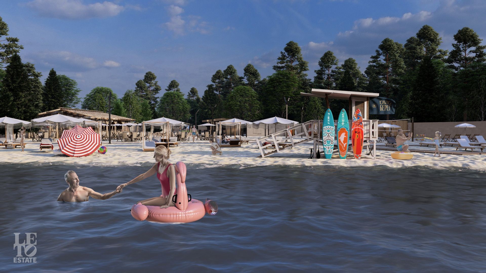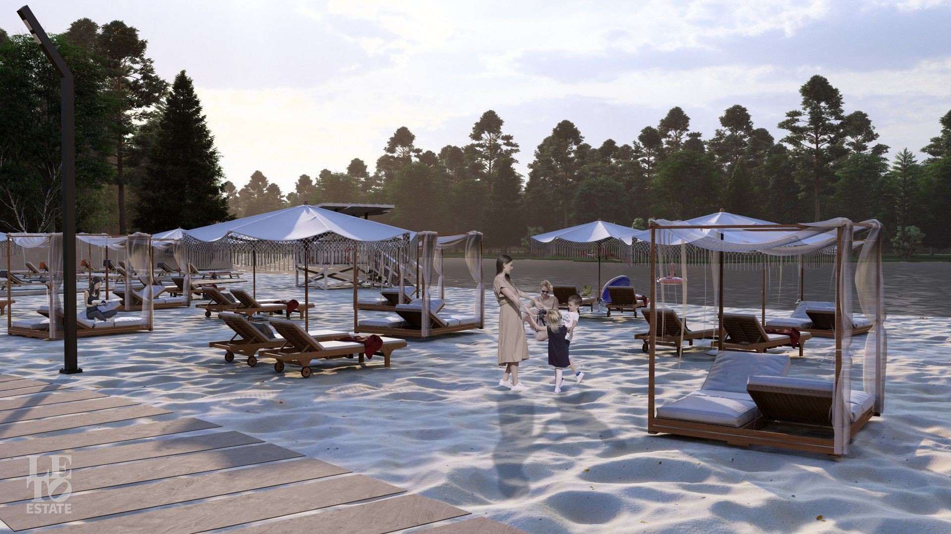 Собственный пляж, как на курорте. Берег залива обустроен для комфортного отдыха: здесь мягкий золотистый песок, лежаки, зонтики, кафе и бар. Пляж отделён от большой воды, поэтому рядом не будет никаких лодок, судов и катеров.
