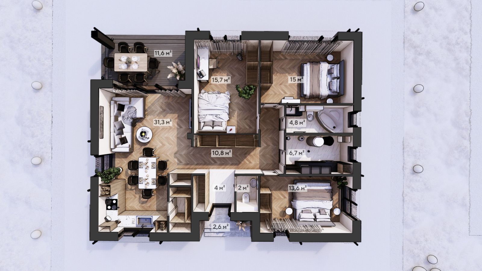 прихожая, санузел, гардеробная, кухня гостиная, ванная комната, котельная, три спальни.