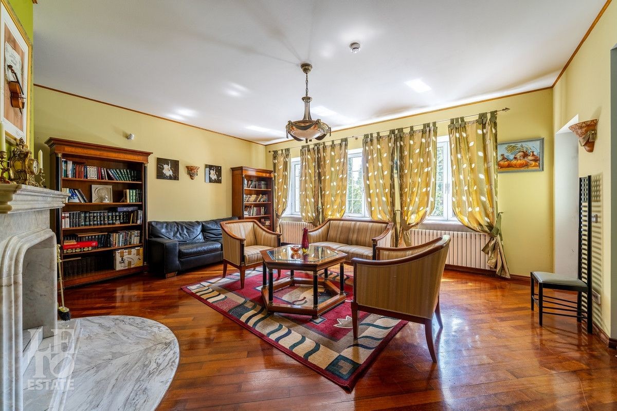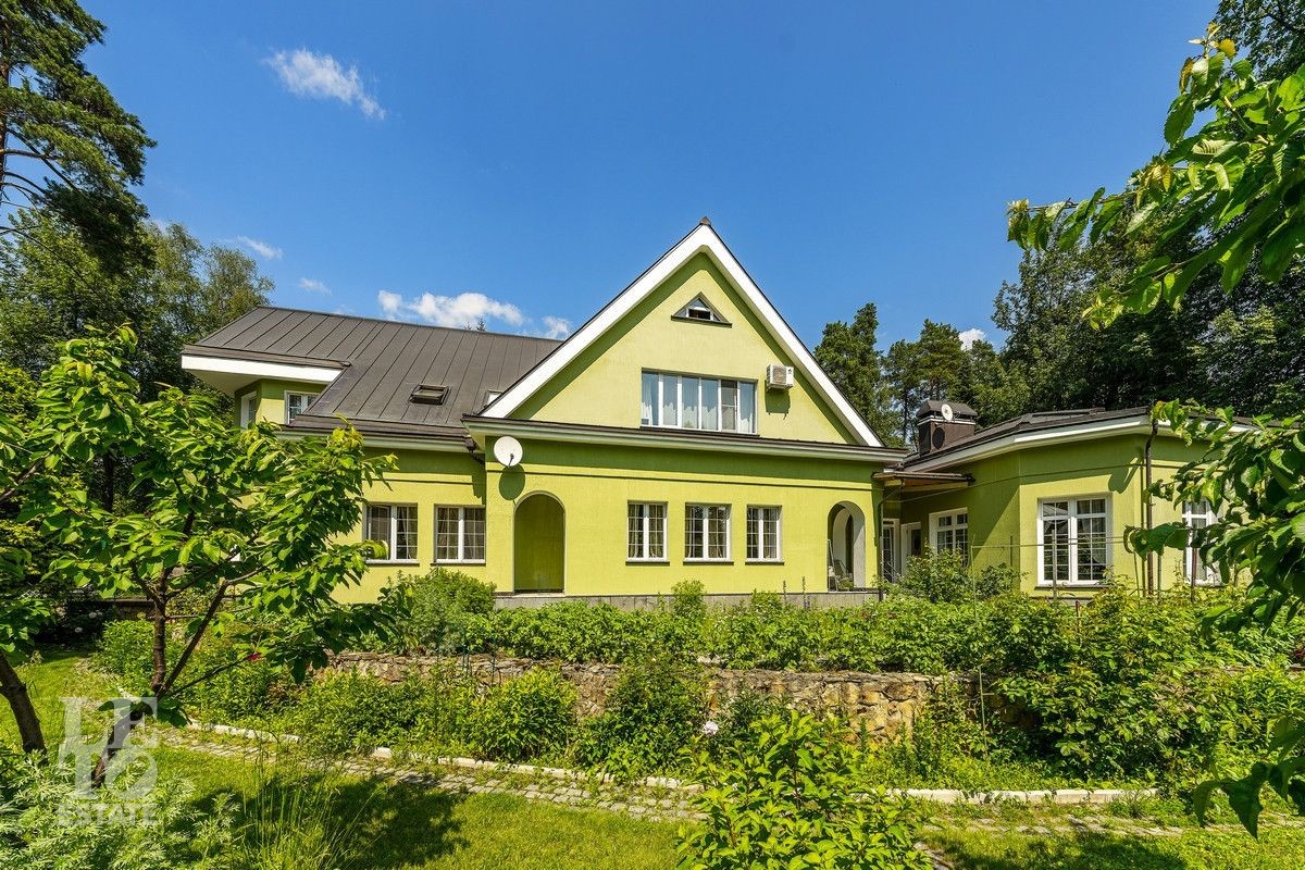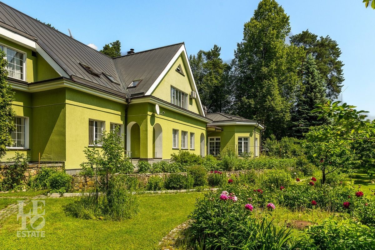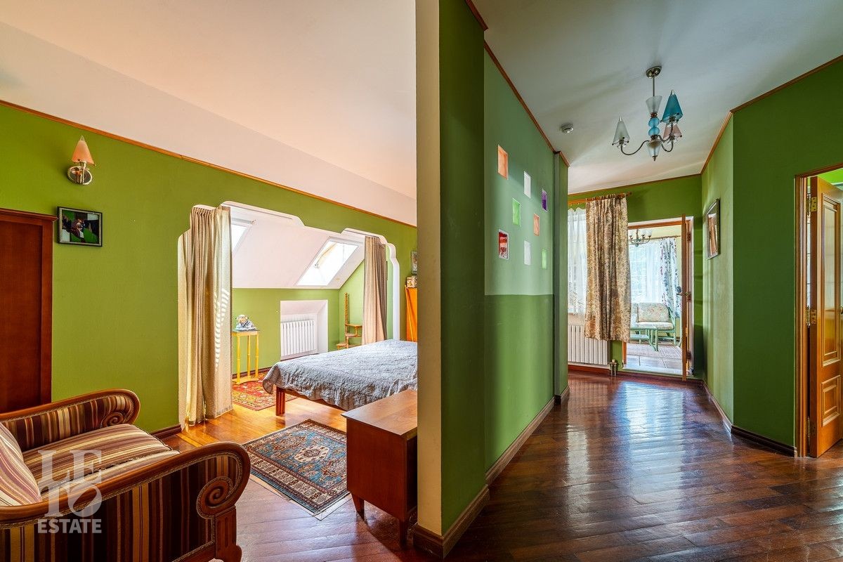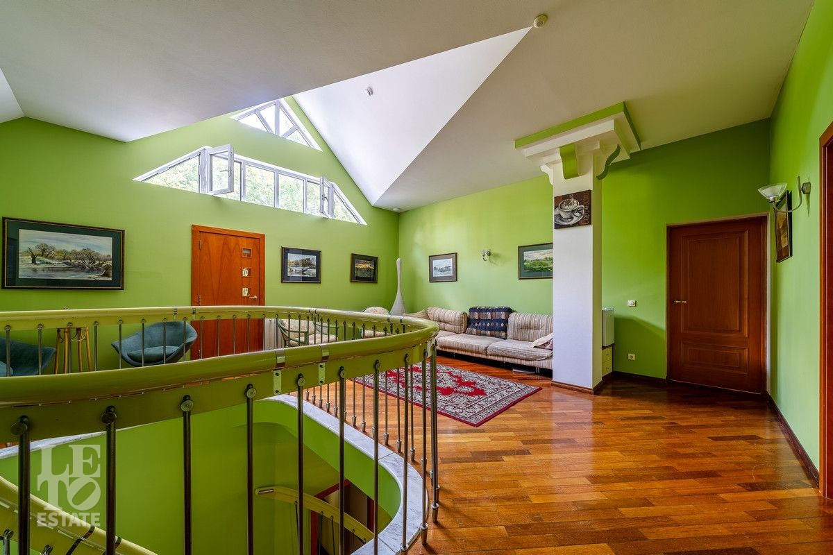 Дом «под ключ» площадью 675,8 кв. м построен в два уровня на живописном участке 26 соток и станет прекрасным местом для большой дружной семьи. В доме тщательно продумана организация пространства: семь просторных спален, две гостиные для тёплых семейных вечеров, кухня с выходом на открытую веранду, где особенно приятно проводить утро за чашкой кофе, а также кабинет для уединённой работы, очаровательный зимний сад, изолированный блок для персонала и функциональные помещения для хранения и досуга. Дом построен с соблюдением всех строительных норм и требований: фундамент — ленточный; стены первого этажа — кирпичные; в мансардной части — деревянные (брус 200×200 мм); перекрытия — железобетонные; в мансардной части — деревянные; кровля — медная. В 2021 году была проведена перепланировка и выполнены косметические работы.