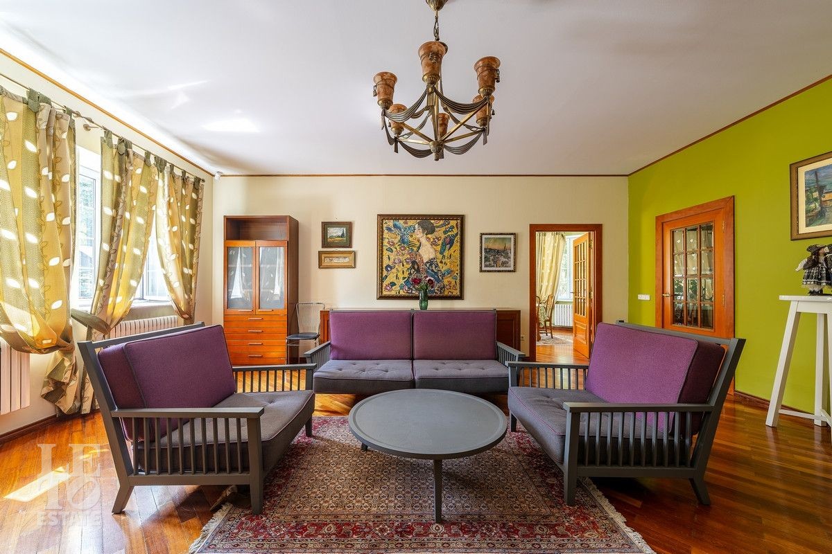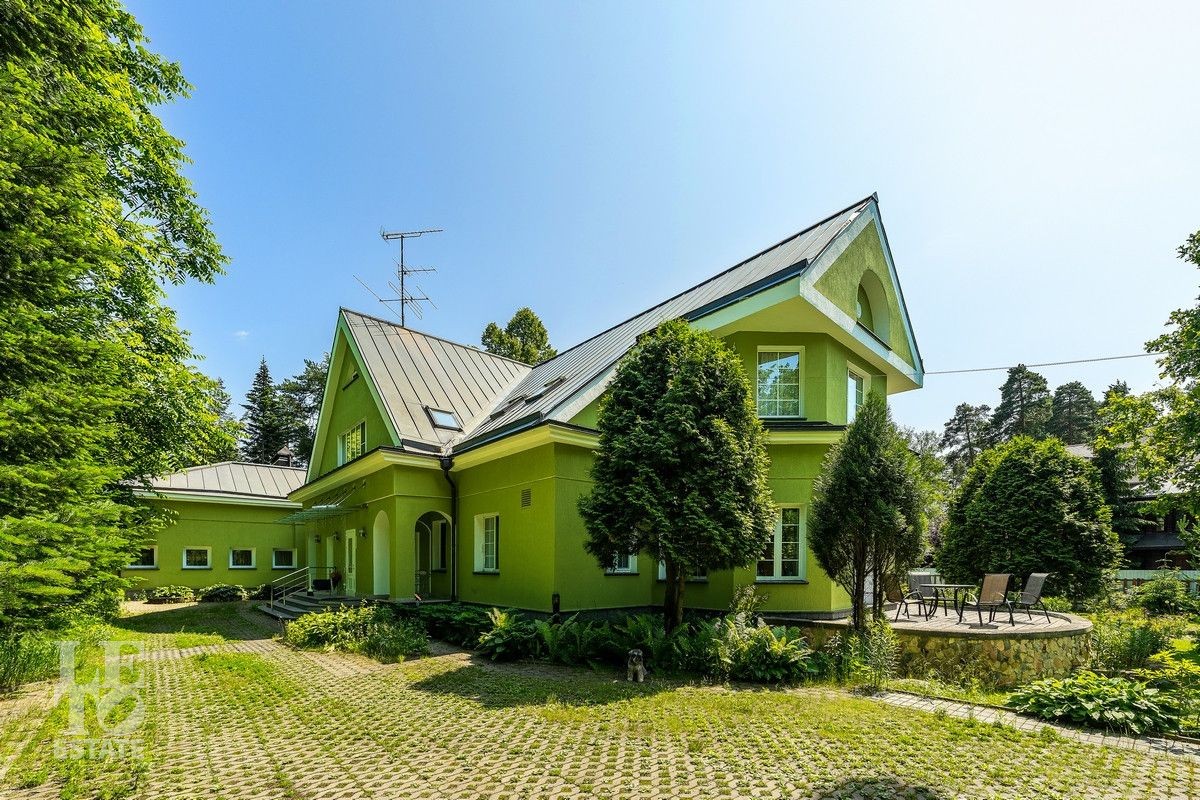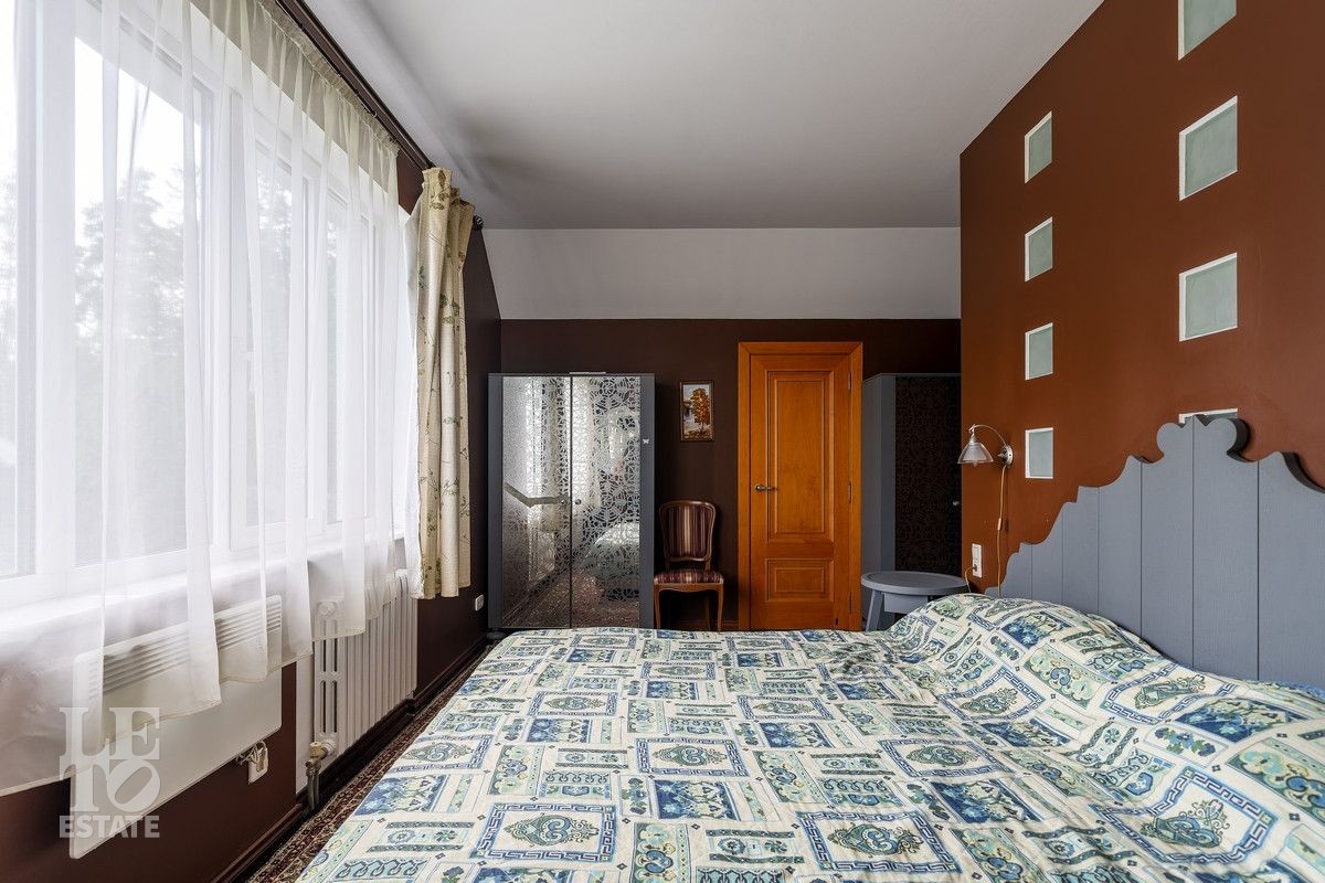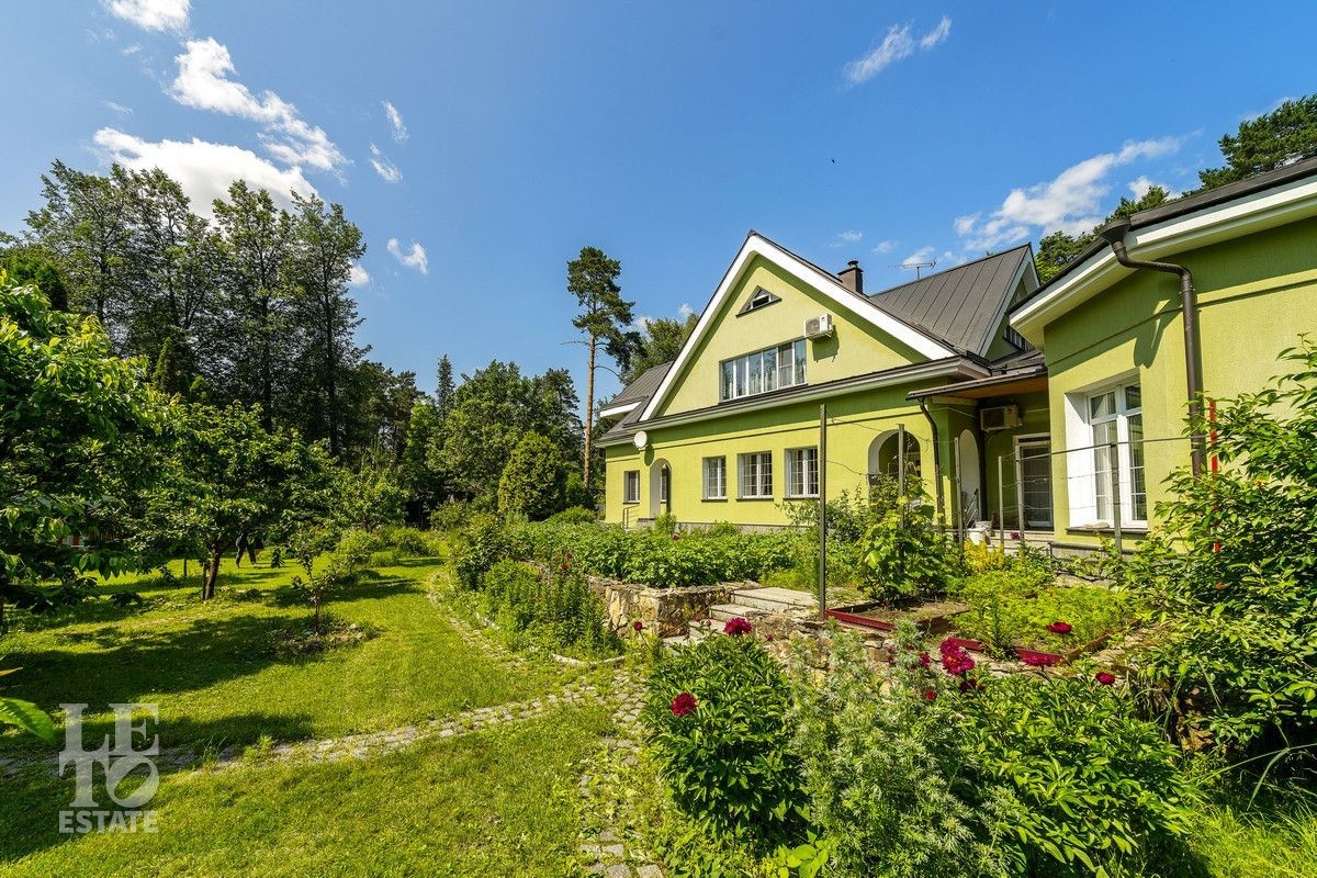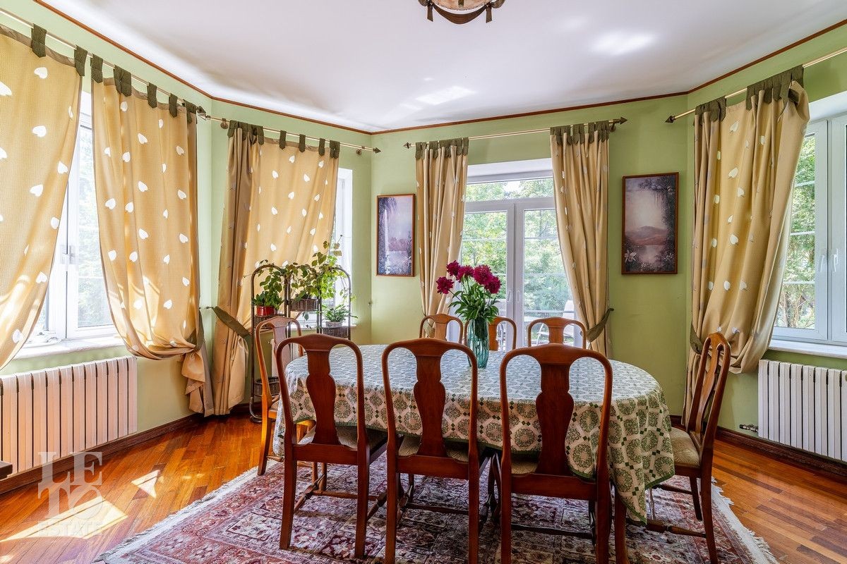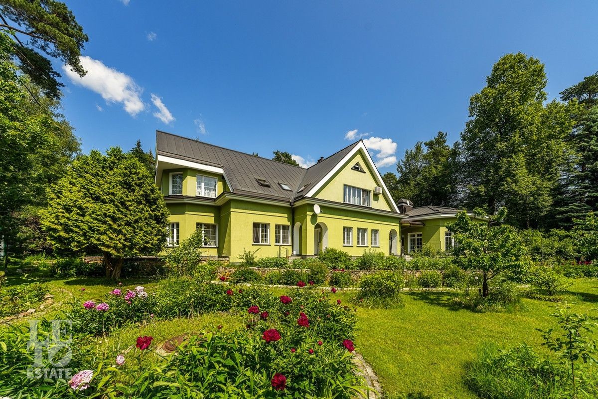 Дом «под ключ» площадью 675,8 кв. м построен в два уровня на живописном участке 26 соток и станет прекрасным местом для большой дружной семьи. В доме тщательно продумана организация пространства: семь просторных спален, две гостиные для тёплых семейных вечеров, кухня с выходом на открытую веранду, где особенно приятно проводить утро за чашкой кофе, а также кабинет для уединённой работы, очаровательный зимний сад, изолированный блок для персонала и функциональные помещения для хранения и досуга. Дом построен с соблюдением всех строительных норм и требований: фундамент — ленточный; стены первого этажа — кирпичные; в мансардной части — деревянные (брус 200×200 мм); перекрытия — железобетонные; в мансардной части — деревянные; кровля — медная. В 2021 году была проведена перепланировка и выполнены косметические работы.