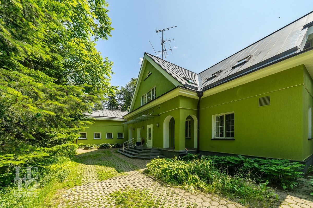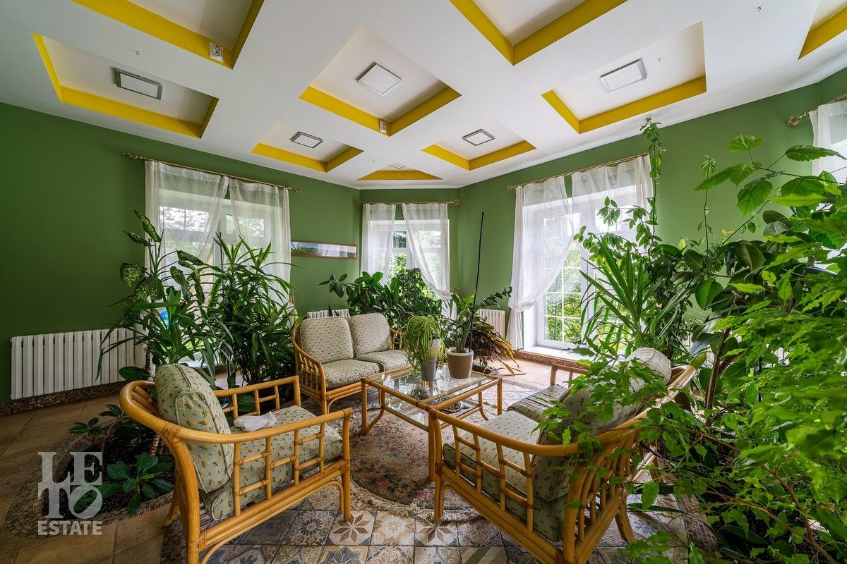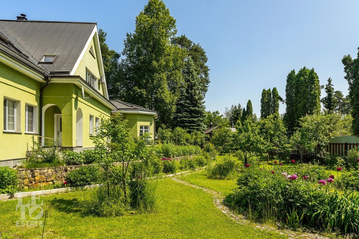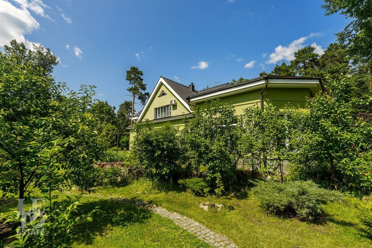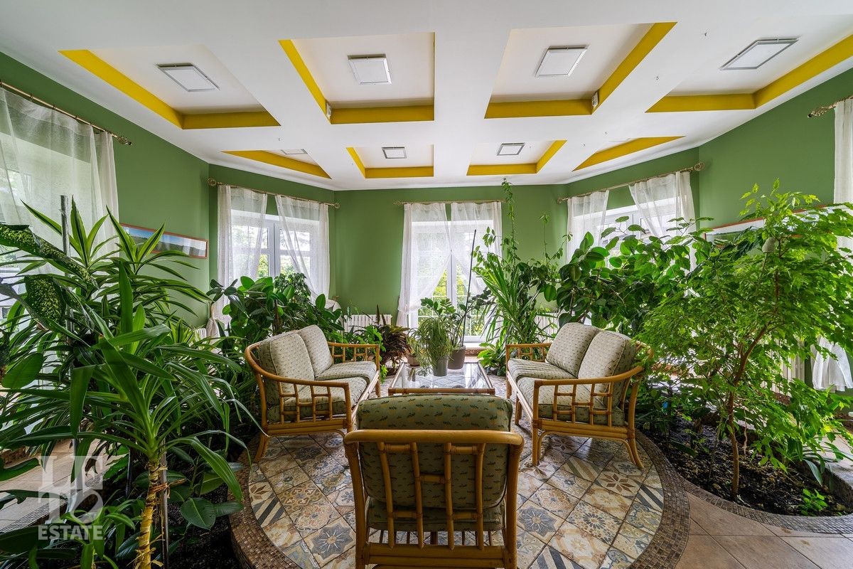 Дом «под ключ» площадью 675,8 кв. м построен в два уровня на живописном участке 26 соток и станет прекрасным местом для большой дружной семьи. В доме тщательно продумана организация пространства: семь просторных спален, две гостиные для тёплых семейных вечеров, кухня с выходом на открытую веранду, где особенно приятно проводить утро за чашкой кофе, а также кабинет для уединённой работы, очаровательный зимний сад, изолированный блок для персонала и функциональные помещения для хранения и досуга. Дом построен с соблюдением всех строительных норм и требований: фундамент — ленточный; стены первого этажа — кирпичные; в мансардной части — деревянные (брус 200×200 мм); перекрытия — железобетонные; в мансардной части — деревянные; кровля — медная. В 2021 году была проведена перепланировка и выполнены косметические работы.